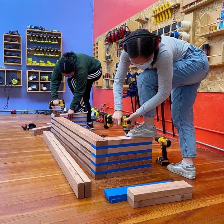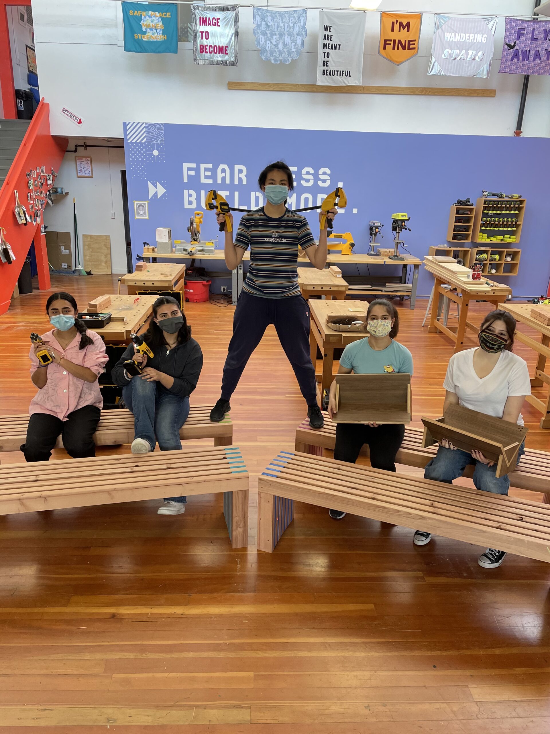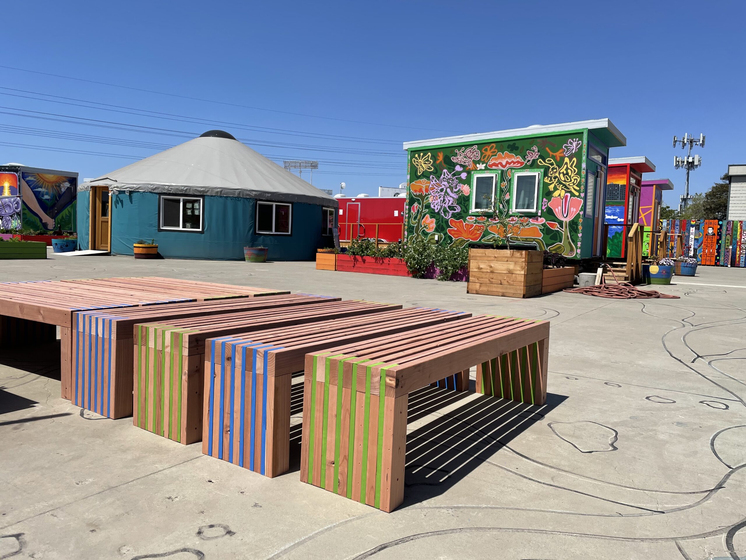 Description: In our spring session, our teen girls* and gender-expansive youth constructed 23 colorful benches for local organizations serving our unhoused communities. Initially, our goal was to create 16 benches for the Youth Spirit Artwork’s Tiny House Empowerment Village in East Oakland. But as we dropped off the benches at the Village, a nearby neighborâOperation Homebase, an RV park for older folks experiencing homelessness during the COVID-19 pandemicâasked us if we could build benches for them, too! With our May Young Women’s Design and Building Weekend Extension crew, we built 4 more benches and delivered them to Homebase. In a serendipitous twist, the benches were immediately used the next day for the organization’s 1-year anniversary BBQ! Finally, our June weekend workshop participants built 3 more benches for the unhoused residents of People’s Park in Berkeley, a local landmark of mutual aid and activism.