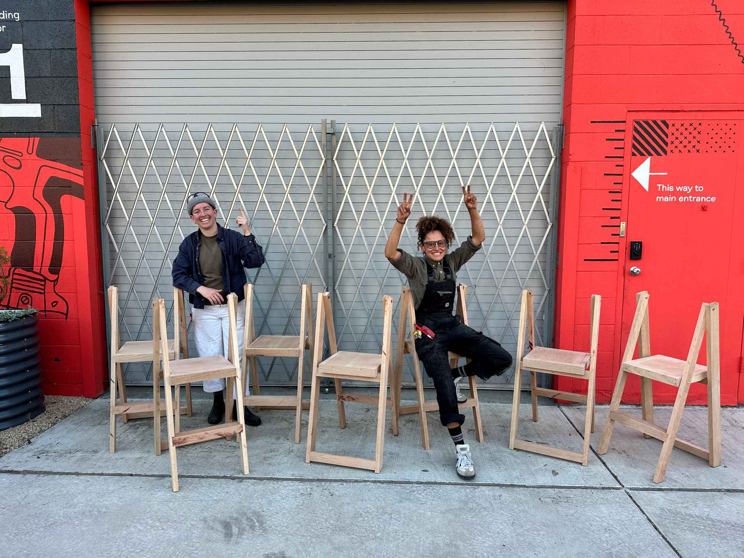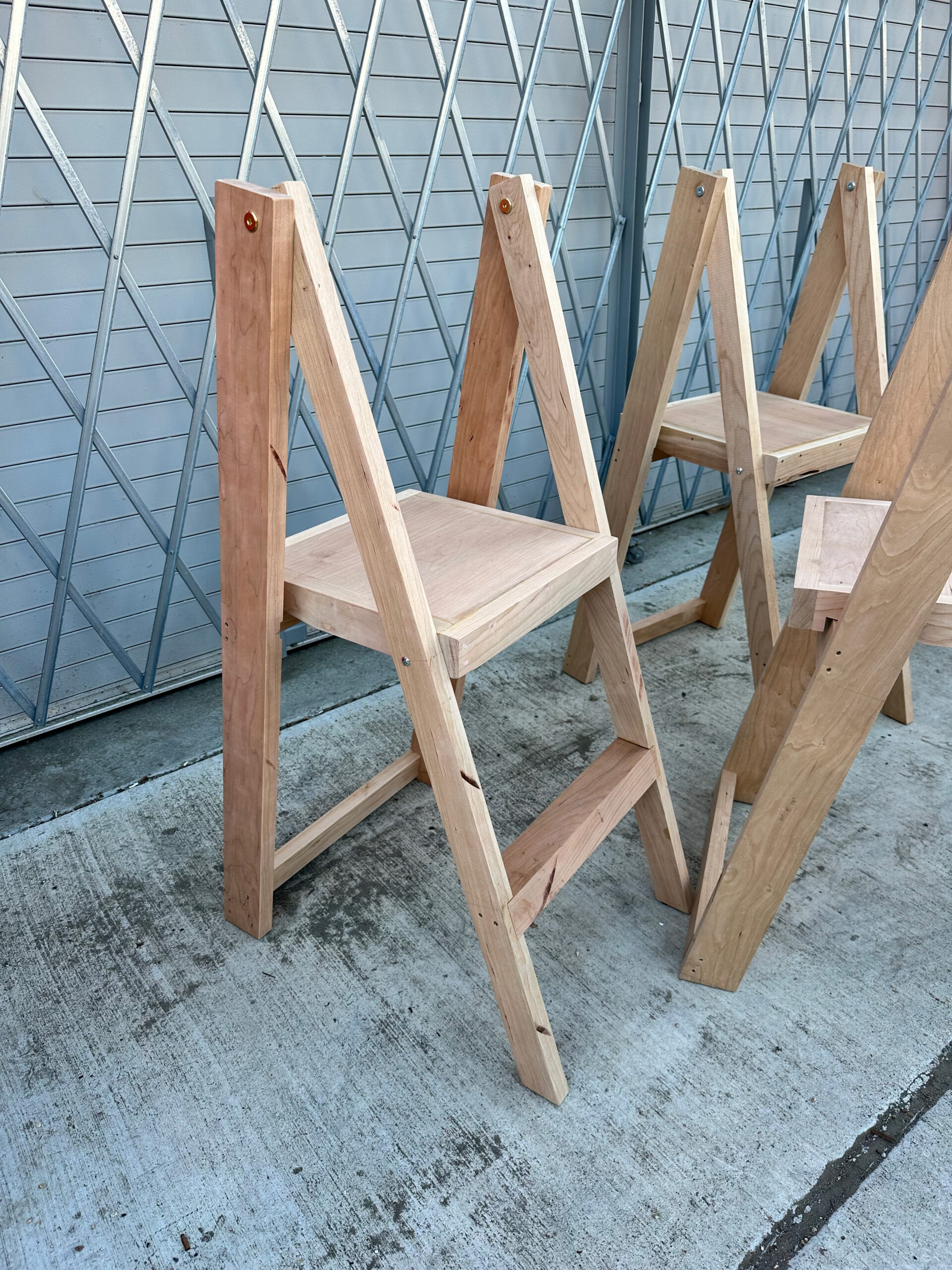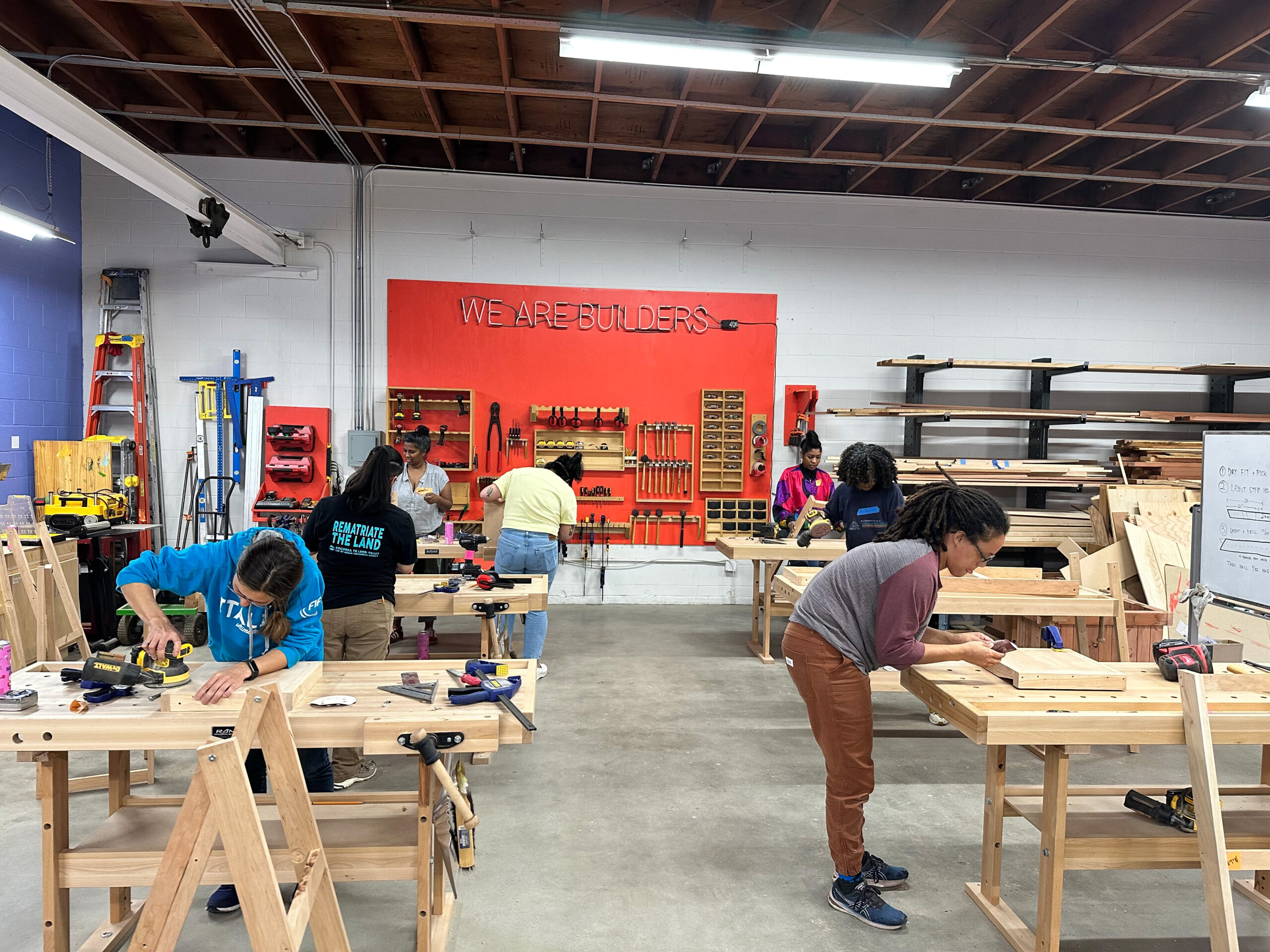 Description: In our very first adult woodworking class, instructors Augusta Sitney and Evie Ortiz taught 7 women and non-binary adults how to use basic power tools, like the chop saw, impact drill and driver, to build a collapsible hardwood step-stool in just 4 weeks. The project was deceptively simple (as many are) but in reality required precision in cutting lumber to size and using a speed square to measure for right angles. Almost none of the adult students had ever used these tools, and while it was nerve-wracking to begin, they quickly found a comfort and rhythm in the wood shop. Over the weeks, the students and instructors got to know each other and bonded together, even going out for a celebratory dinner after the final class!