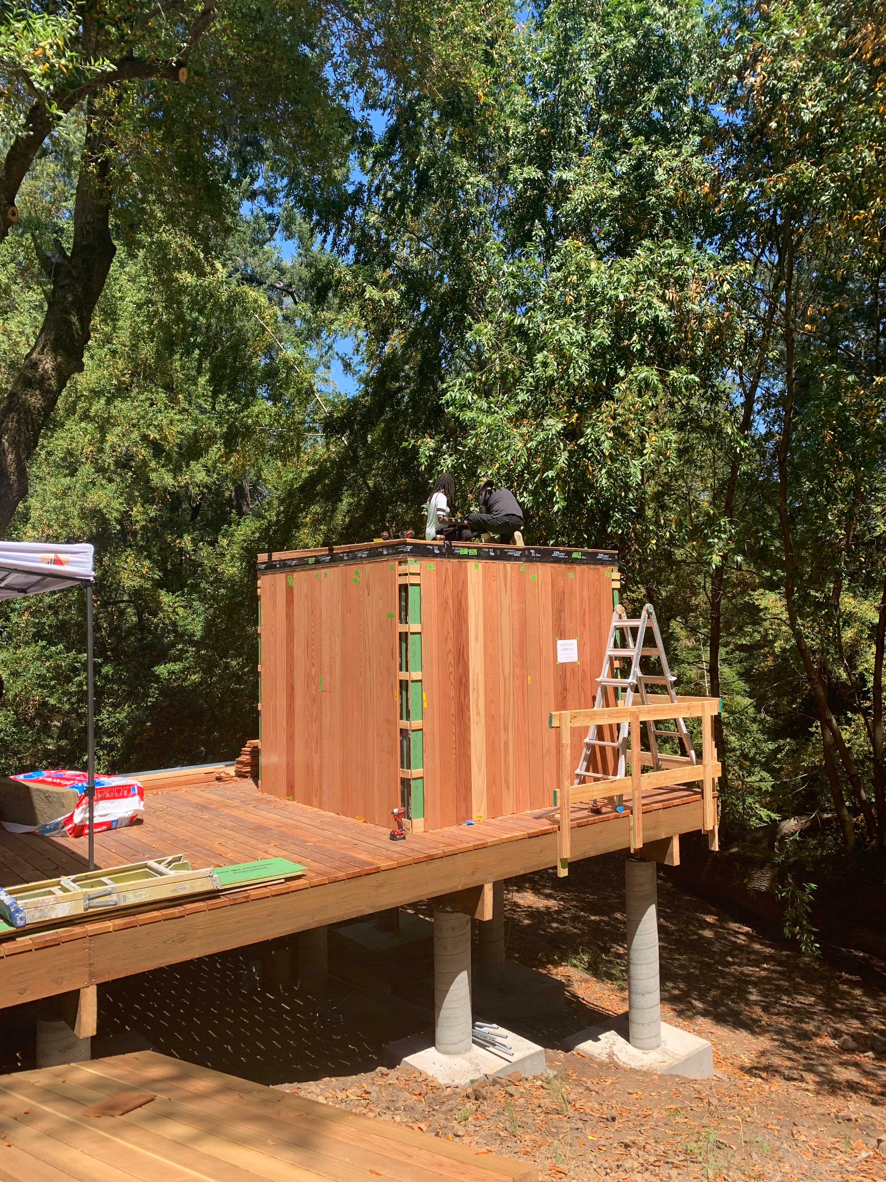 Due to the immense scale and precision of the project, it was worked on by both the Young Women’s Design + Building Institute and Advanced Design/Build cohorts for an epic cross-collaboration! Architecture instructor Tonia Sing Chi drew up the plans for the sauna (her first ever!), and Emily Pilloton-Lam and Augusta Sitney worked for months researching how to build a cedar sauna that met accessibility requirements. By the time summer programs started, we hit the ground running—nay, sprinting! Our YWDBI students framed and assembled the wall panels with a 1/16″ tolerance and installed insulation, furring strips, and interior cedar tongue and groove siding, as well as building the interior benches out of clear cedar (no knots!). Our instructors then tackled prepping the roof panels, a process that included framing and blocking, installing the vapor barrier and furring strips, and putting on the cedar panels. In total, the wall panels each had 7 layers of materials!