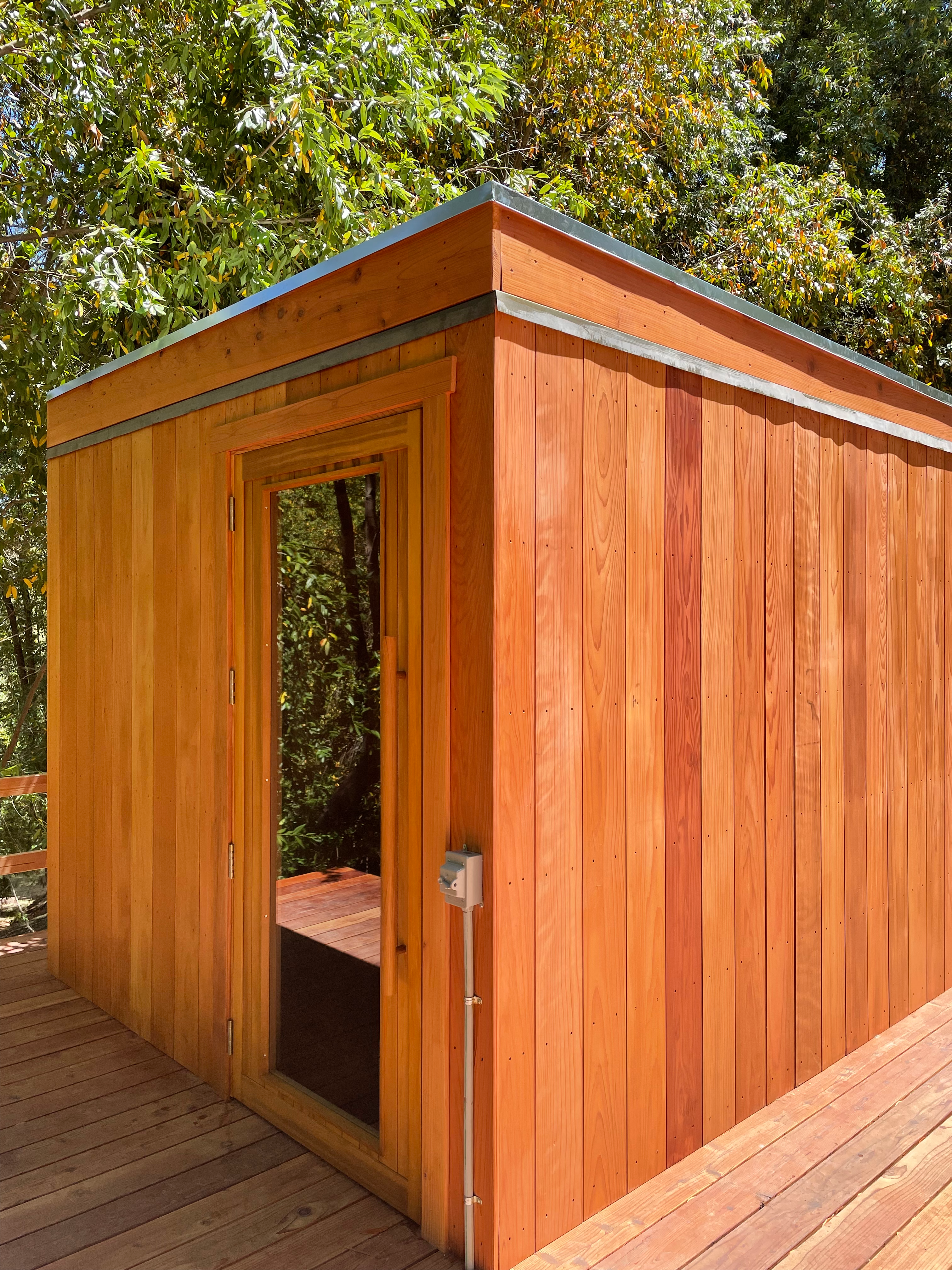 Materials: Ship-lap redwood siding, redwood 2×4 and 2×6, cedar 2×4 and tongue and groove 1×4 siding, Douglas fir 2×4 framing, ZIP system sheathing, drip-edge flashing, Rock Wool insulation, furring strips, vapor barrier, TPO roofing membrane, sauna door and window with 1/4″ tempered glass, IKI sauna heater