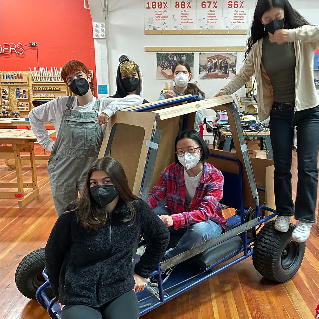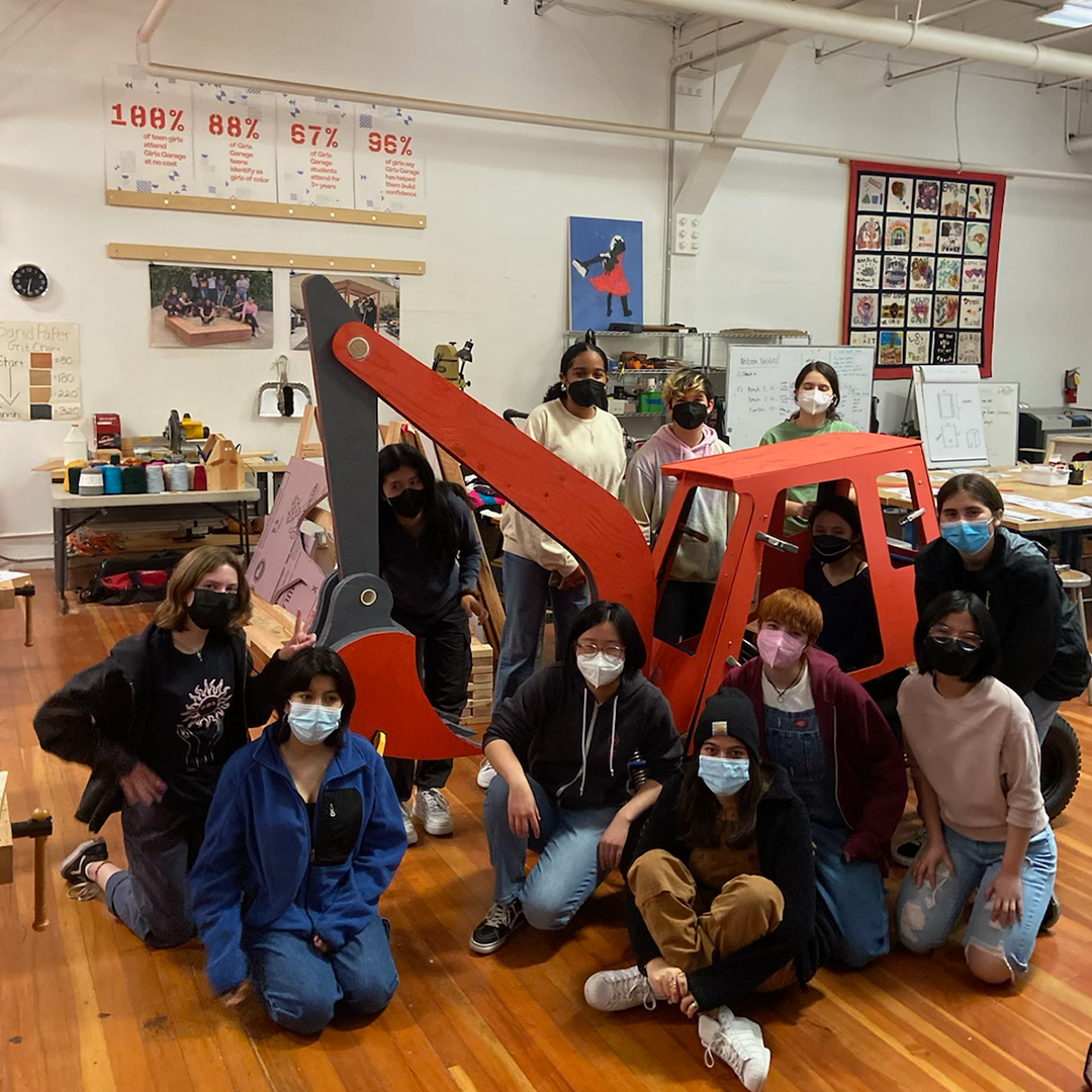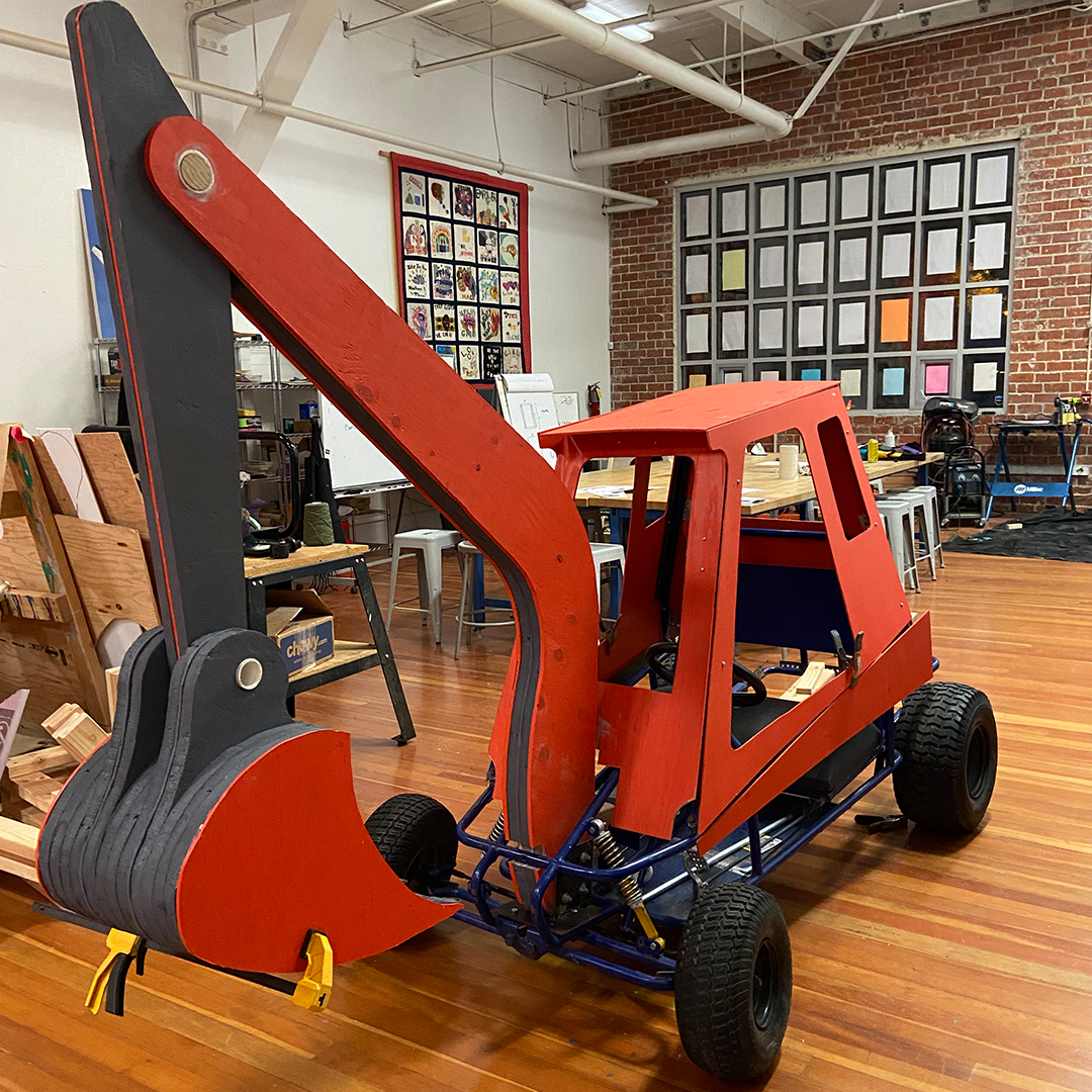 Description: In our winter session of Construction + Community, our students built the wooden exterior frame for the inaugural Girls Garage derby car! We were invited to build and race a car in the legendary SFMOMA Soapbox Derby, which is back after a 40+ year hiatus! Instructors Emily Pilloton-Lam and Augusta Sitney purchased a repurposed go-kart frame, and Augusta quickly swapped her trademark beanie for her (figurative) mechanic hat as she set about removing the engine, rebuilding the brakes and steering mechanisms, and welding steel brackets. Our students made cardboard templates for each side of the derby car, then cut out the respective plywood pieces. For the claw, our team drastically scaled up a PDF plan of a toy excavator, which we then printed at full scales and traced onto insulation foam and wood to build into layers. Finally, we added joints onto each of the arm points and installed a rod that raises the claw, just like an actual excavator!