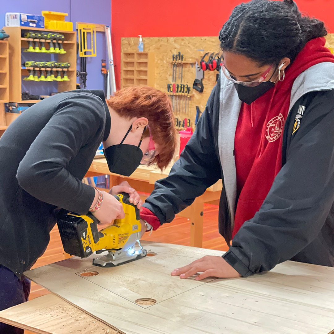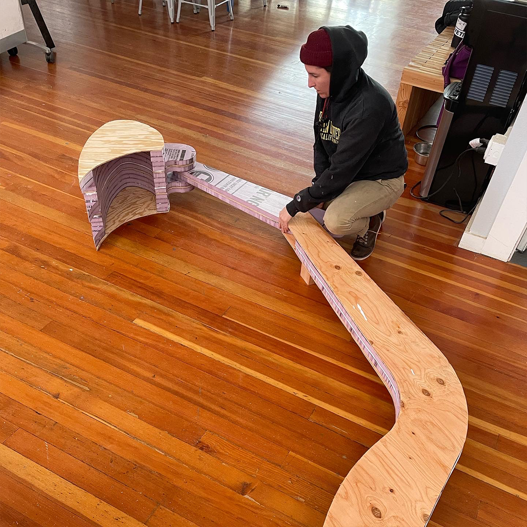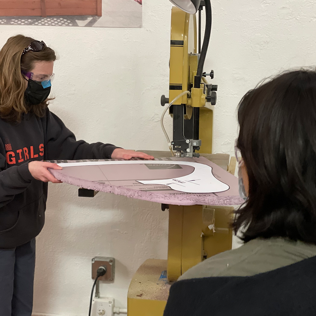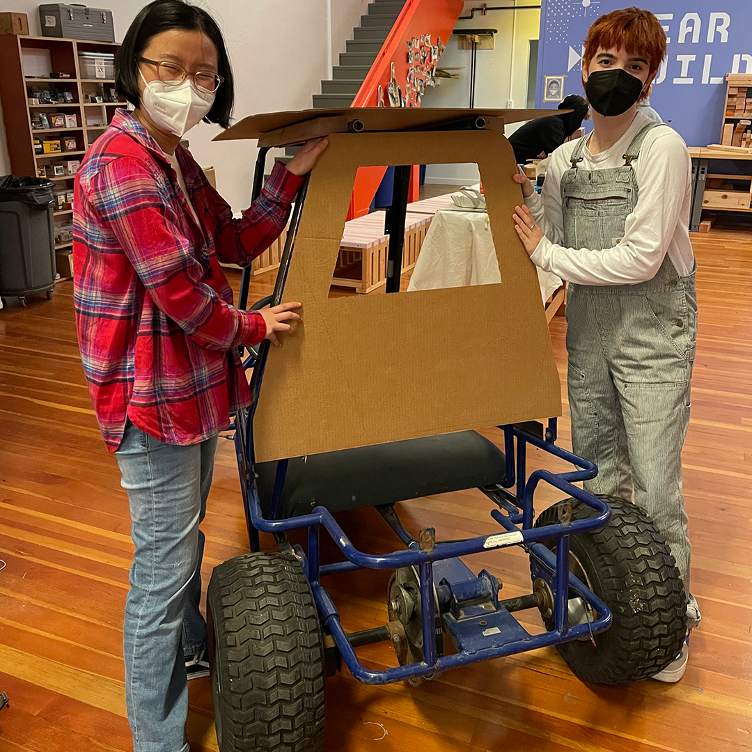 Description: In our winter session of Construction + Community, our students built the wooden exterior frame for the inaugural Girls Garage derby car! We were invited to build and race a car in the legendary SFMOMA Soapbox Derby, which is back after a 40+ year hiatus! Instructors Emily Pilloton-Lam and Augusta Sitney purchased a repurposed go-kart frame, and Augusta quickly swapped her trademark beanie for her (figurative) mechanic hat as she set about removing the engine, rebuilding the brakes and steering mechanisms, and welding steel brackets. Our students made cardboard templates for each side of the derby car, then cut out the respective plywood pieces. For the claw, our team drastically scaled up a PDF plan of a toy excavator, which we then printed at full scales and traced onto insulation foam and wood to build into layers. Finally, we added joints onto each of the arm points and installed a rod that raises the claw, just like an actual excavator!