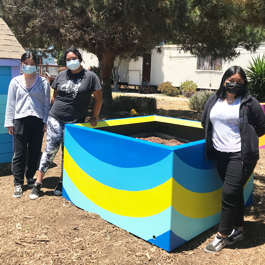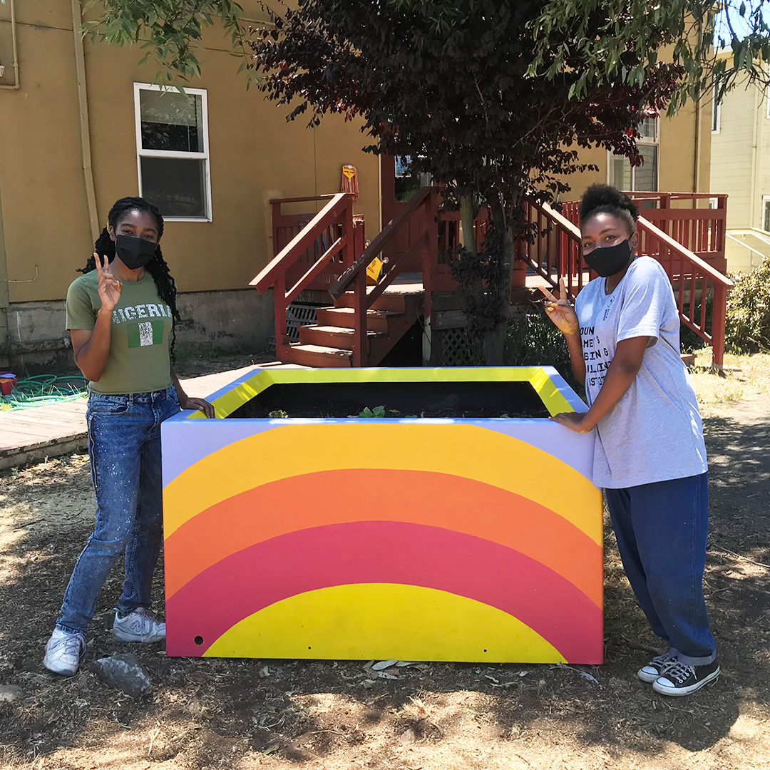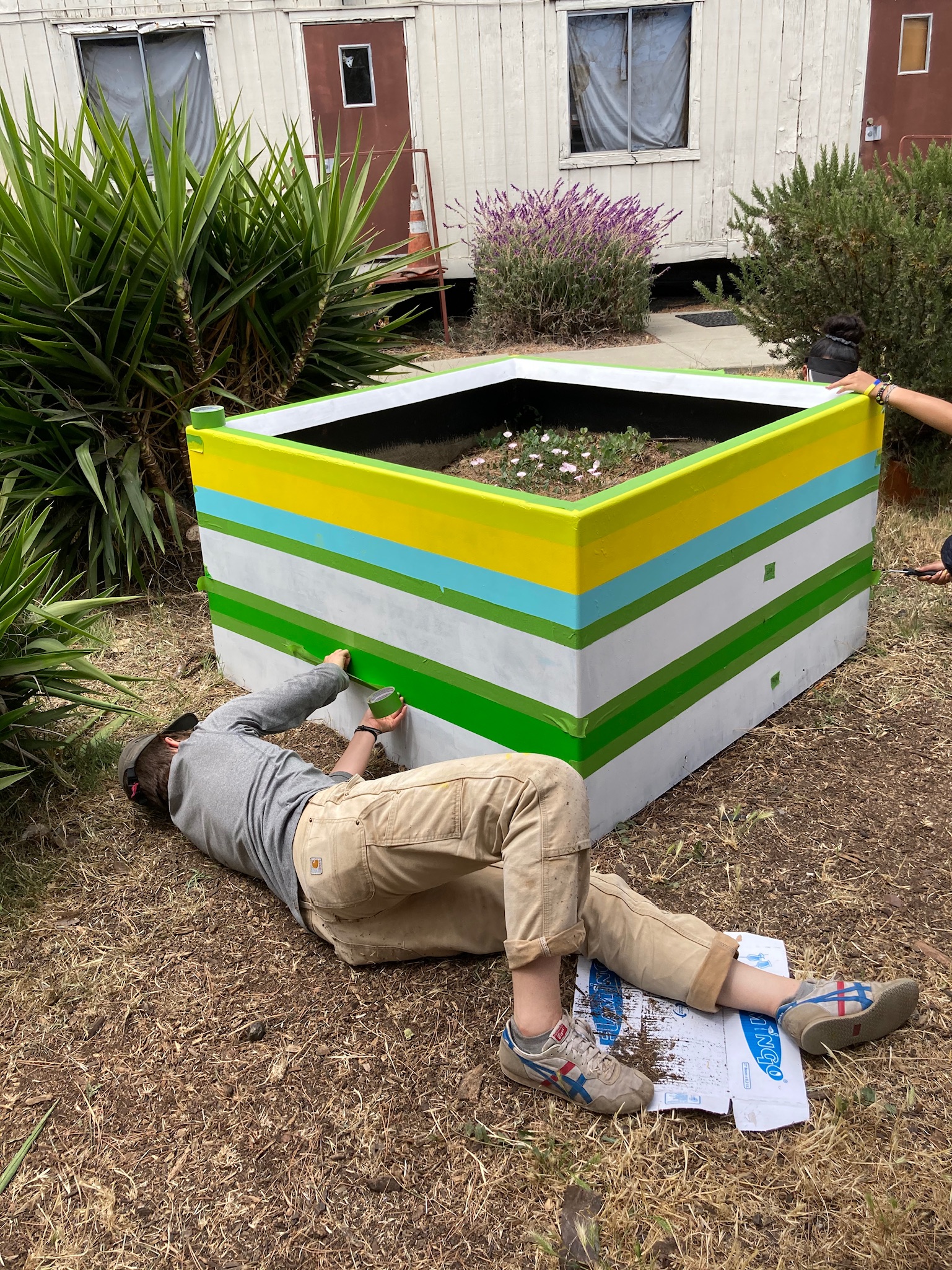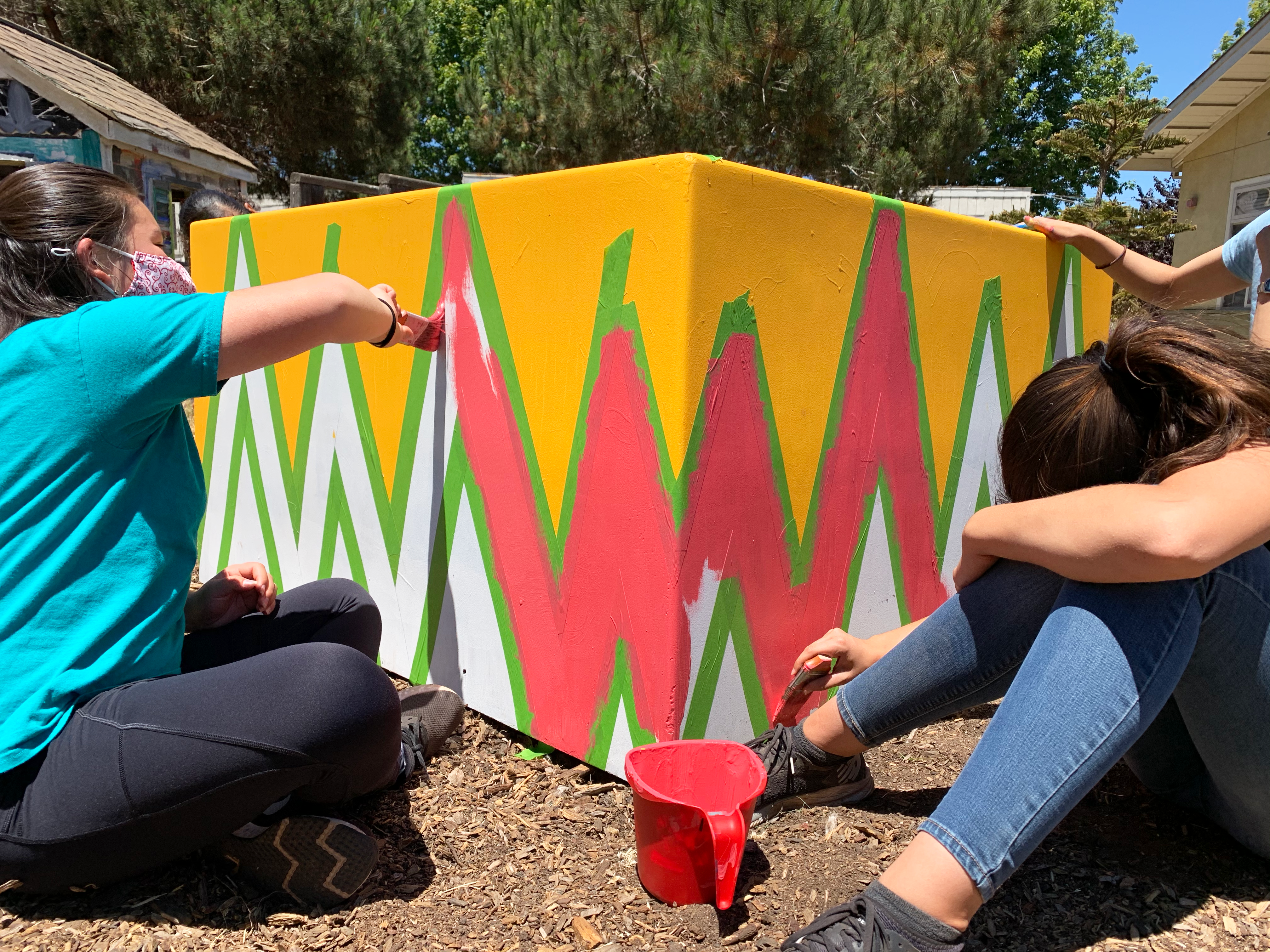 Description: Over the course of 2 weeks in our Young Women’s Design + Building Institute, 29 teen girls and gender-expansive youth painted 6 vibrant murals in the garden space at the Ursula Sherman Village, a transitional housing shelter run by our community client, BOSS (Building Opportunities for Self-Sufficiency). Inspired by the bright colors and simple shapes (which we’ve seen Project Color Corps use beautifully!), our arts instructor HyeYoon Song designed the 6 graphics based on the elements plants (and humans) need to thrive: sun, soil, air, water, nutrition, and love. Our staff printed the graphics full scale to make stencils and also mapped key points onto the garden boxes using a coordinate plane. After the boxes were primed and prepped, our teen artists worked in small groups alongside HyeYoon and arts instructor Maya Vilaplana to tape off and paint them according to appropriate design. Using a mixture of medium-sized paintbrushes (with their handles cut off for better precision!), small rollers, and tiny watercolor brushes, our teens laid down bright fields of color onto the fiberglass garden boxes, taking care to paint within the boundaries of the tape and to touch up any mistakes.