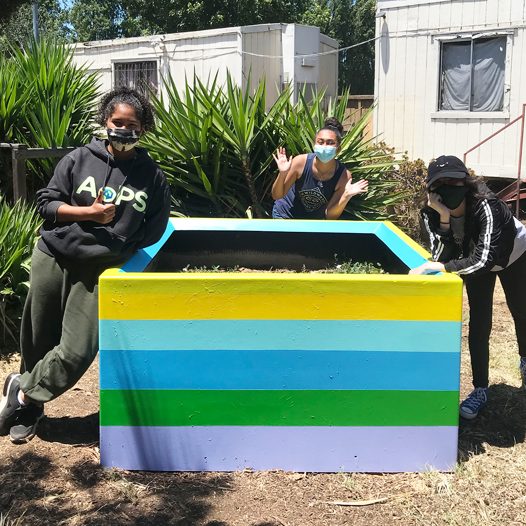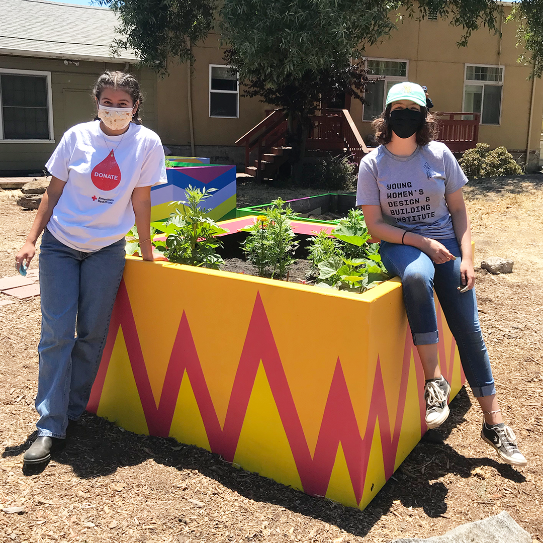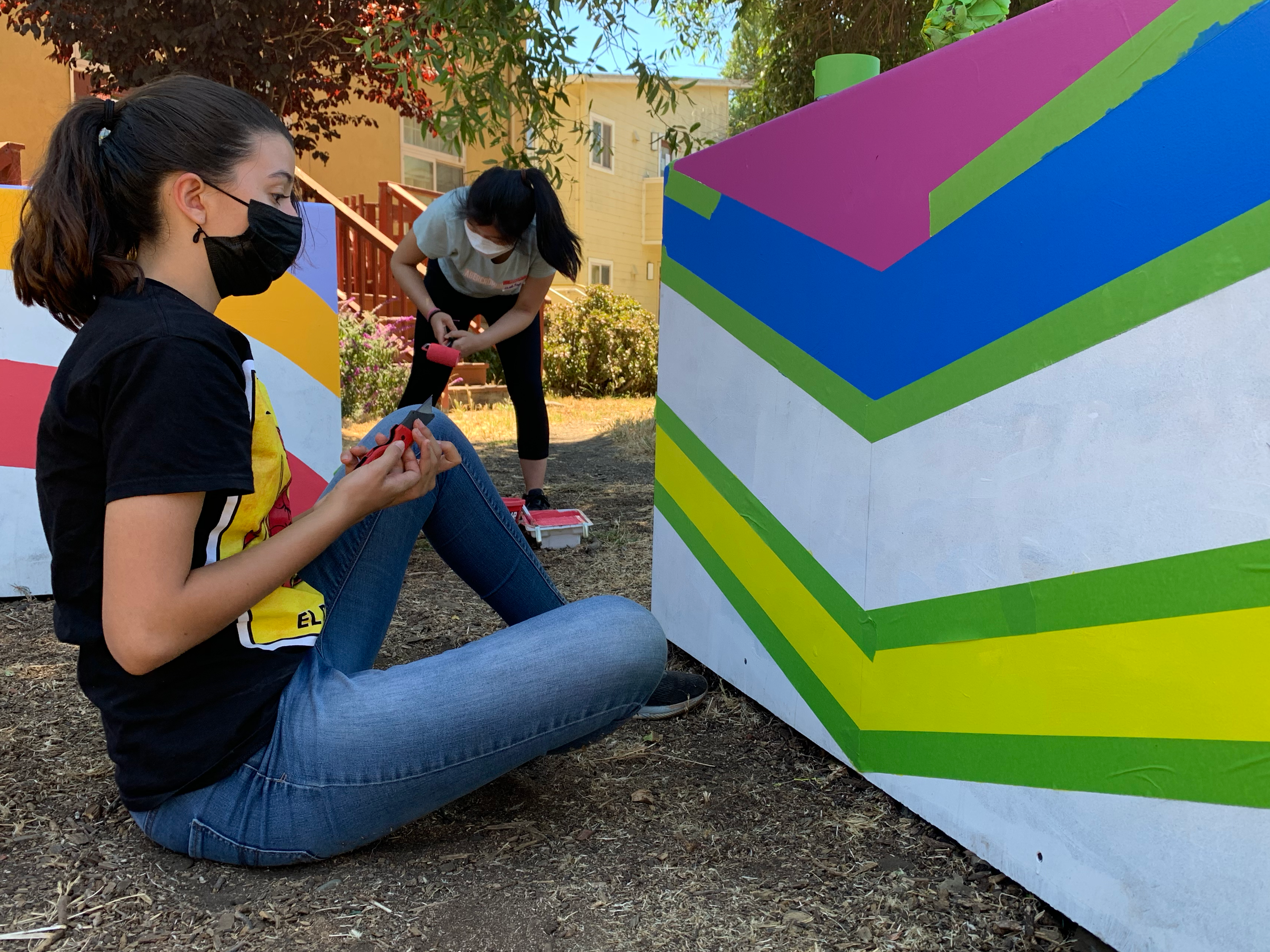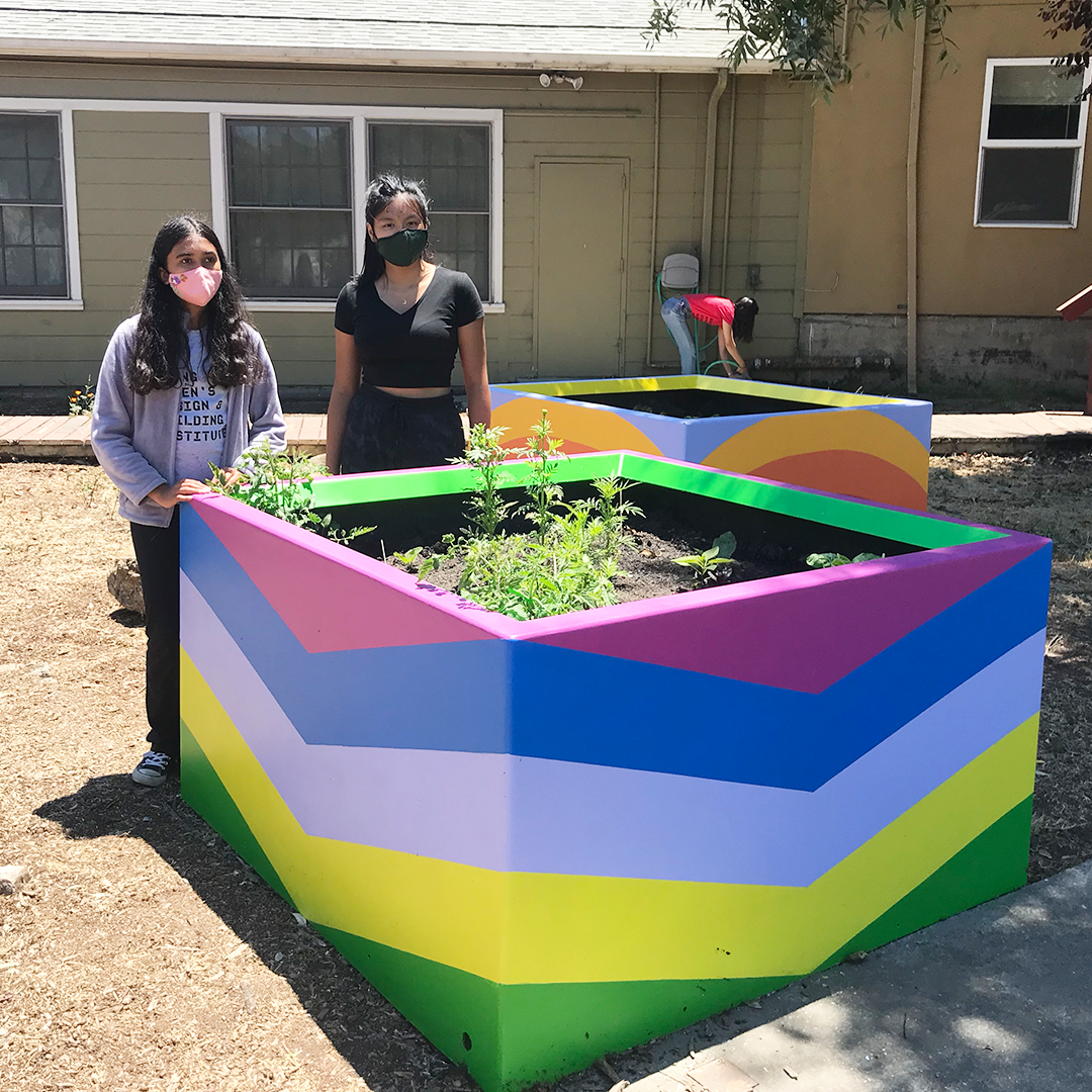 Description: Over the course of 2 weeks in our Young Women’s Design + Building Institute, 29 teen girls and gender-expansive youth painted 6 vibrant murals in the garden space at the Ursula Sherman Village, a transitional housing shelter run by our community client, BOSS (Building Opportunities for Self-Sufficiency). Inspired by the bright colors and simple shapes (which we’ve seen Project Color Corps use beautifully!), our arts instructor HyeYoon Song designed the 6 graphics based on the elements plants (and humans) need to thrive: sun, soil, air, water, nutrition, and love. Our staff printed the graphics full scale to make stencils and also mapped key points onto the garden boxes using a coordinate plane. After the boxes were primed and prepped, our teen artists worked in small groups alongside HyeYoon and arts instructor Maya Vilaplana to tape off and paint them according to appropriate design. Using a mixture of medium-sized paintbrushes (with their handles cut off for better precision!), small rollers, and tiny watercolor brushes, our teens laid down bright fields of color onto the fiberglass garden boxes, taking care to paint within the boundaries of the tape and to touch up any mistakes.
