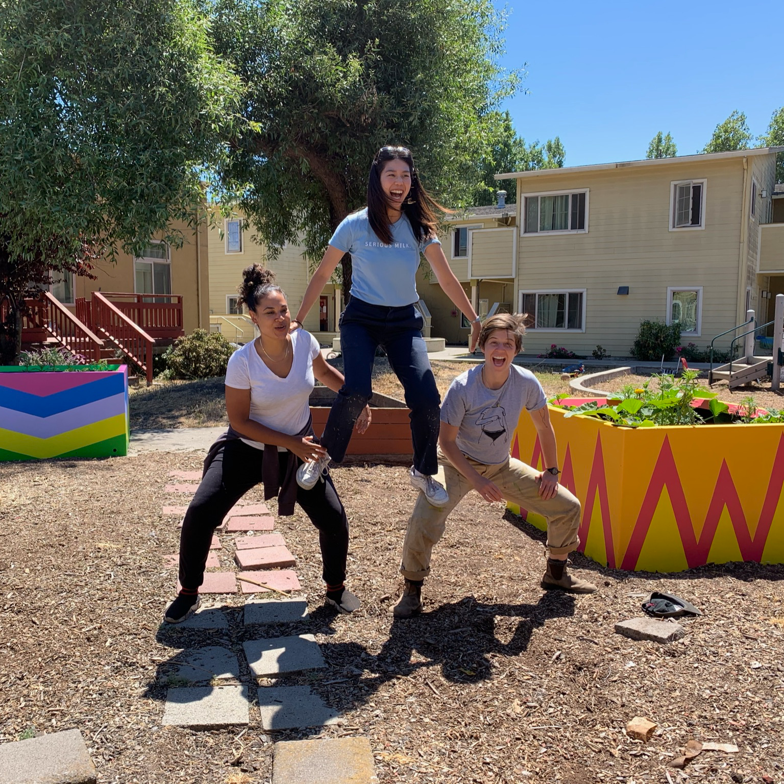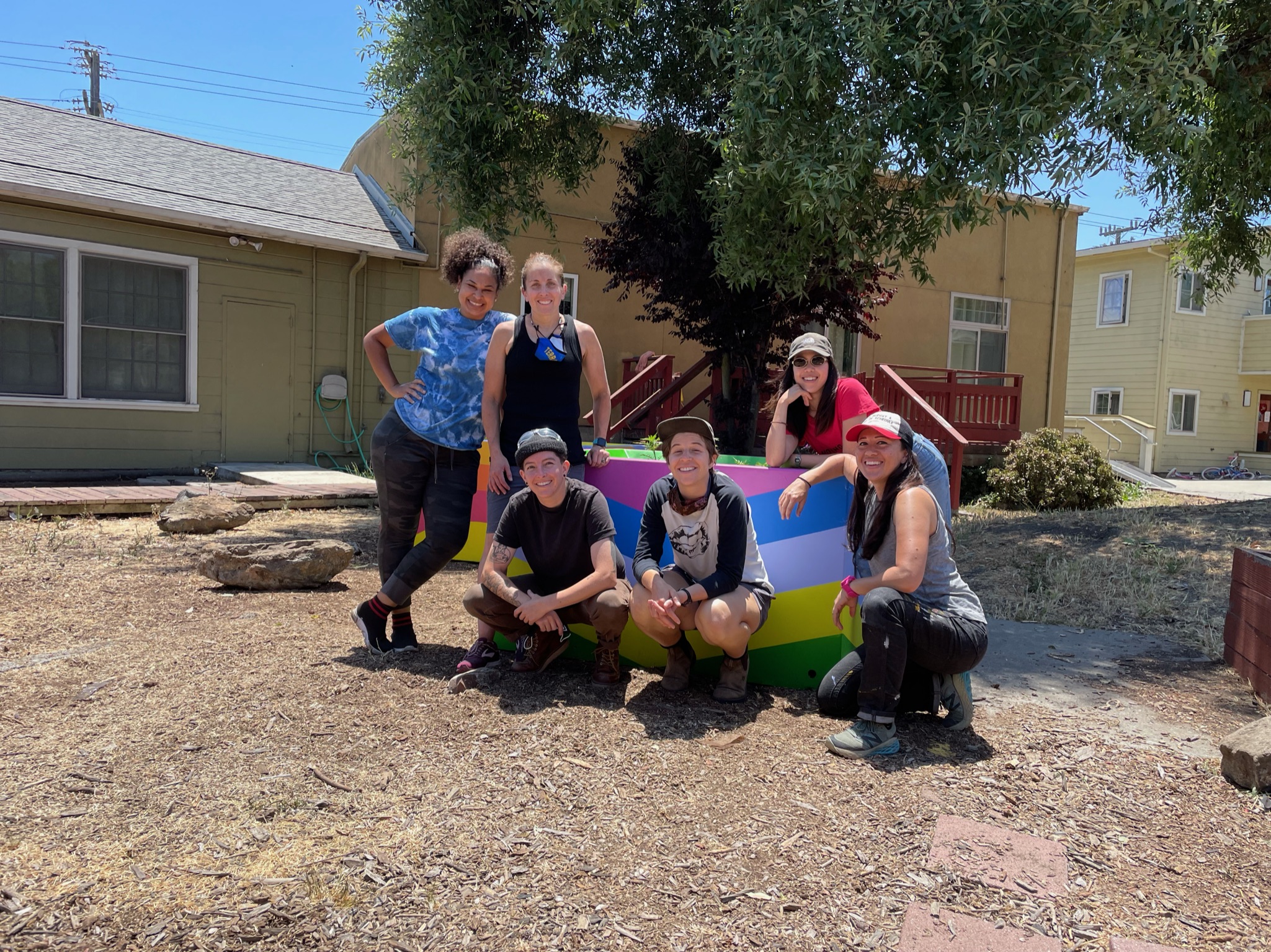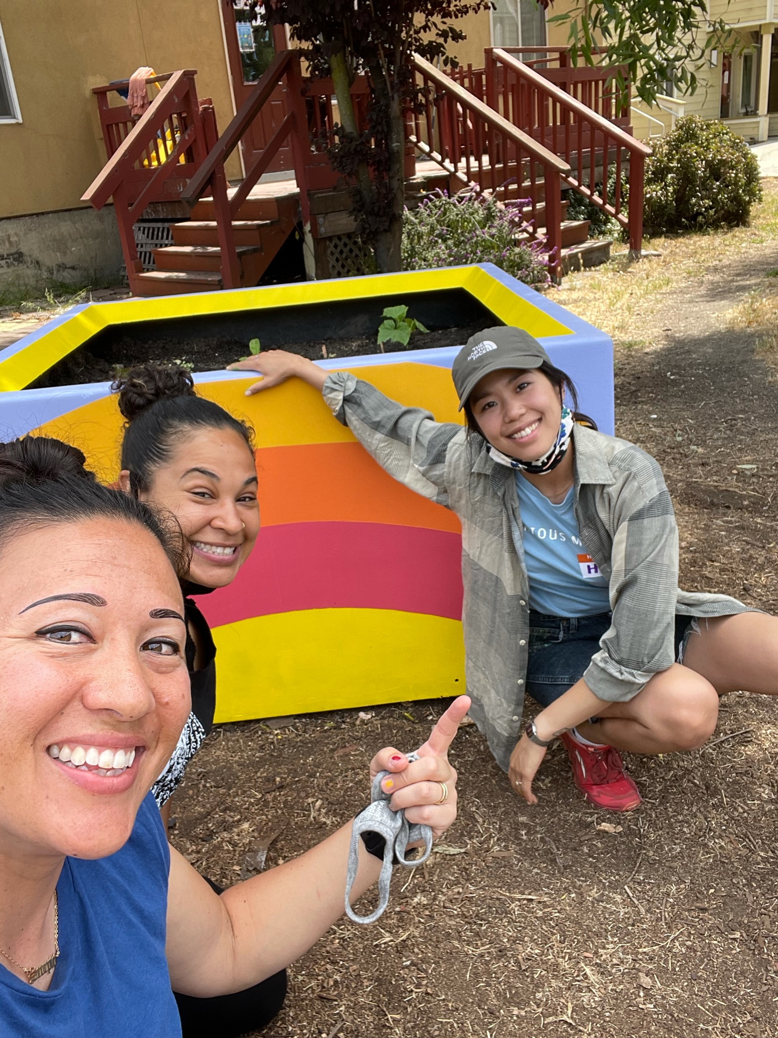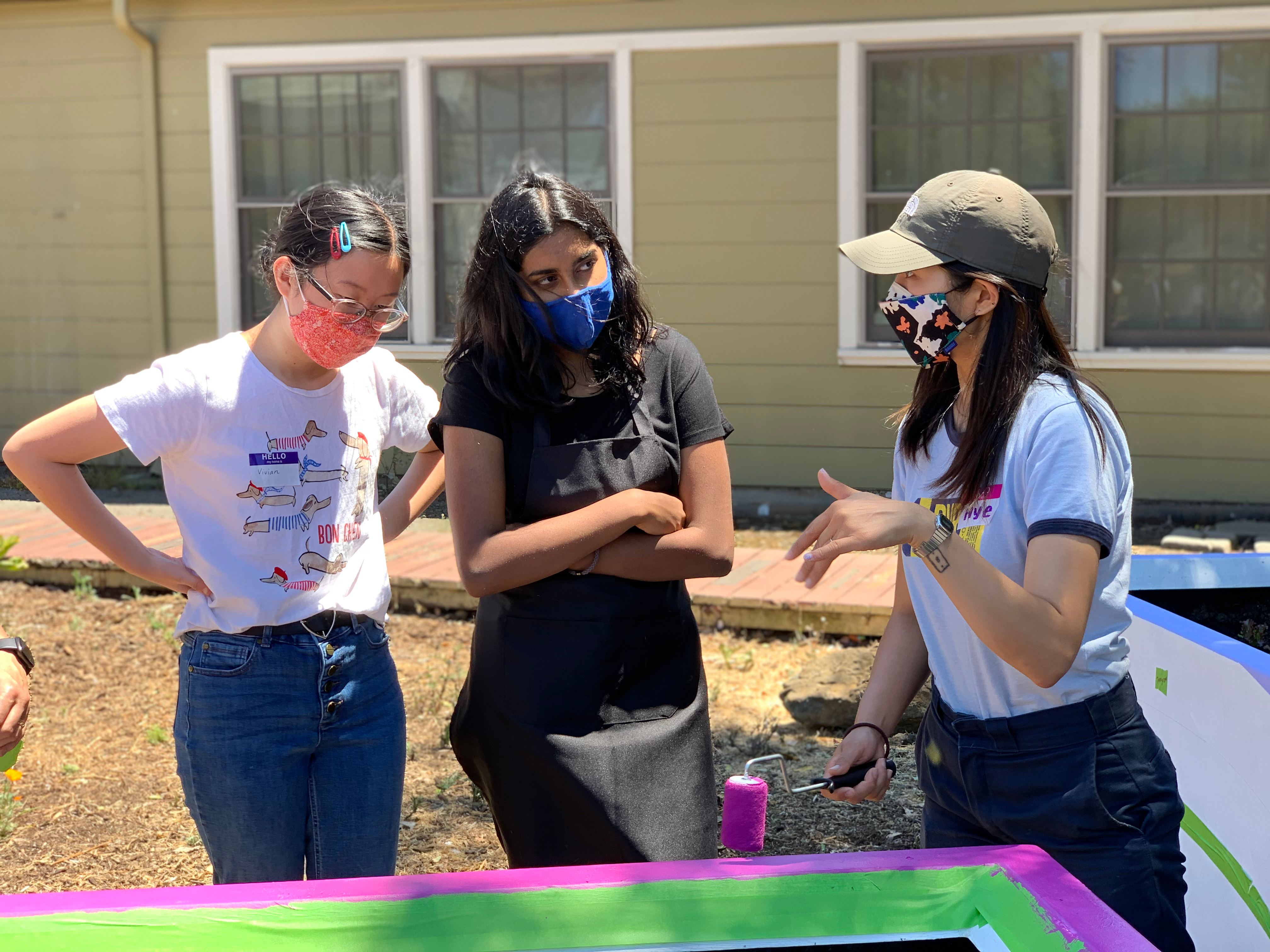 Description: Over the course of 2 weeks in our Young Women’s Design + Building Institute, 29 teen girls and gender-expansive youth painted 6 vibrant murals in the garden space at the Ursula Sherman Village, a transitional housing shelter run by our community client, BOSS (Building Opportunities for Self-Sufficiency). Inspired by the bright colors and simple shapes (which we’ve seen Project Color Corps use beautifully!), our arts instructor HyeYoon Song designed the 6 graphics based on the elements plants (and humans) need to thrive: sun, soil, air, water, nutrition, and love. Our staff printed the graphics full scale to make stencils and also mapped key points onto the garden boxes using a coordinate plane. After the boxes were primed and prepped, our teen artists worked in small groups alongside HyeYoon and arts instructor Maya Vilaplana to tape off and paint them according to appropriate design. Using a mixture of medium-sized paintbrushes (with their handles cut off for better precision!), small rollers, and tiny watercolor brushes, our teens laid down bright fields of color onto the fiberglass garden boxes, taking care to paint within the boundaries of the tape and to touch up any mistakes.