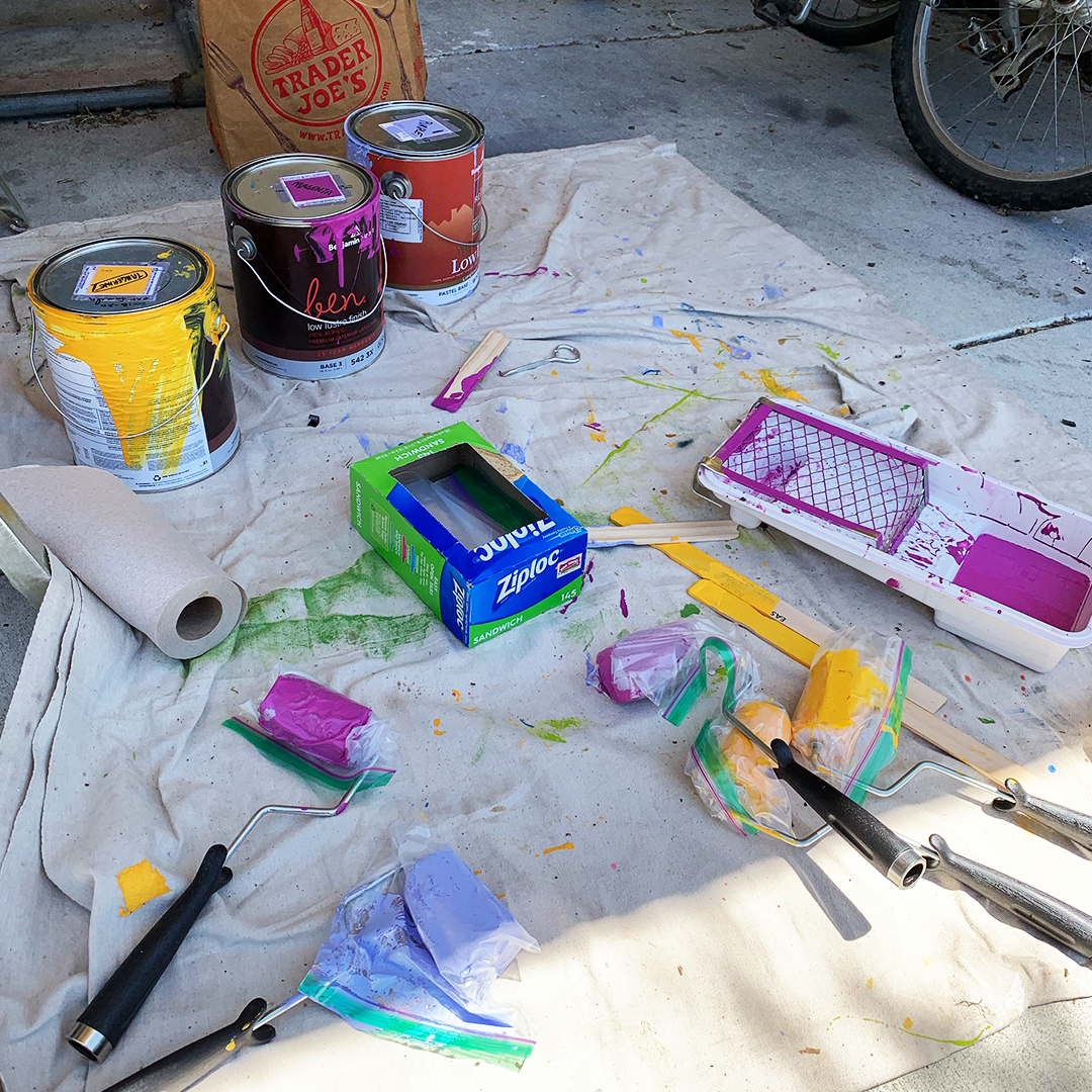 Materials: Exterior paint, primer, cardboard stencils, Frog brand tape, rags and paper towels, paintbrushes (with handles cut off!), utility knife, drop cloth, paint trays, rollers, paint cups.