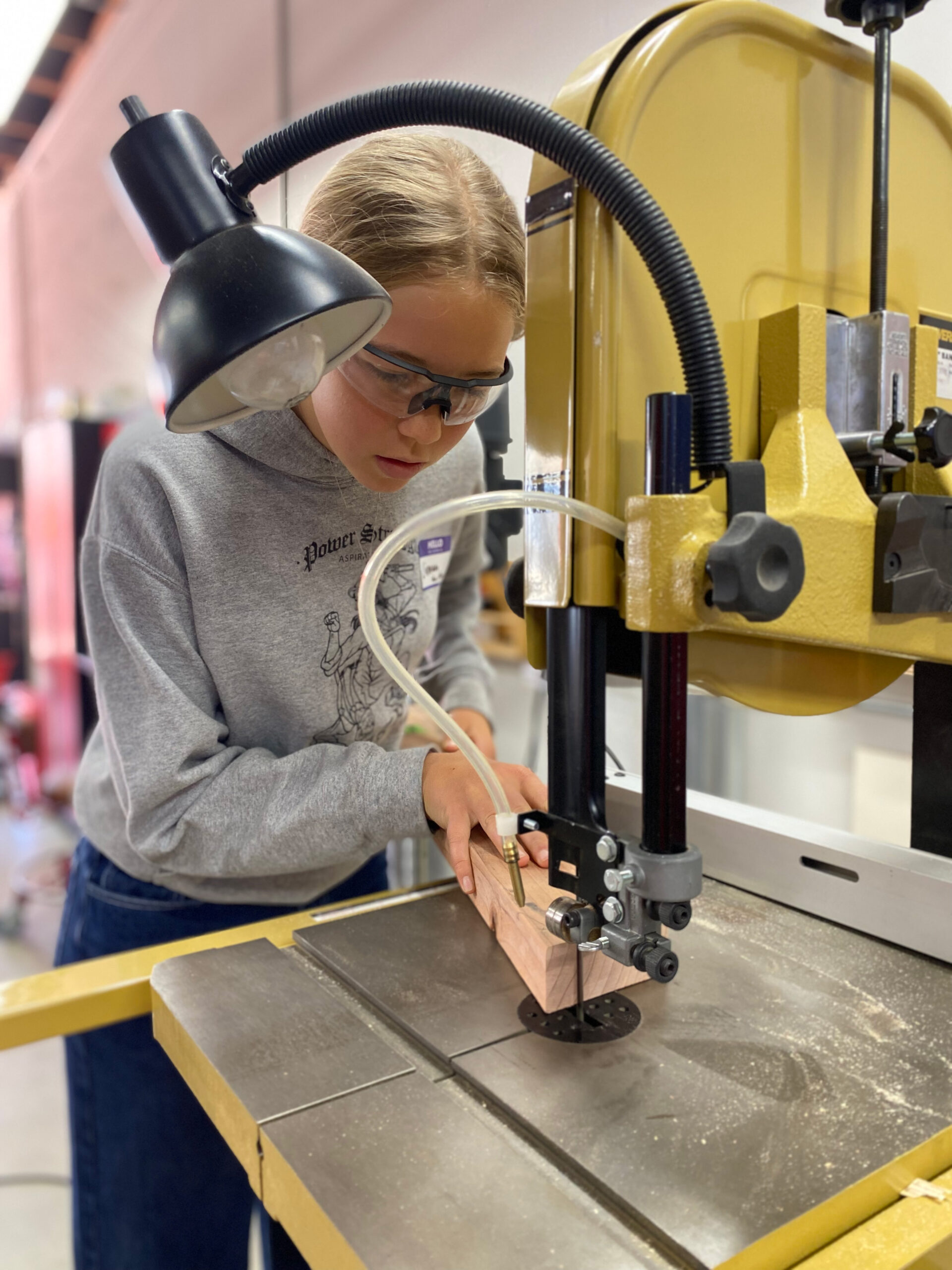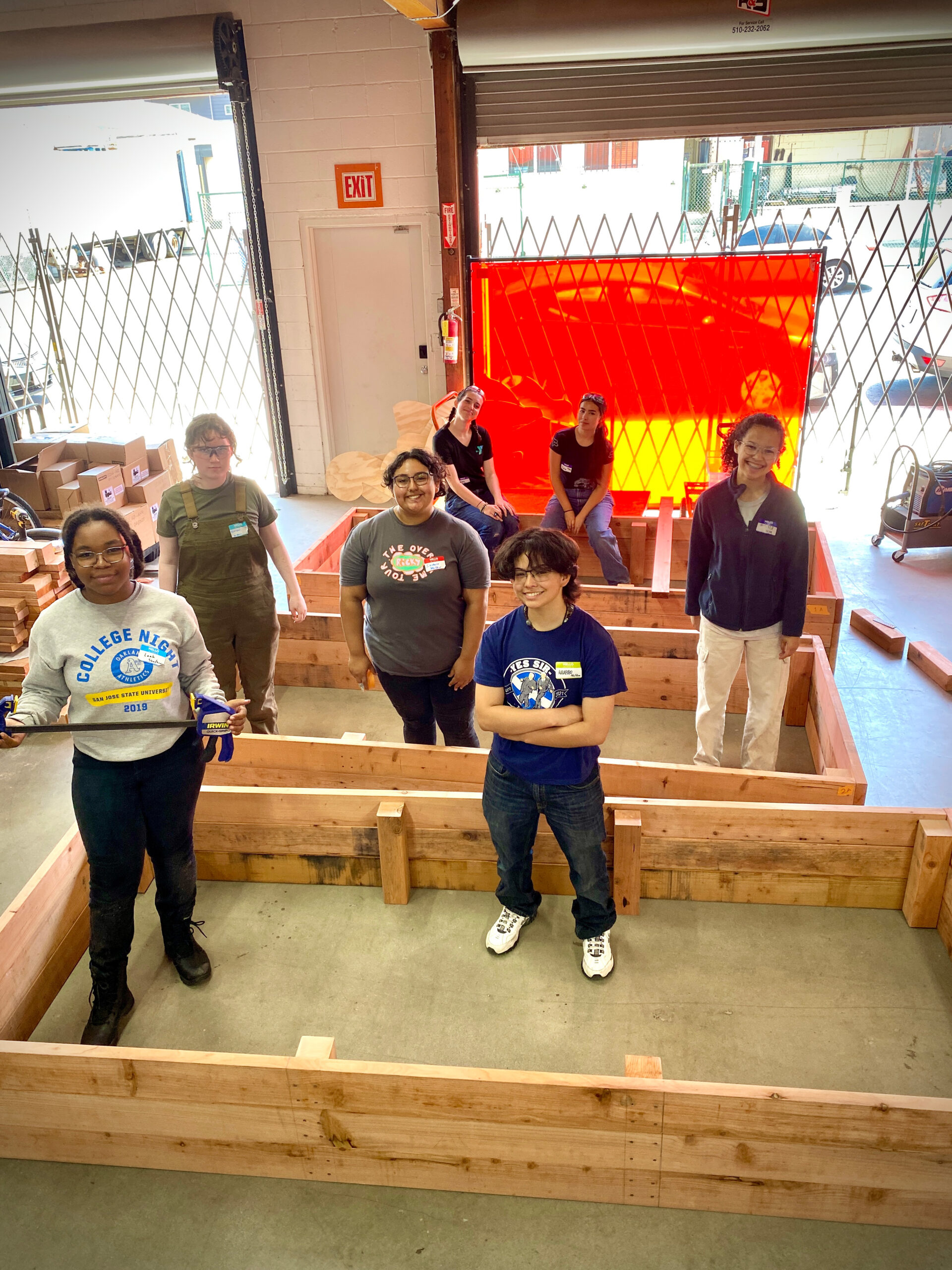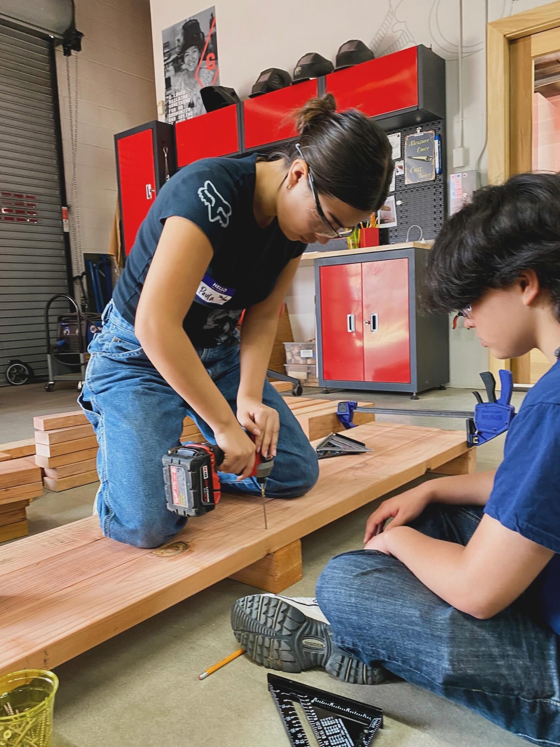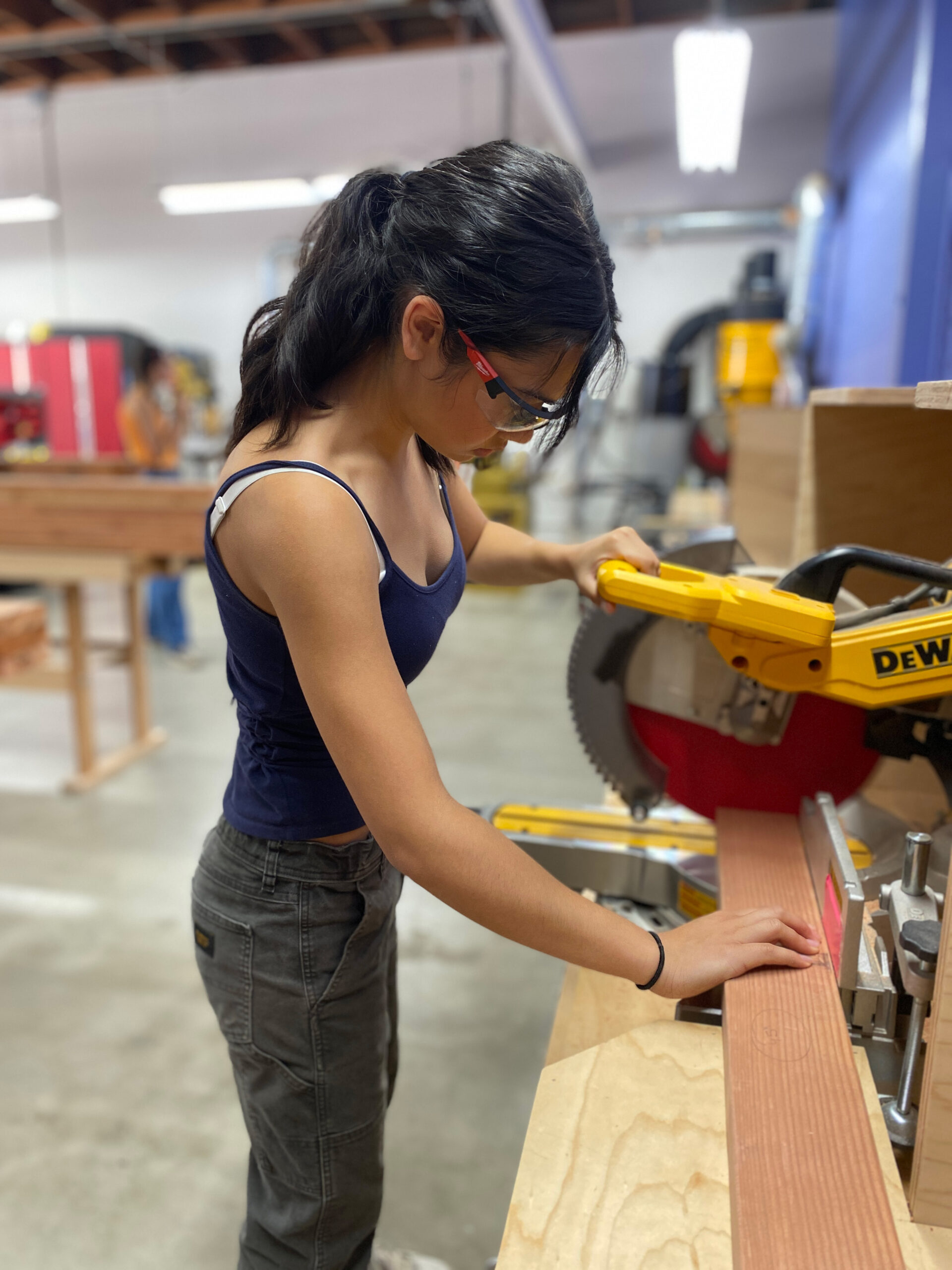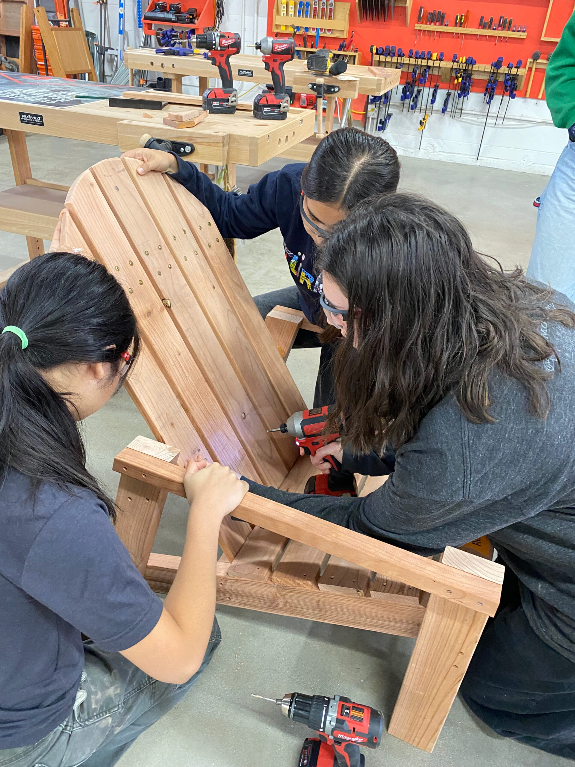 Description: In this summer’s 2-week session of Young Women’s Design + Building Institute, our high school students built 12 planter boxes and 8 Adirondack chairs for our nonprofit client Petaluma Bounty. These planter boxes and Adirondack chairs will be part of La Tercera Community Garden, a Petaluma Bounty-run public garden in East Petaluma. After years of neglect, this particular garden is getting a Girls Garage “glow-up” with brand new 4×10 planter boxes and Adirondack chairs for when community members need to take a break or eat a snack in the shade. Building the planter boxes was an excellent warm-up for our high school students to learn how to measure, cut, and assemble lumber, using power tools like the chop saw, drill and impact driver as well as speed squares and bar clamps. Once the planters were assembled, the students split into small groups to tackle the Adirondack chairs, a construction project that was more complex and included using both the band saw and the jig saw. By the end of the week, instructor Augusta Sitney even challenged the students to design foot rests for the chairs without any plans or oversight, and the teenage builders rose to the occasion!