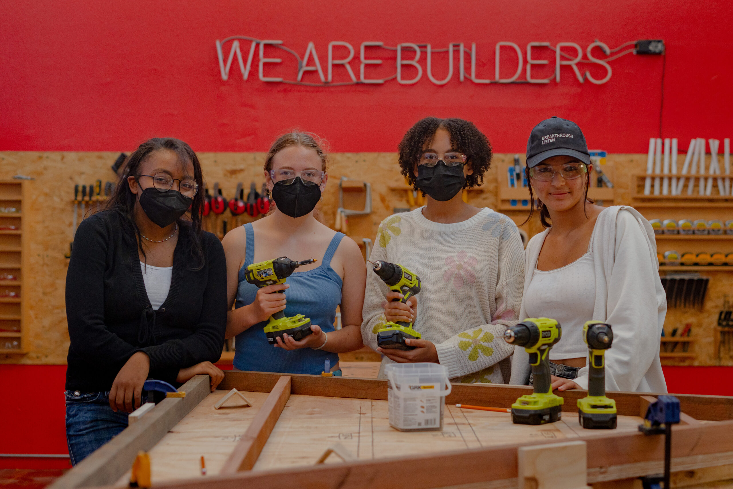 Triangular frames for geodesic domeGirls Garage crew at the Eames Ranch before the installation beginsWide shot of installing the ceiling frames of the geodesic domeAction shot of student installing geodesic domeStudents and instructors installing a triangular frame for geodesic domeGirls Garage geodesic dome at the Eames Ranch in Petaluma