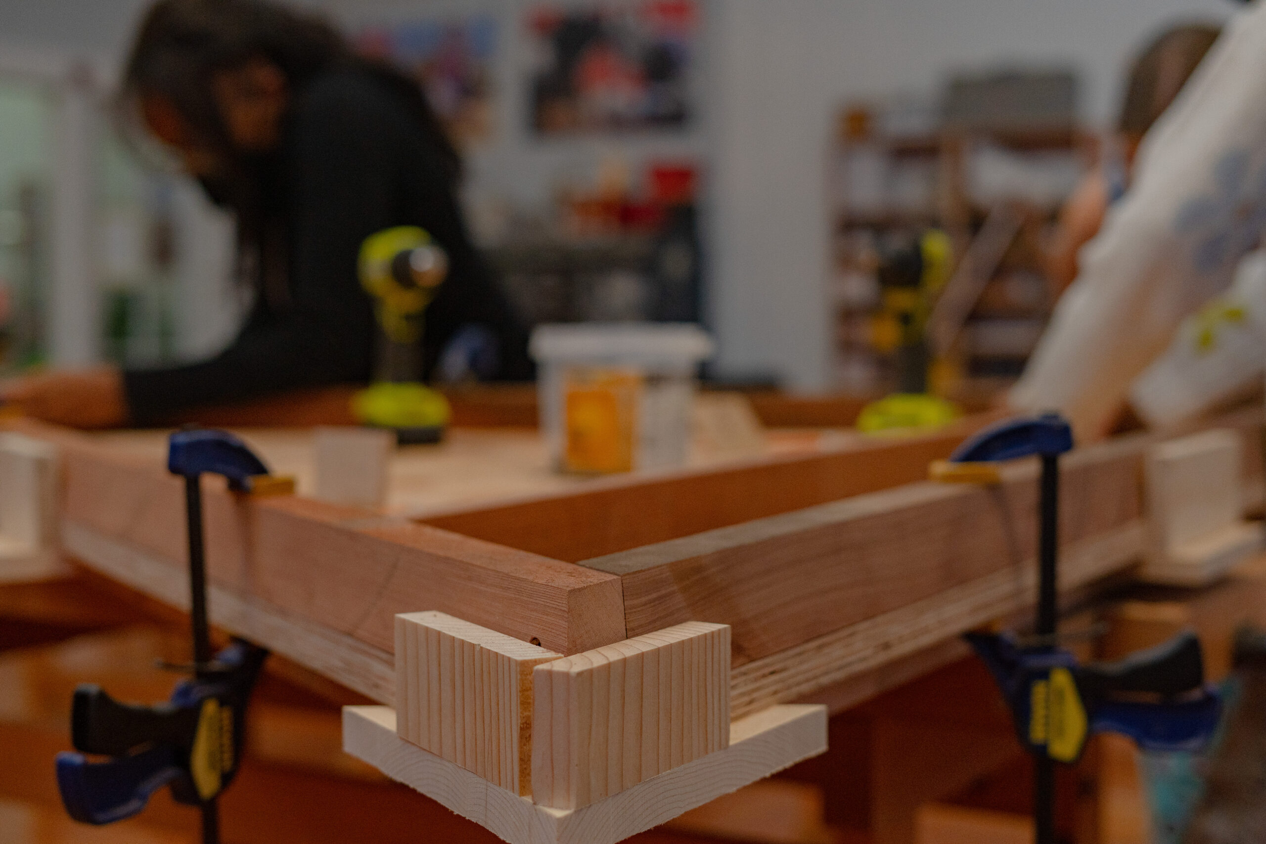 Materials: reclaimed redwood 2×4, clamps, chop saw, impact drill and driver