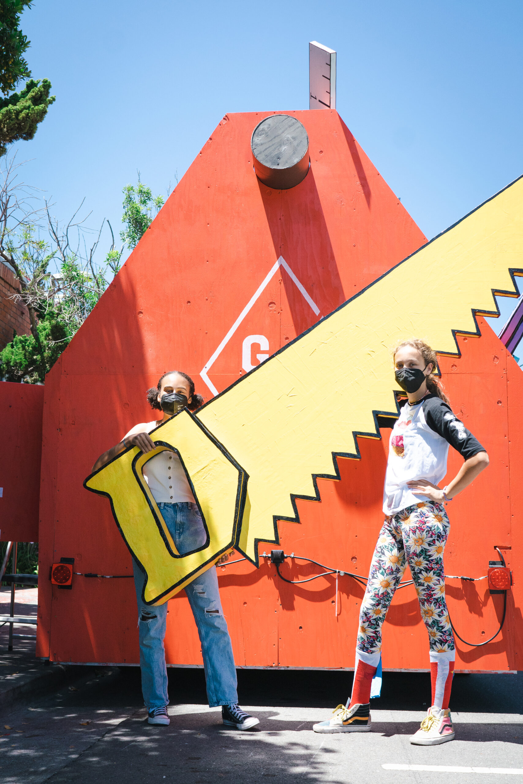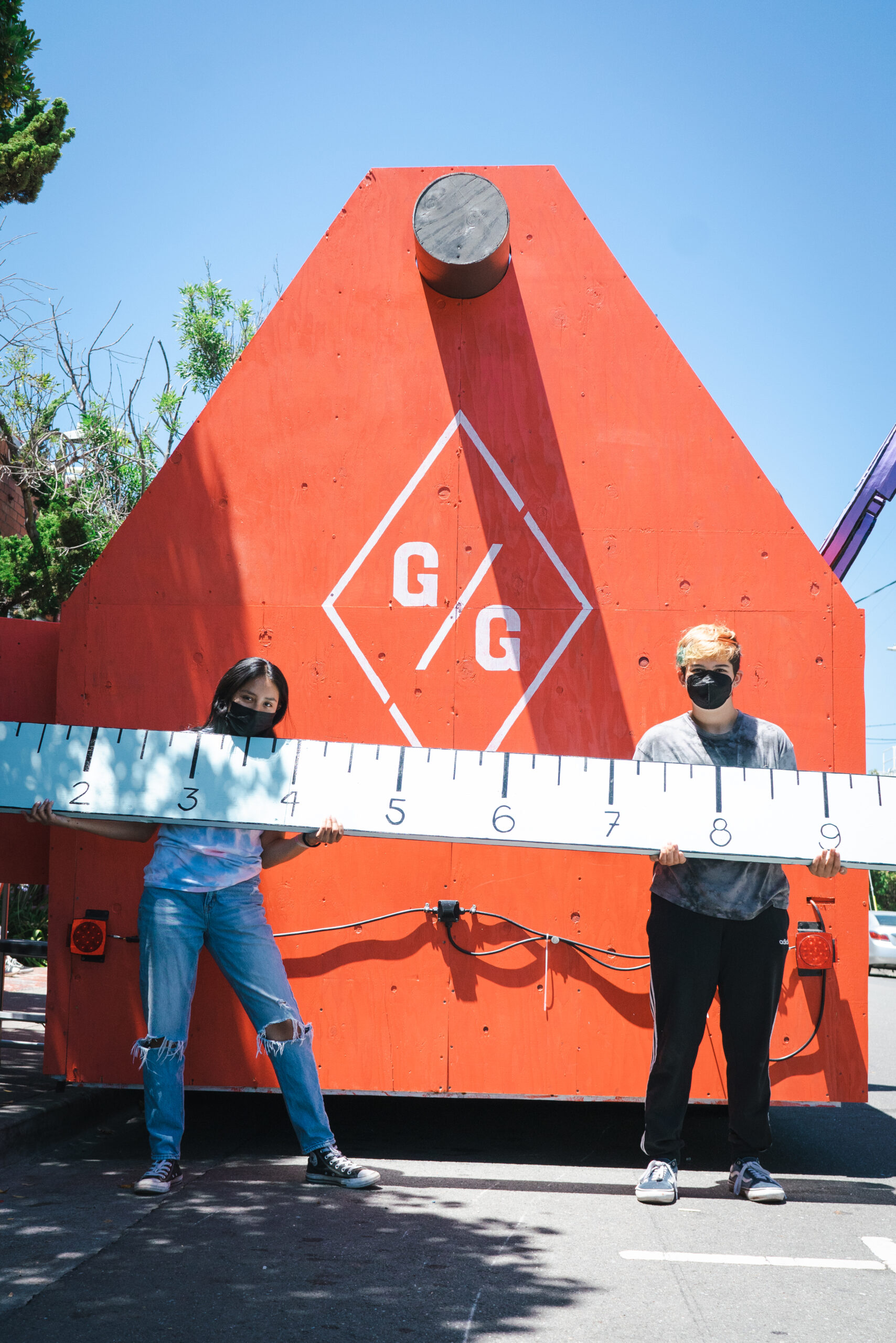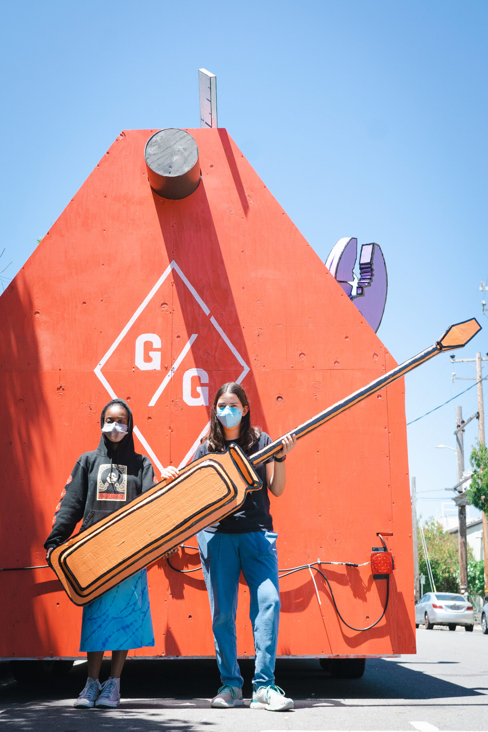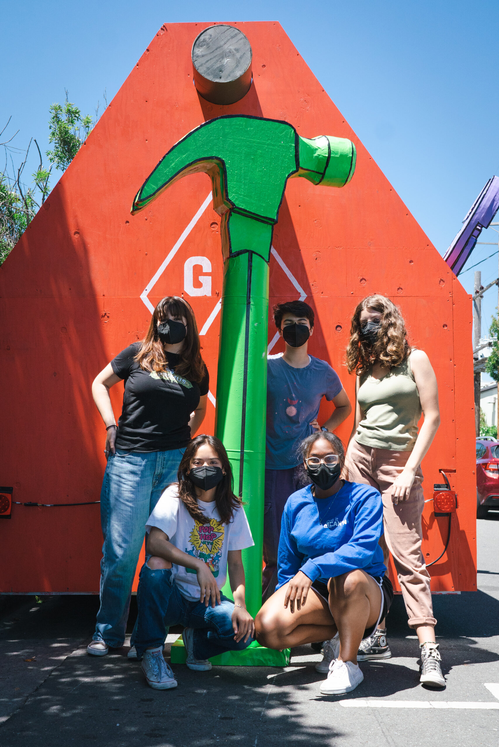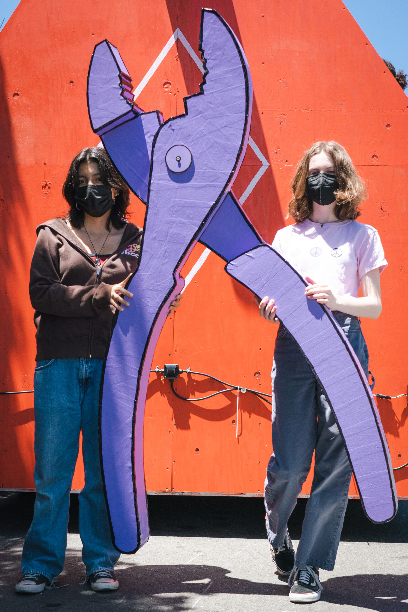 Description: To “accessorize” our toolbox parade float, the students and staff of the Young Women’s Design + Building Institute designed and constructed 6 larger-than-life tools: pliers, hand saw, hammer, wrench, screwdriver, and ruler. The tools were made out of a mish-mash of foam, reclaimed ductwork, and plywood; our students applied paper mache to cover the surface of each tool, then primed and painted. To make the contours of the tools “pop,” they outlined the angles and edges in black paint pen.