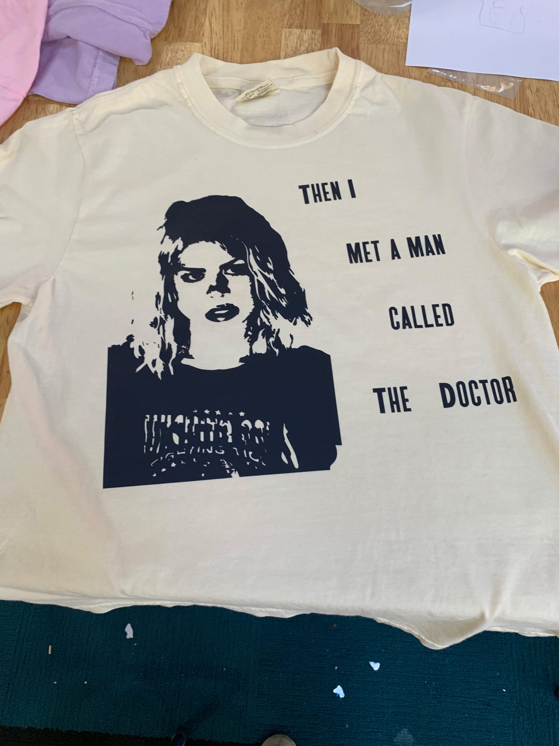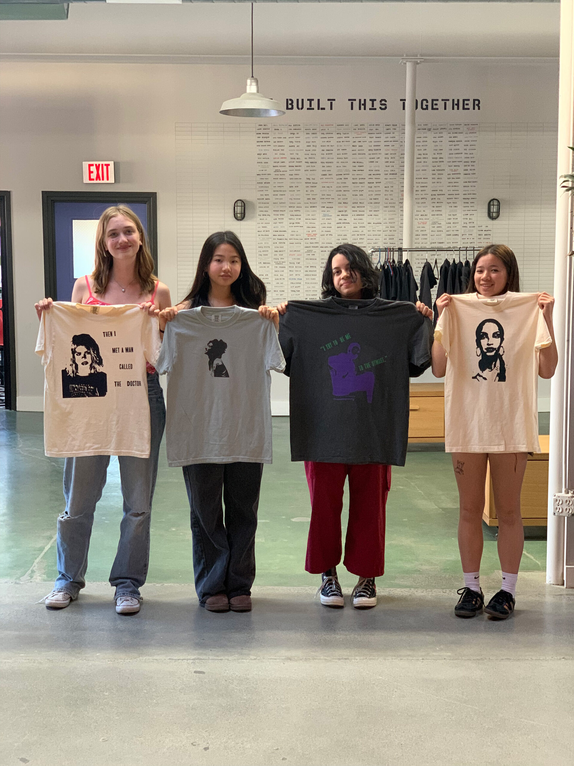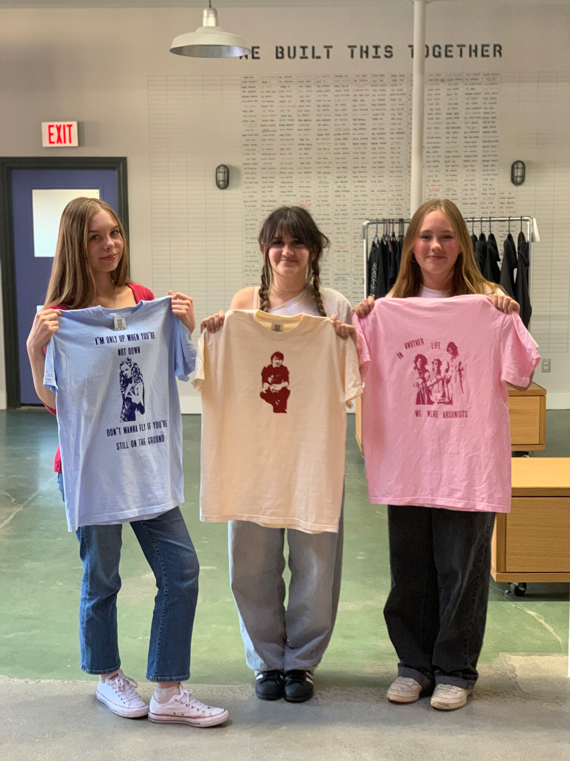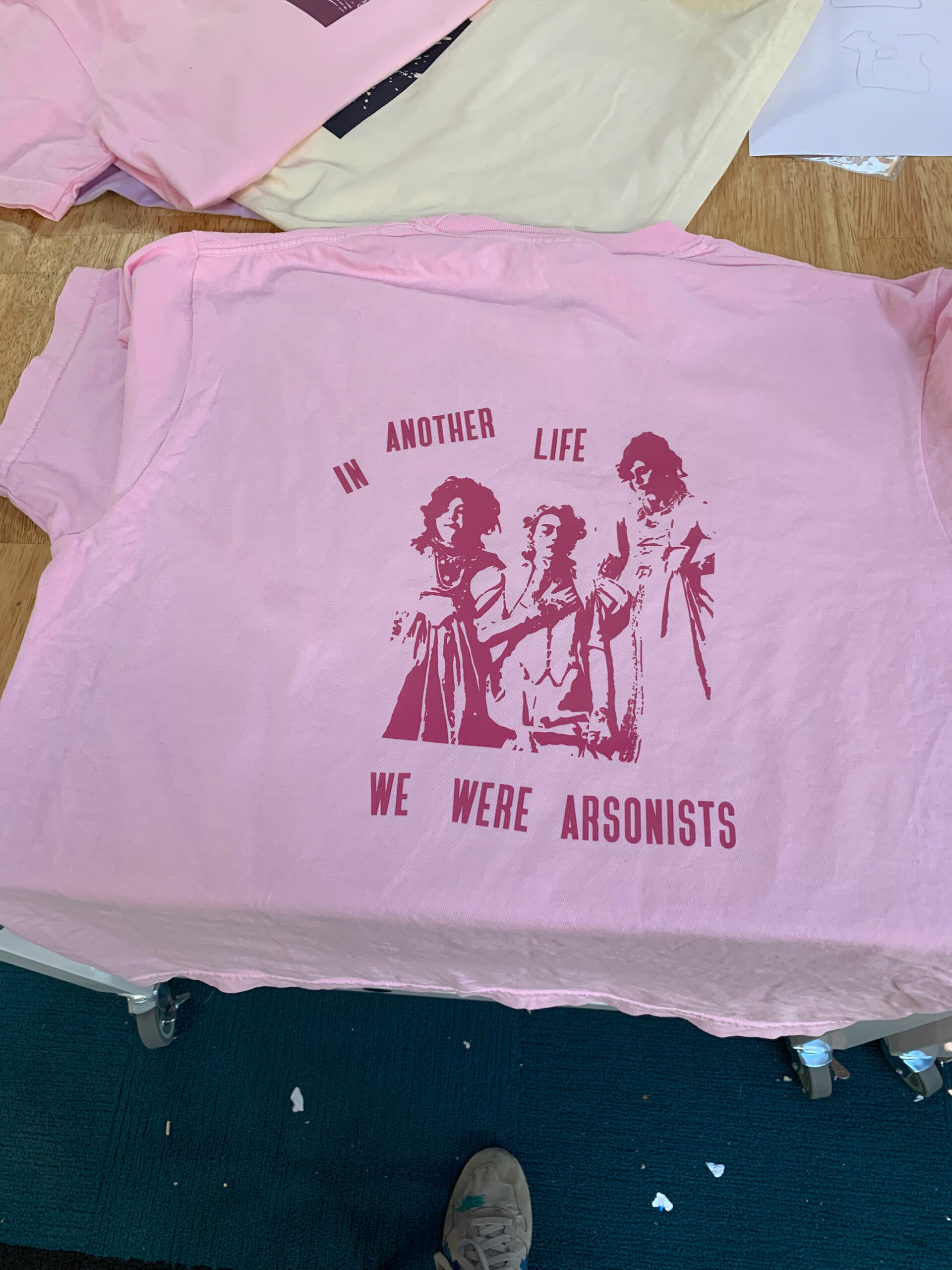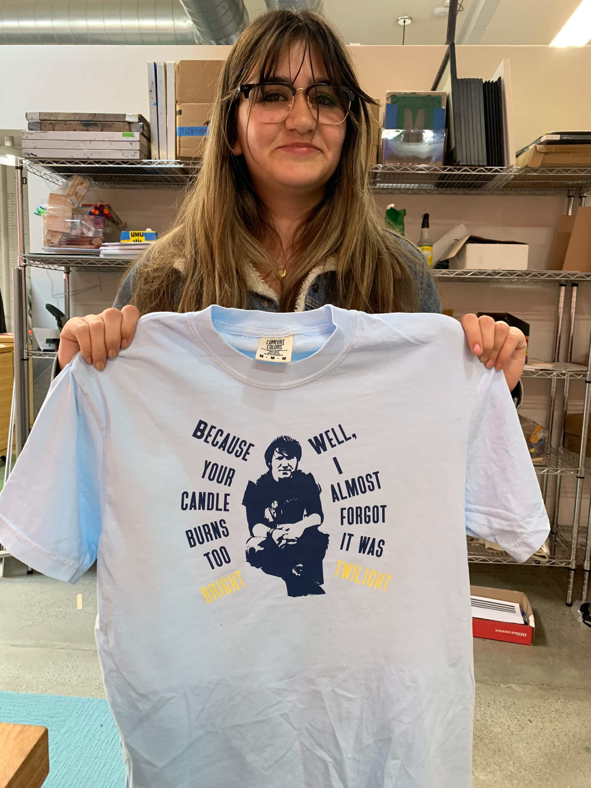 Description: We mixed it up in Protest + Print this spring session with the addition of a new tool: the heat press! Each student chose an image of a person—an artist, writer, or fictional character—they admired, as well as a quote. Instructor Bethany Kaylor took the images into Adobe Illustrator and edited them into stylized stencils, similar to the iconic Barack Obama poster from his 2008 presidential campaign, which were eventually turned into DTF transfers. Using Vocal Type Co’s Bayard font, our students designed the composition of the text + stencil portrait on their t-shirts, giving careful consideration to visual elements like size and line breaks. Once the composition was settled, it was time to heat press the transfers onto the t-shirt! Each shirt was pressed twice at 333 degrees F for 20 sec.