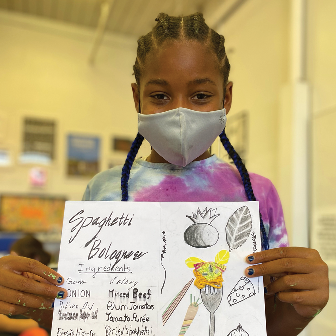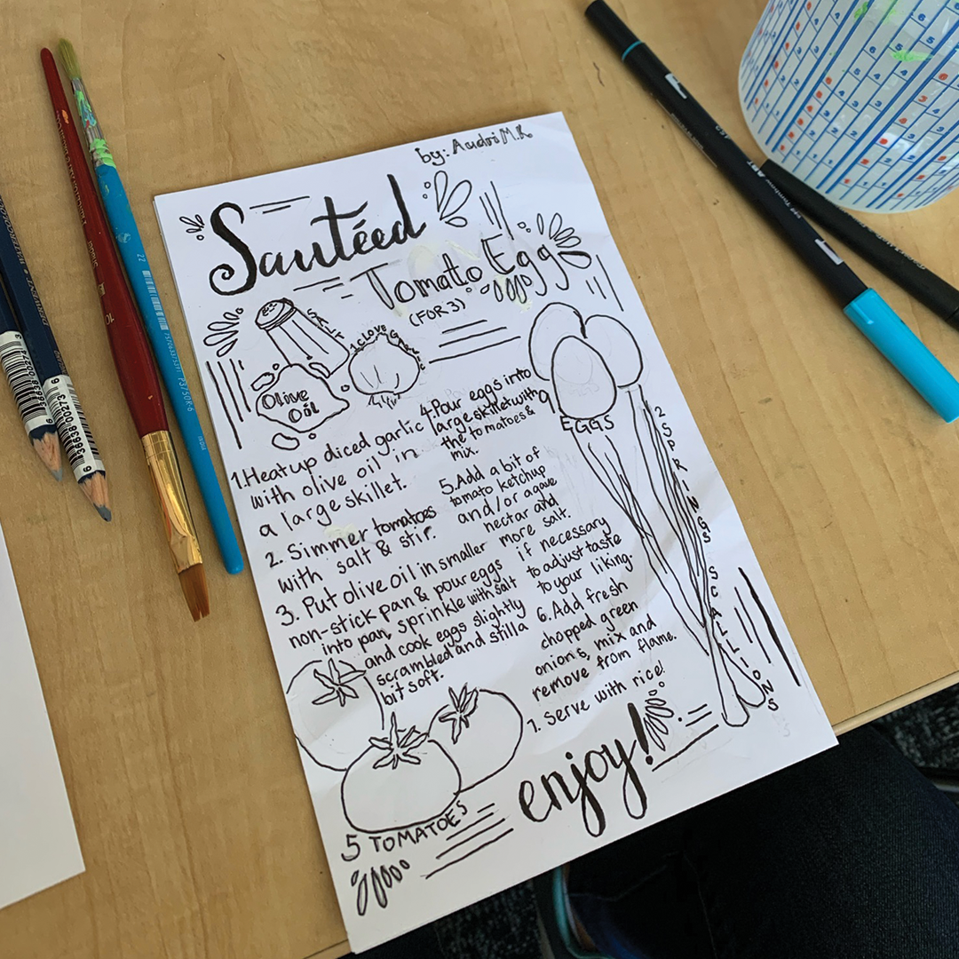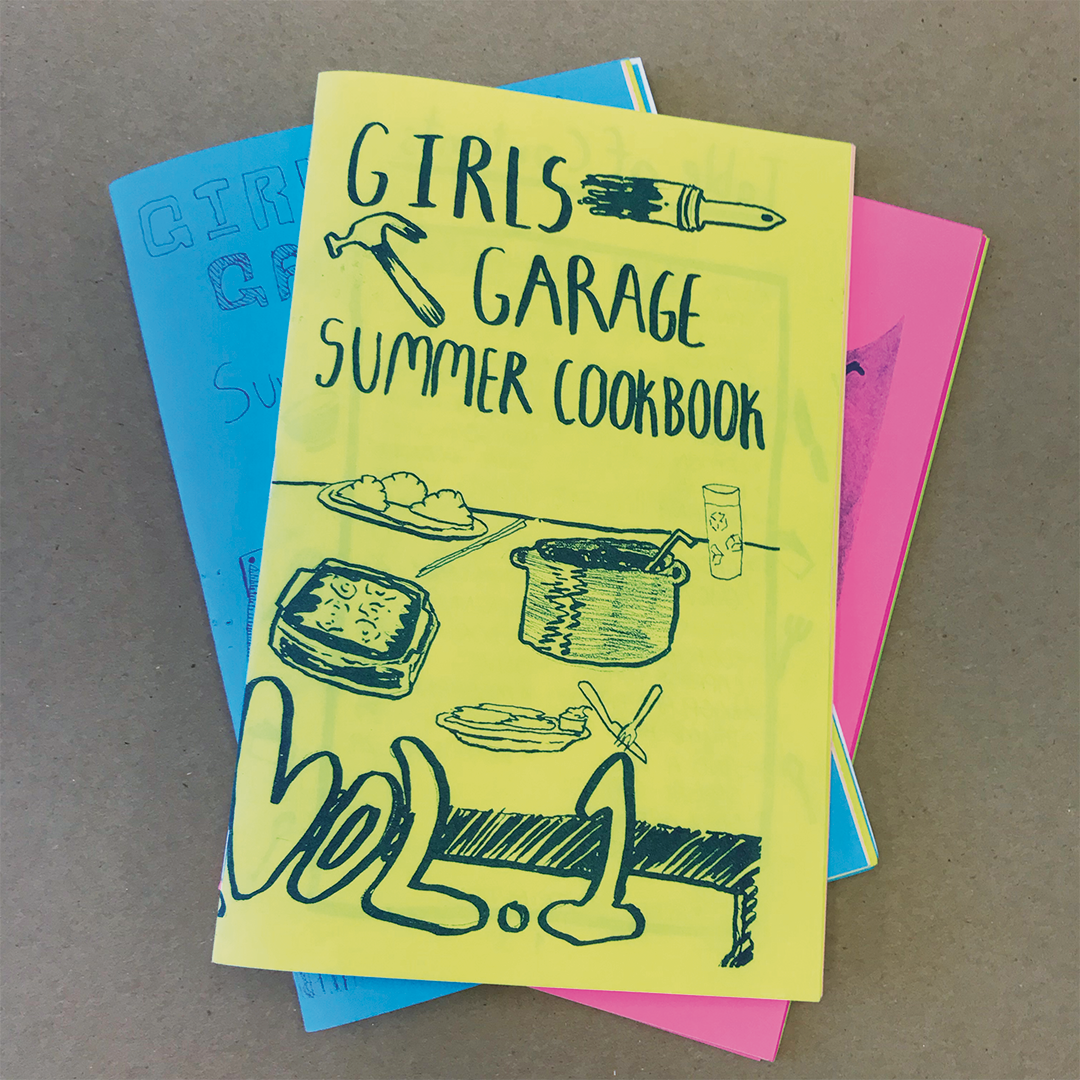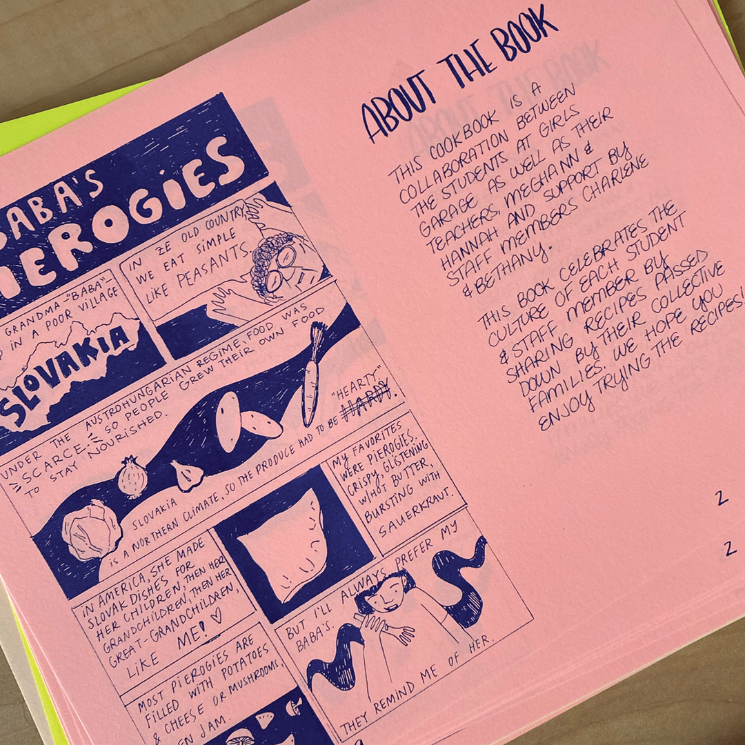 Description: In the arts component of the summer 2021 Builder Bootcamp, our students collaborated to create an illustrated cookbook zine. Instructors Meghann Harris, Hannah Geitner, and Bethany Kaylor kicked off the project by facilitating a discussion about food, family history, and mutual aid in the Bay Area. Inspired by edible gardening and the connective power of food, each student then selected a recipe from their family to design for the zine. From jook to pierogis to mac n’ cheese, our students used a variety of mediums to illustrate their recipes: pens, pencils, markers, stickers, beads, and even 3D objects like clay sculptures. The pages were then copied and printed on the risograph machine and assembled into a zine. The final result was a colorful cookbook, filled with recipes that celebrated the cultures and histories of our students and staff members. Each week of Builder Bootcamp created a zine; the 3-volume set is available for sale in the Girls Garage shop.
