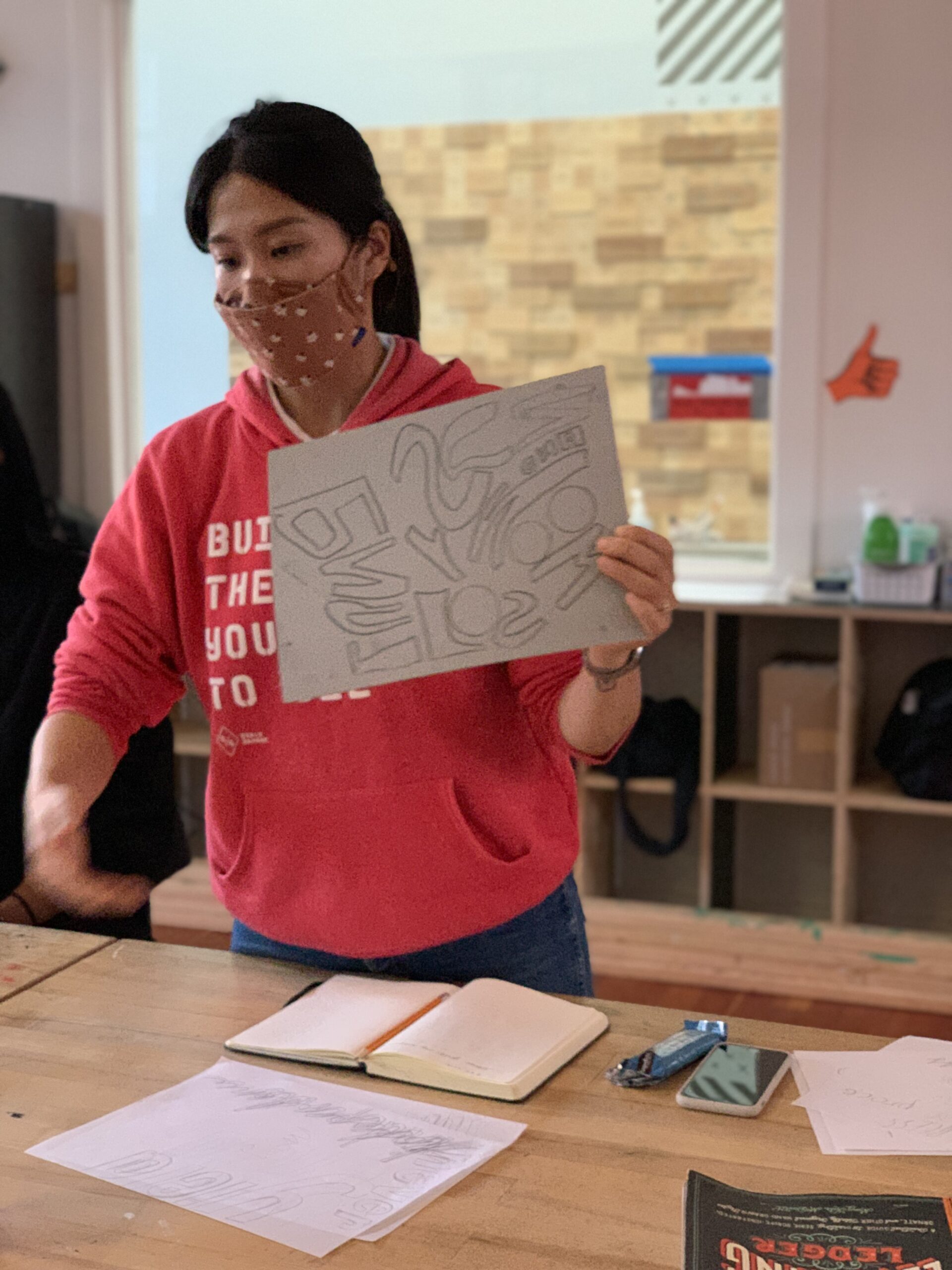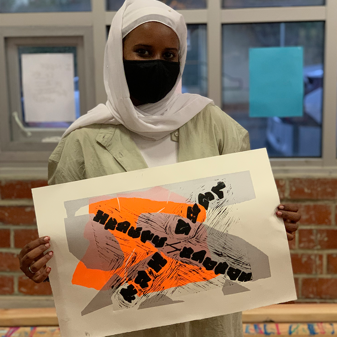 Description: In our fall Protest + Print class, our activist artists created vibrant multimedia posters through linoleum block carving and screen printing. For inspiration and reference, our students looked to artists like Sister Corita Kent, Edgar Heap of Birds, AFRICOBRA, Glenn Ligon and Meredith Stern. The students began the project with a writing prompt from instructor Bethany Kaylor where they were asked to reflect on two (seemingly) conflicted truths in their lives. From there, instructors Emily Pilloton-Lam and HyeYoon Song helped our students screen print vibrant organic shapes onto sheets of 11×17 paper. HyeYoon then led lino-cut block carving 101, where she explained the theory and process of block carving and demonstrated how to safely use the tools. Our students carefully carved their text onto their linoleum, and in the final two weeks, they created test prints, experimenting with the amount of ink on the roller, the pressure on the brayer, and the placement of the carving. The last class was a whirlwind of inking, pressing, and transferring final prints!