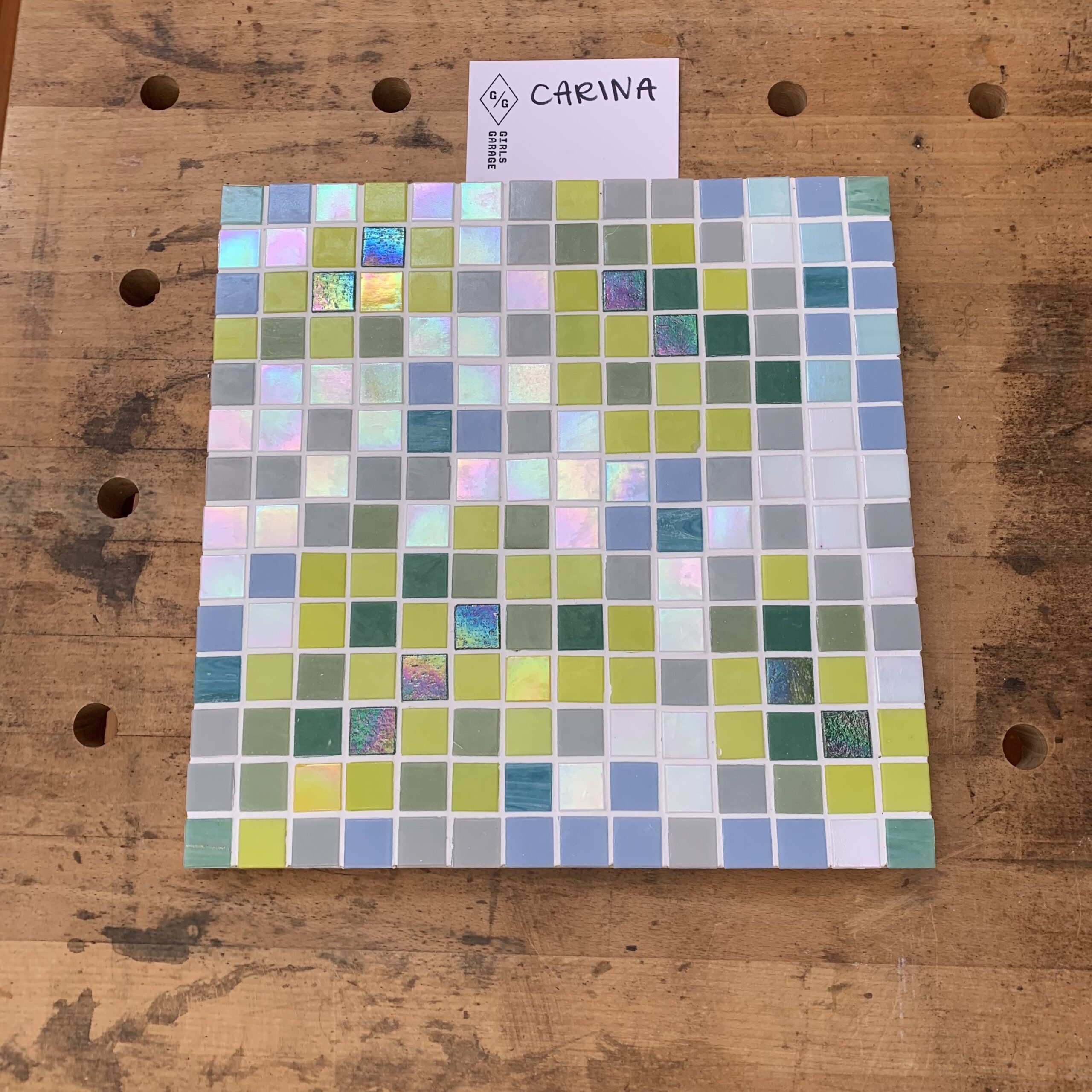 Materials: 12×12″ wooden canvases, weld bond glue, vitreous 3/4″ glass mosaic tiles, mosaic grout, flexible rubber spatula, large flat sponge