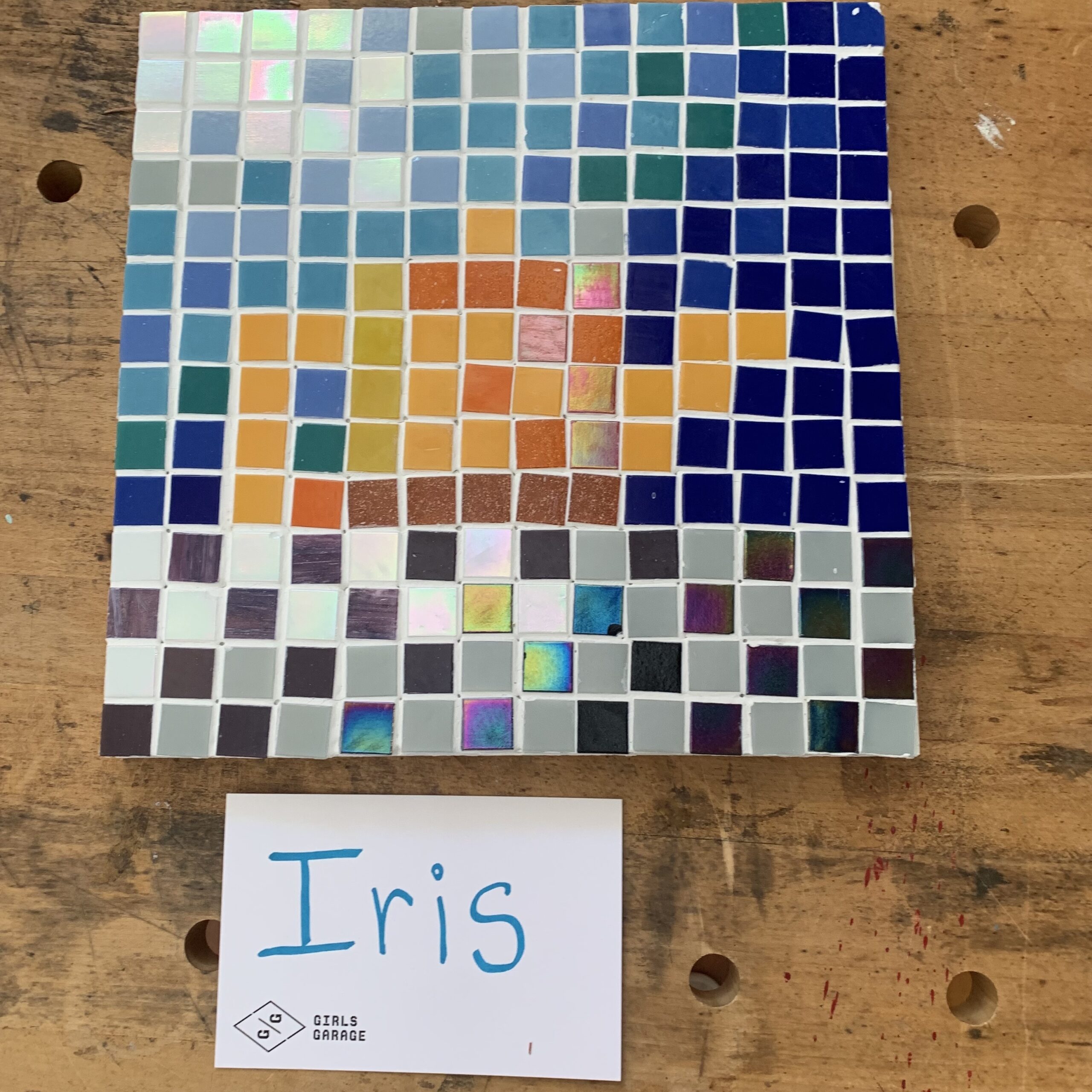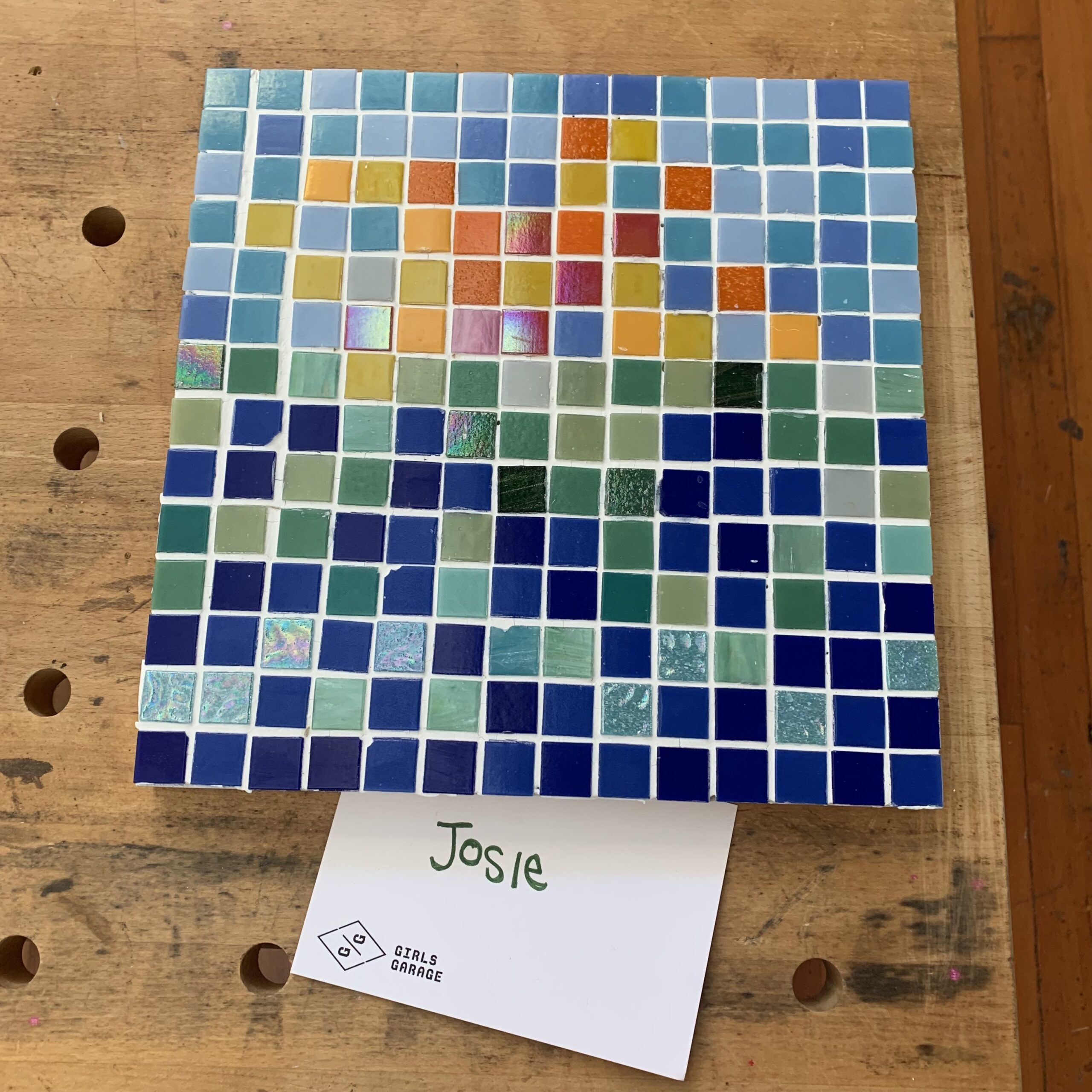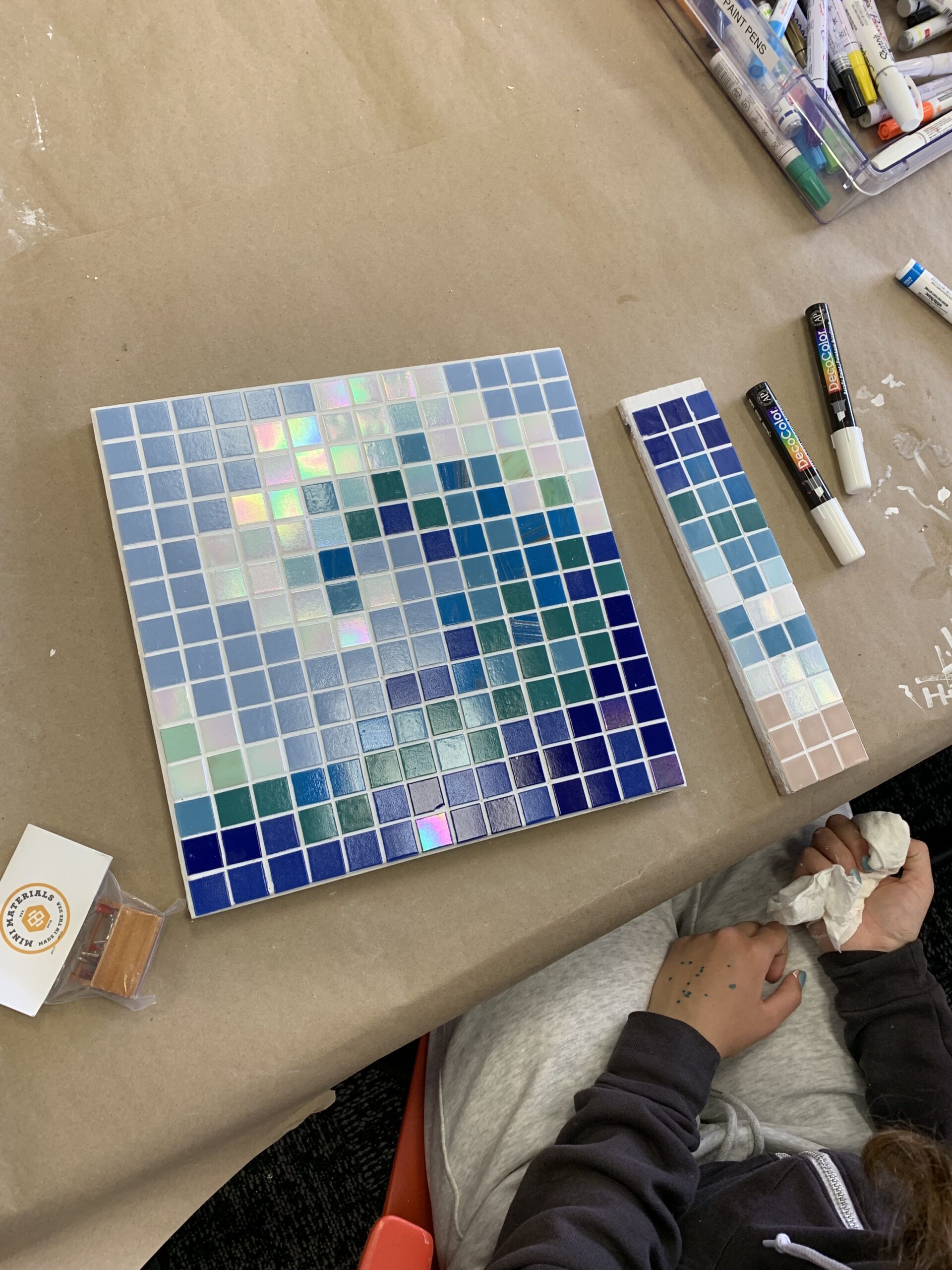 Description: Our YWDBI students tackled a new medium this summer: mosaics! Looking to artists like Ellsworth Kelly and Claude Monet for inspiration, our students created colorful designs that engendered a sense of calm. Instructors Maya Vilaplana, HyeYoon Song, Bethany Kaylor and Lex Lesley framed the project as a way of thinking about self care: when we’re stressed or triggered, what sort of imagery helps bring us back to stability? Our students sorted through 70 lbs of vitreous glass mosaic tiles to choose their color palettes, then went about gluing each tile onto the wooden canvas, leaving 1/8″ between tiles for grout. After the grout dried, our students gently wiped off the excess with a damp sponge.