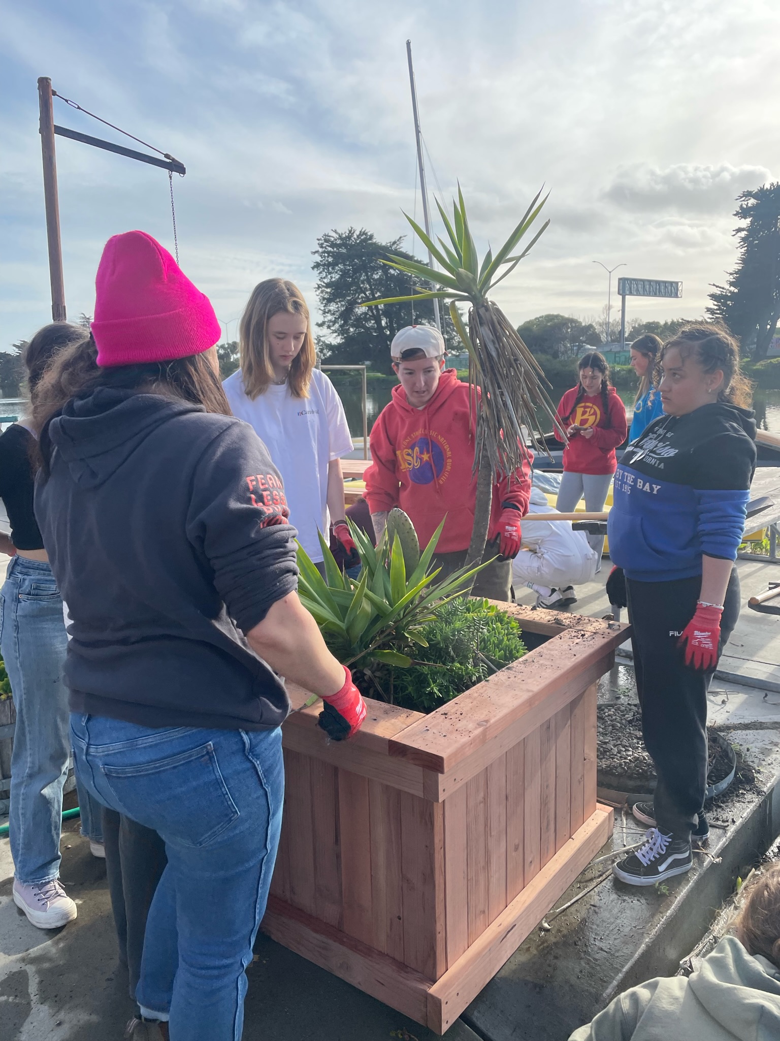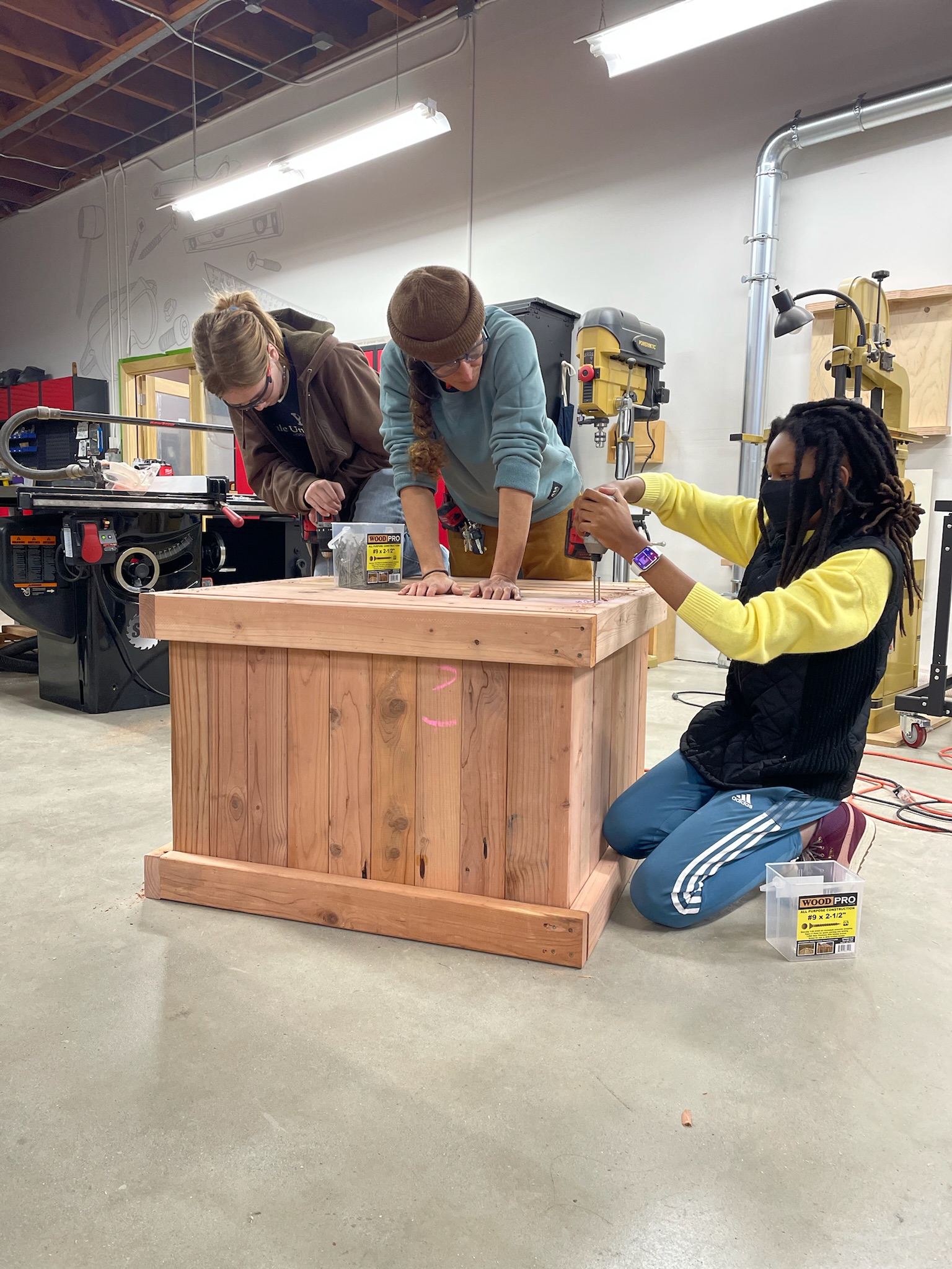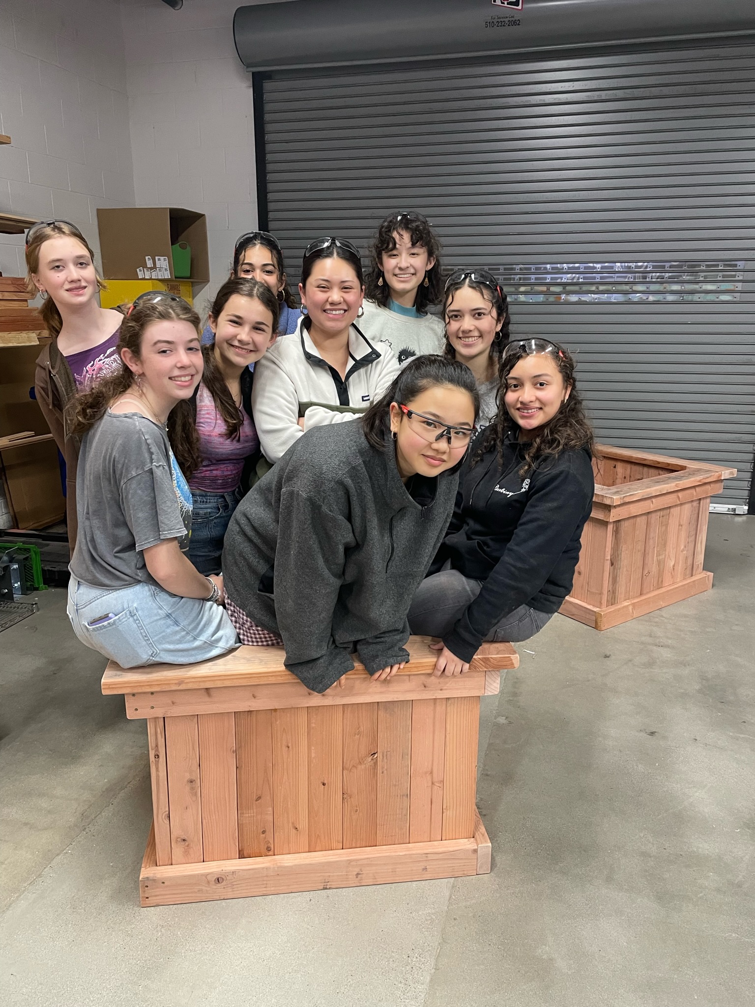 Description: In our first Construction + Community class in our new workspace, our high school builders teamed up with our neighbors down the street, Bay Area Outreach and Recreation Program (BORP), an organization that provides adaptive sports, fitness, and recreation opportunities to people with physical disabilities and visual impairments. BORP tasked our students with a site beautification project: replacing the busted wine-barrel planter boxes with 3 sturdier redwood planters, and building a new ADA-accessible picnic table that could fit 3 wheelchair users on one side. After weeks of building, our students installed the planters and table on the last day of class, repotting the plants and cacti.