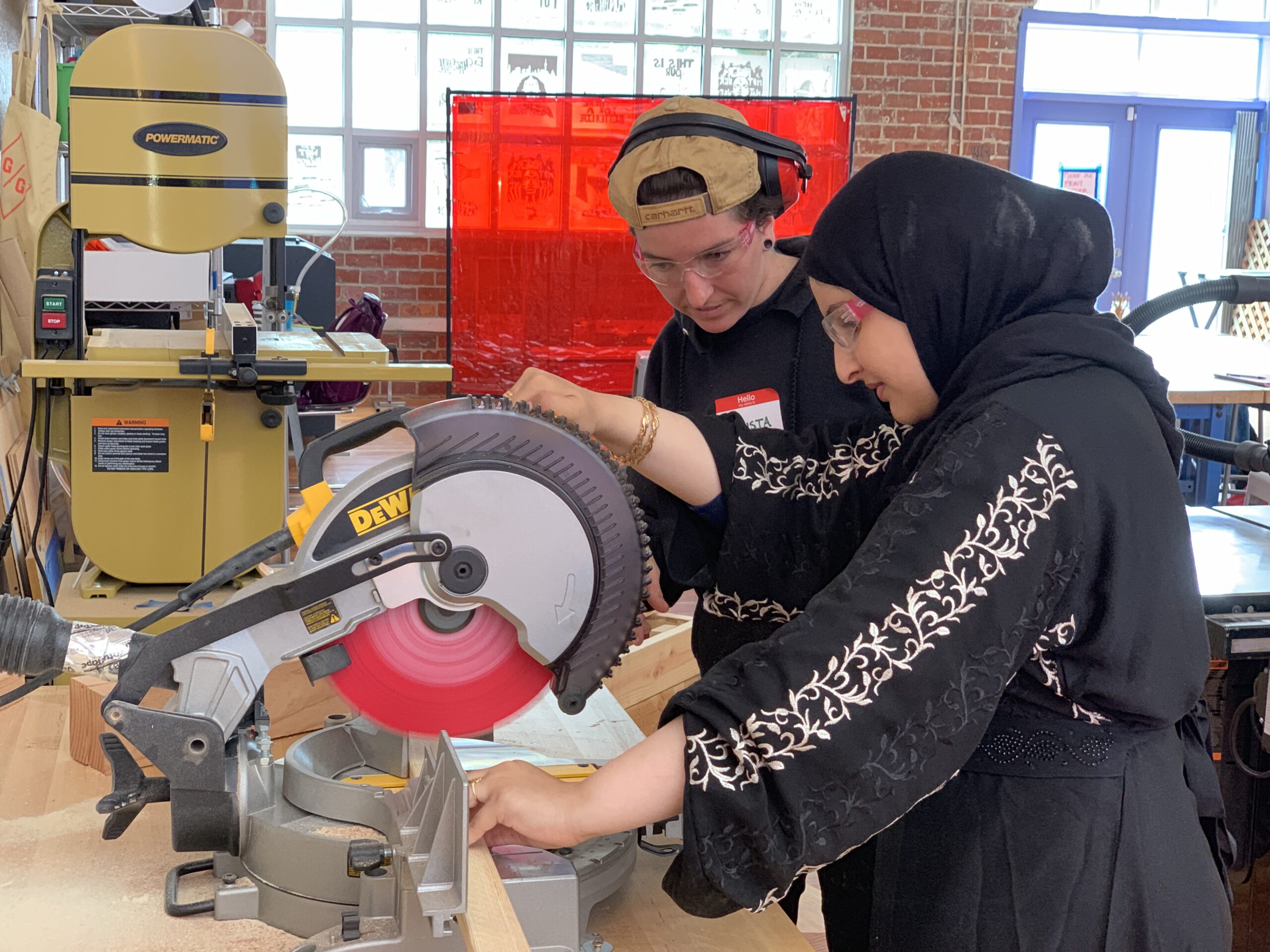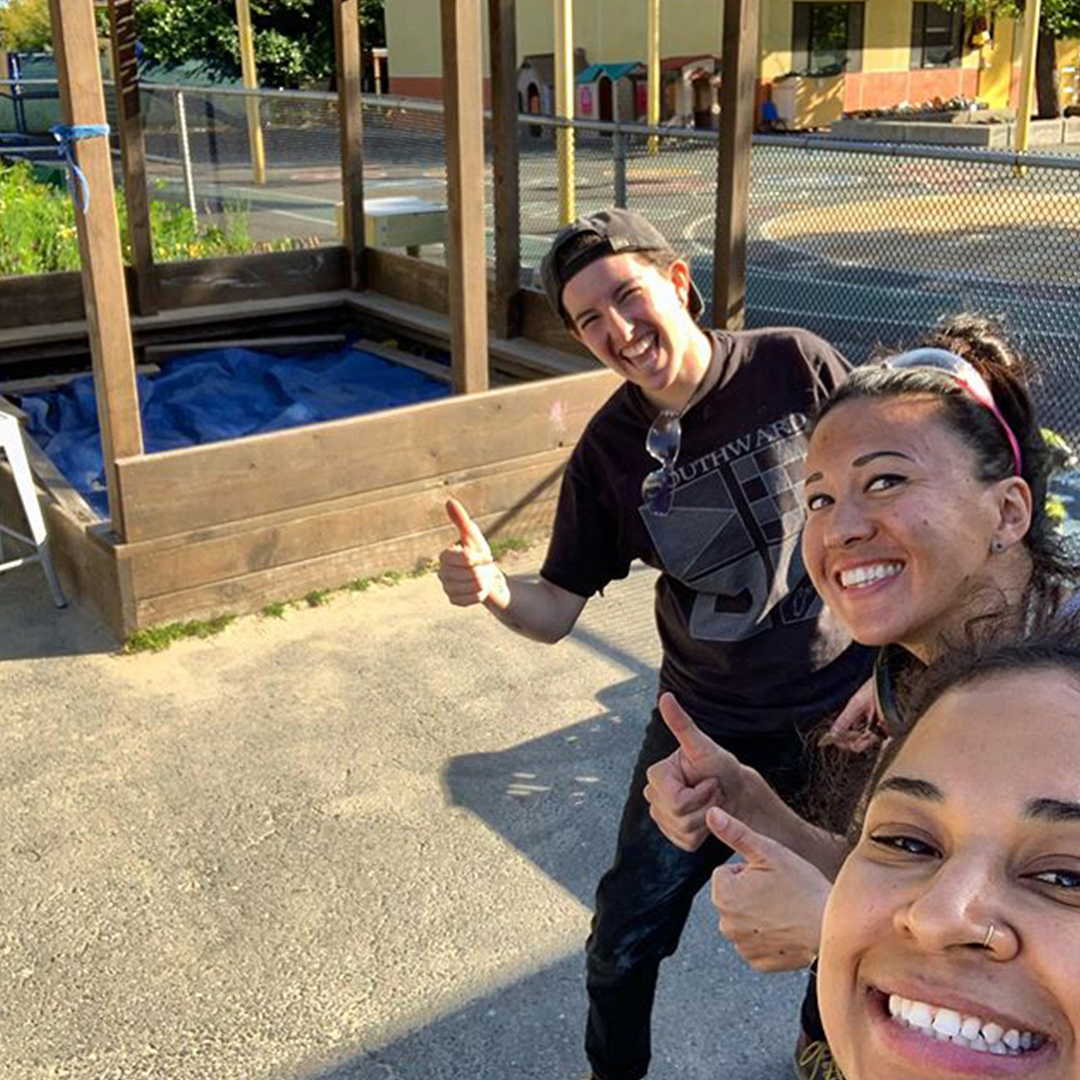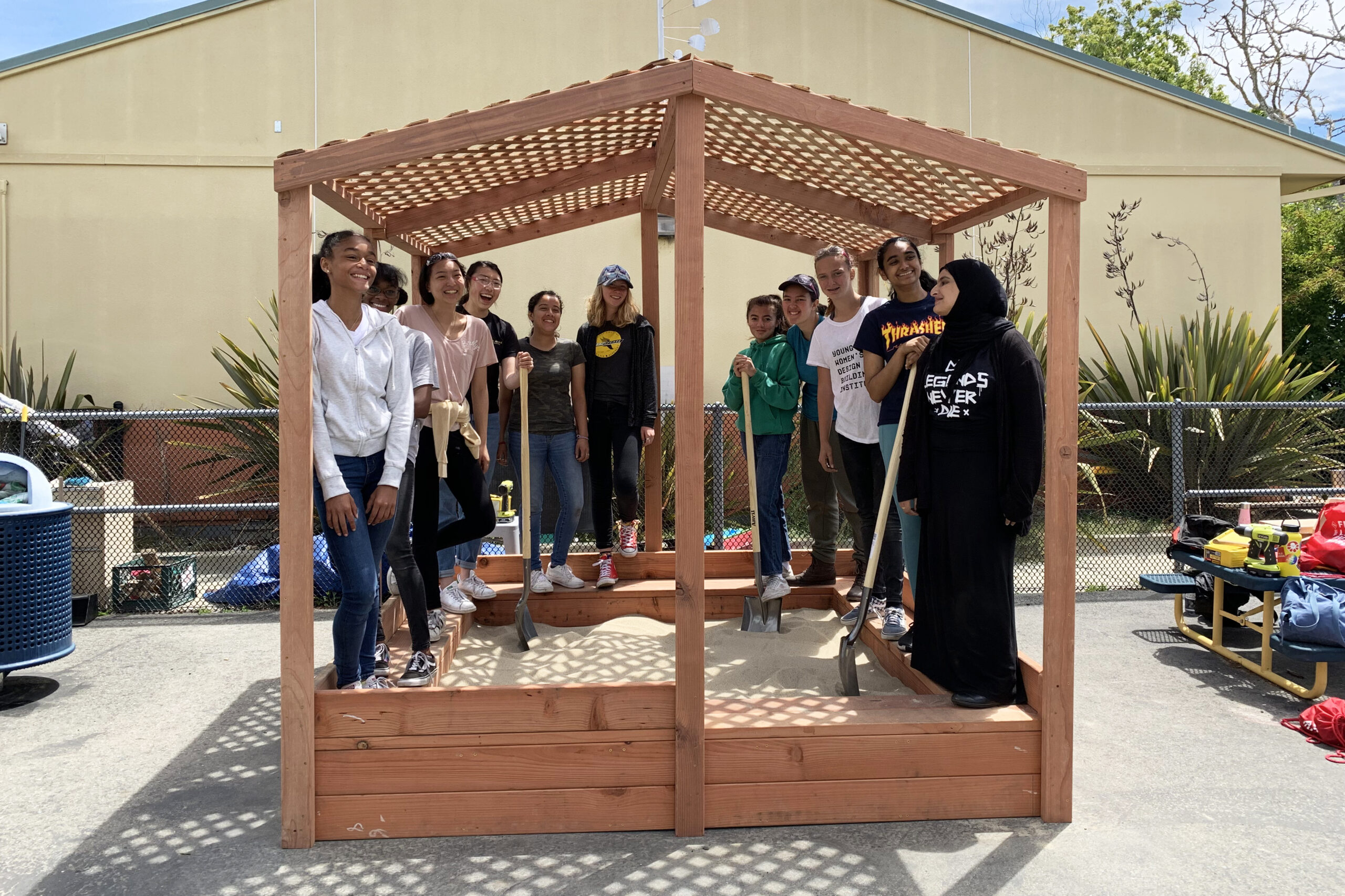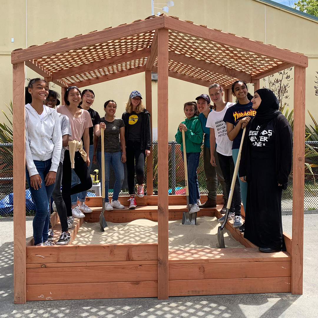 Description: In the 2019 summers session of Young Women’s Design + Building Institute, 23 teen girls and gender-expansive youth built two sandboxes for two of our local pre-schools. The first sandbox for Hopkins Preschool was hexagonal in shape, assembled in six segments of benches cut with 60-degree miter cuts. The second sandbox was a shaded structure over a rectangular sandbox for Franklin Preschool. Each of the sandboxes was also adorned with a kinetic wind sculpture welded by girls, including a post on a bearing and cupped “fins” that spin with the wind. The sandboxes were debuted to the toddlers, who cannonballed into the sand with glee!