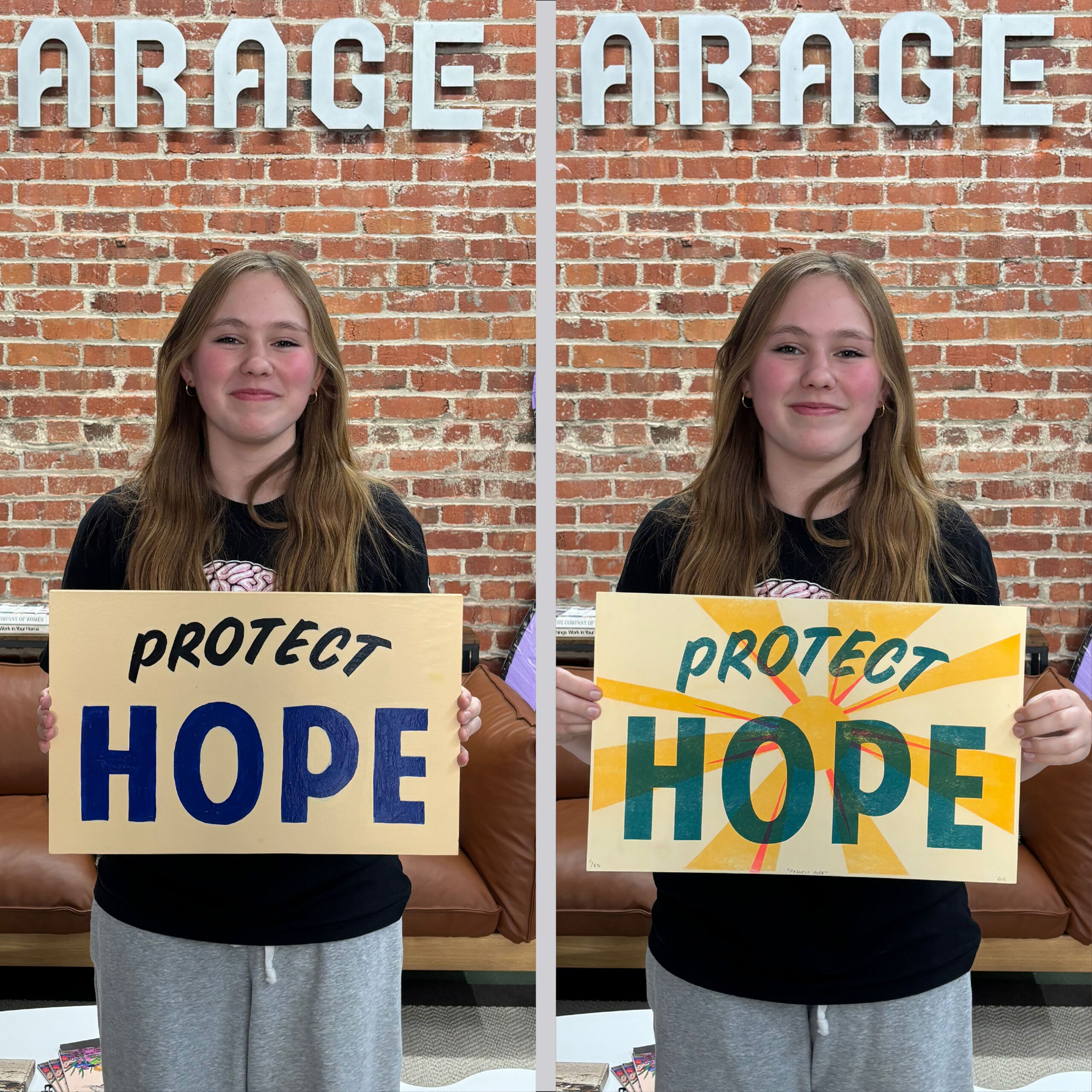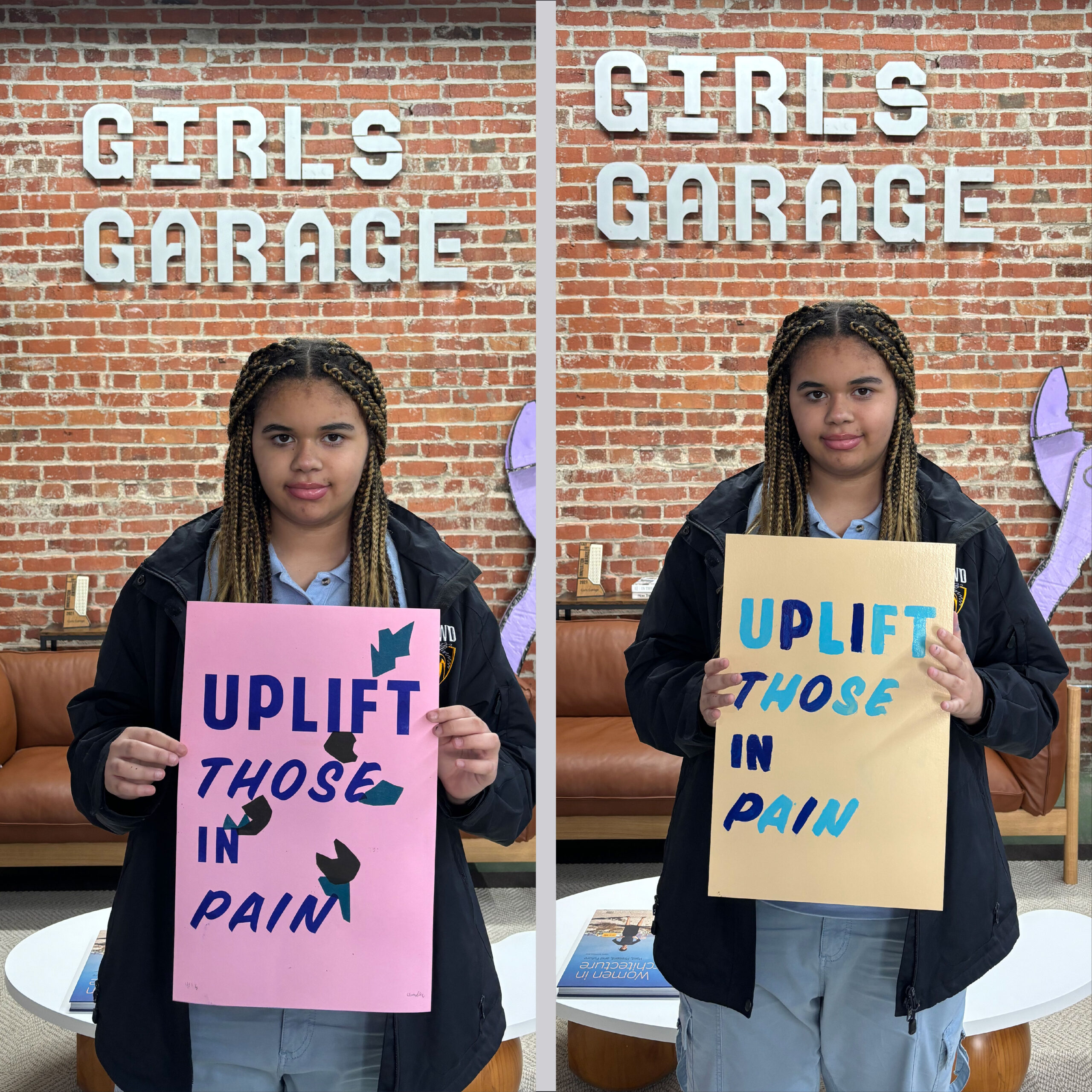 Description: We split our “Signs of Solidarity” project this winter into 2 media: hand-painted signs and risograph prints. We began the project by asking our students to think about solidarity in their own lives, using inspiration from social protests like Black Lives Matter and the Free Palestine movement. For the first four weeks, guest instructors Seth Vargas and Meng Nguyen taught our students the basics of hand painted signs. Our students practiced brush strokes and lettering on tracing paper before painting onto the MDO board directly. In the last 4 weeks, they translated their signs into 3-color risograph prints, getting a crash course in risograph printing along the way.