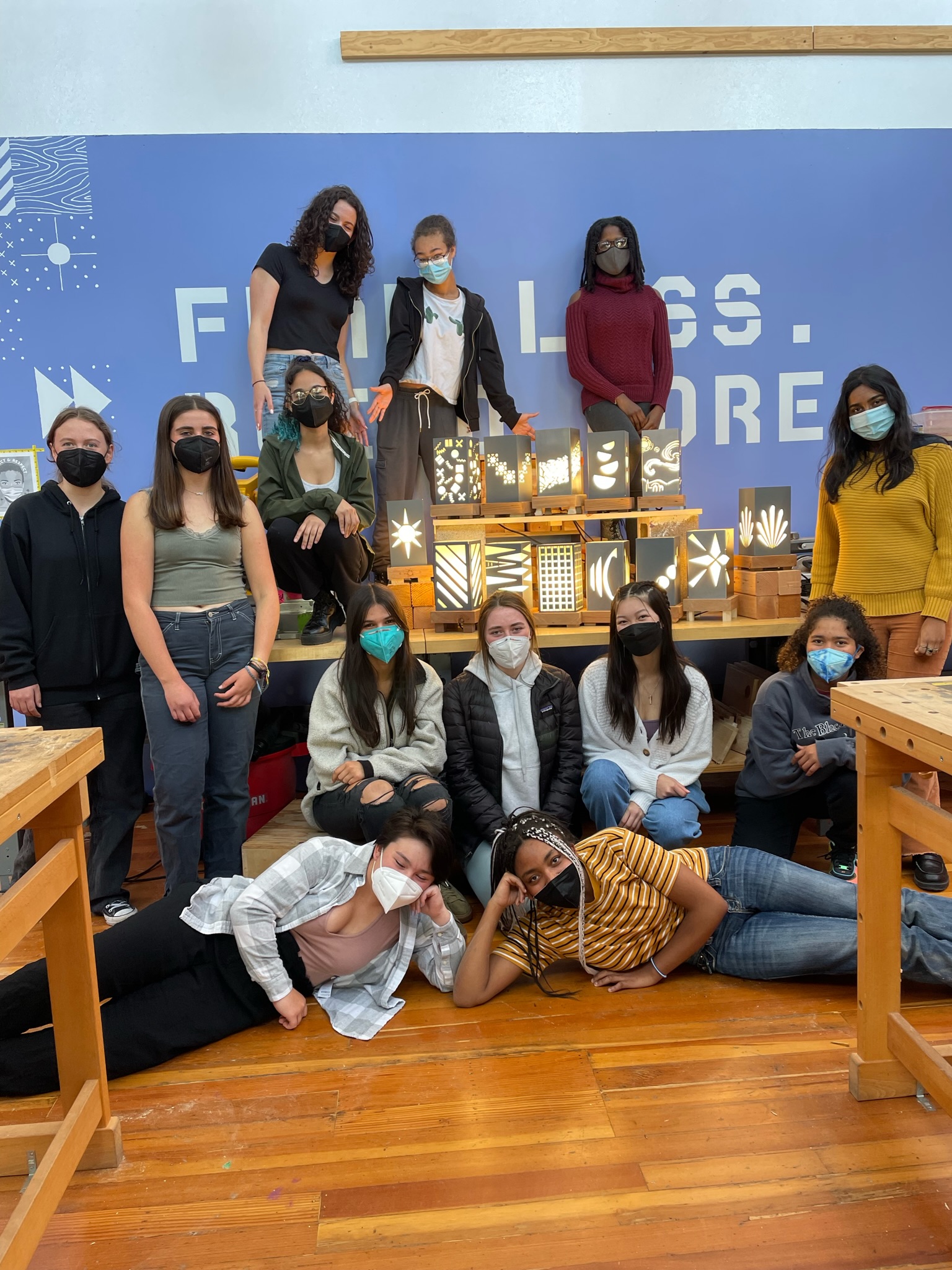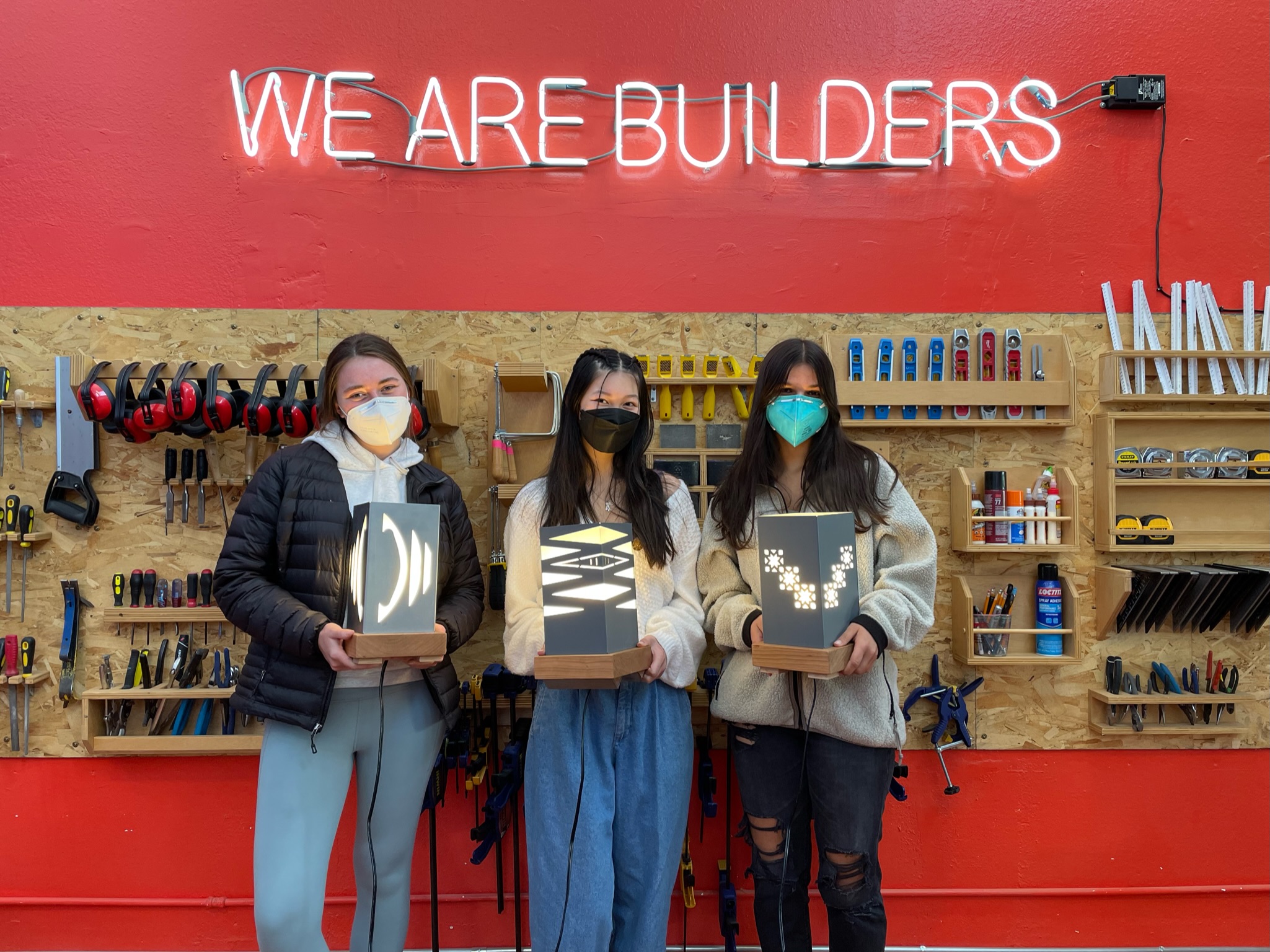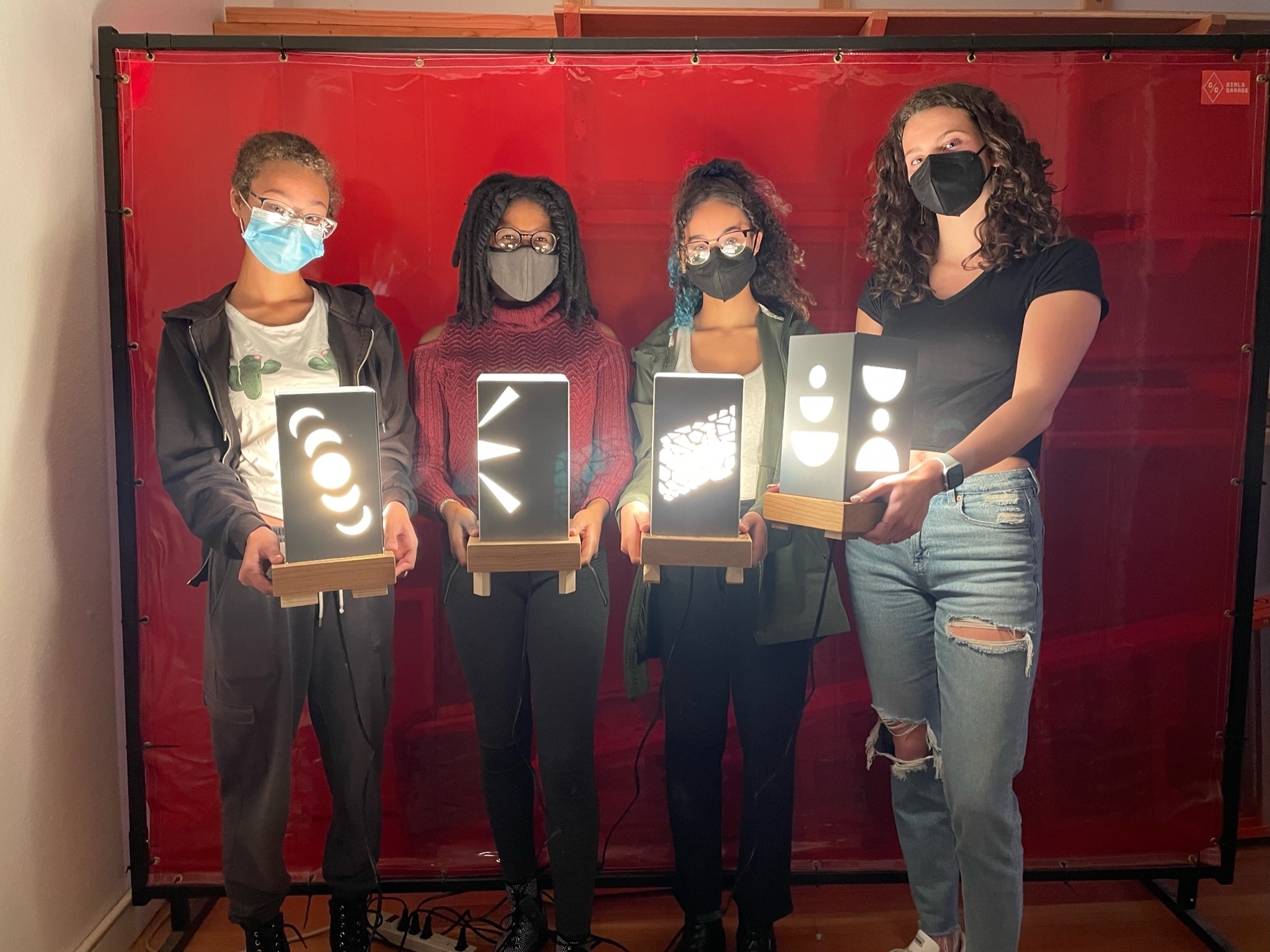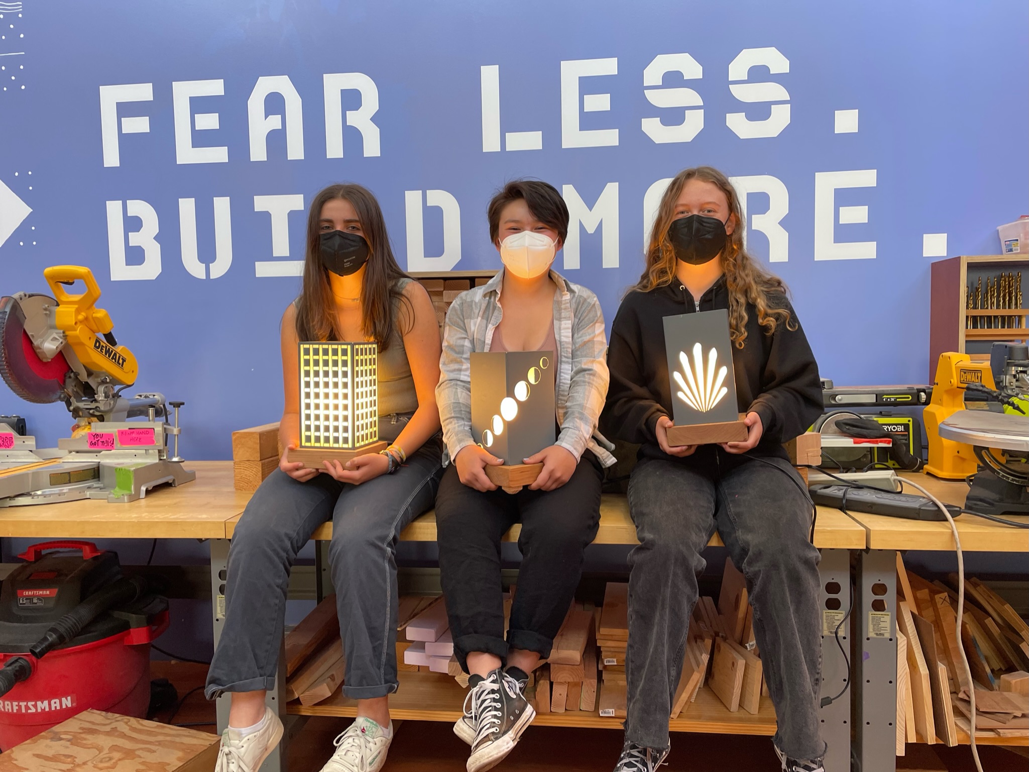 Description: In our winter session of Advanced Design/Build, our students designed and fabricated their own steel lamps. Each student used Adobe Illustrator or Rhino to draw their designs onto a template. The designs were then compiled into a one giant file that fits on 4×8 sheetmetal, and the waterjet machine cut out all of the pieces. The next step was deburring the sheetmetal and sanding the pieces. Back to the fabrication studio, our students used 2 different types of brakes to bend the sheet metal: they used the hydraulic press brake for the the first 3 90-degree turns, and for the final turn, a magnetic finger brake. In the Girls Garage workspace, our builders used a spot welder to seal the lamp. For the lumber base, they cut and sander lumber for a 6×6″ cherry base and a 1/4″ insert that the lamp was then set over. They drilled a hole through the middle for the cord, then installed the lamp socket by splitting the electrical cord and attaching the wires to the positive and negative of the bulb. Finally, they added feet to give the lamps height and glued custom acrylic cut to diffuse the light.