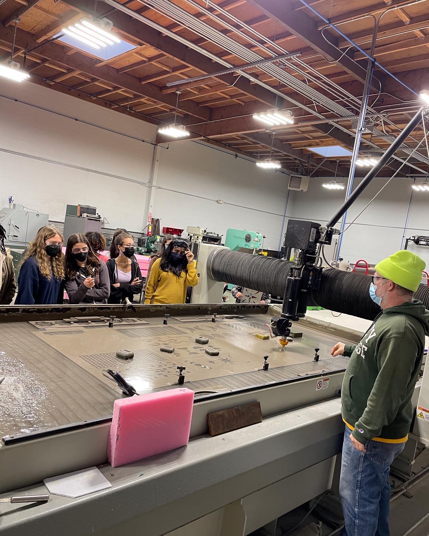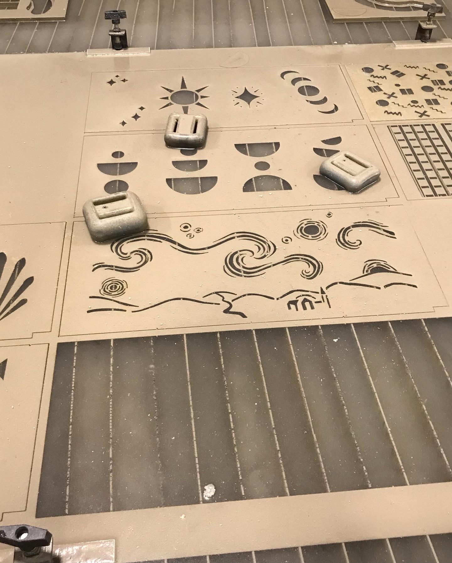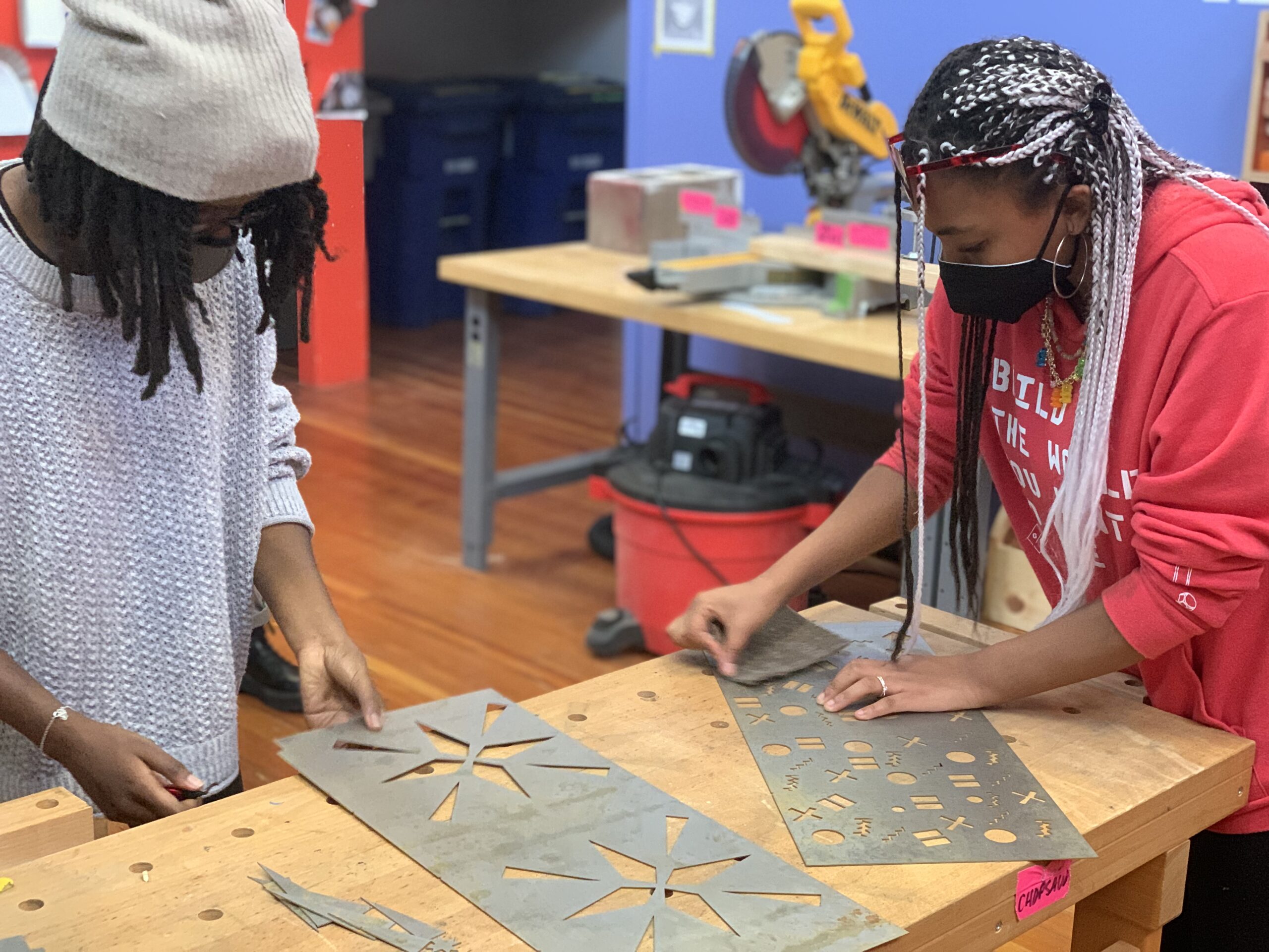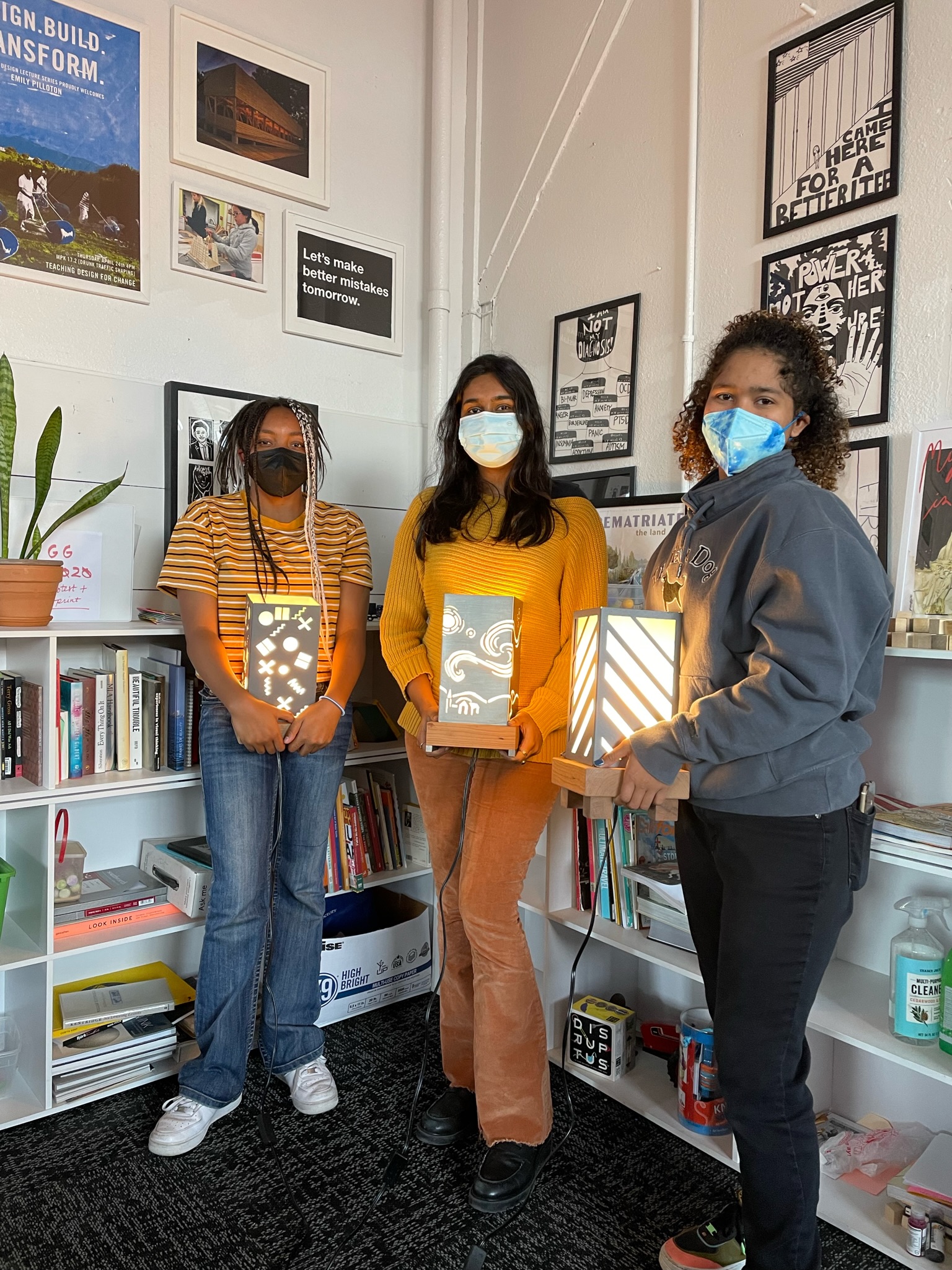 Description: In our winter session of Advanced Design/Build, our students designed and fabricated their own steel lamps. Each student used Adobe Illustrator or Rhino to draw their designs onto a template. The designs were then compiled into a one giant file that fits on 4×8 sheetmetal, and the waterjet machine cut out all of the pieces. The next step was deburring the sheetmetal and sanding the pieces. Back to the fabrication studio, our students used 2 different types of brakes to bend the sheet metal: they used the hydraulic press brake for the the first 3 90-degree turns, and for the final turn, a magnetic finger brake. In the Girls Garage workspace, our builders used a spot welder to seal the lamp. For the lumber base, they cut and sander lumber for a 6×6″ cherry base and a 1/4″ insert that the lamp was then set over. They drilled a hole through the middle for the cord, then installed the lamp socket by splitting the electrical cord and attaching the wires to the positive and negative of the bulb. Finally, they added feet to give the lamps height and glued custom acrylic cut to diffuse the light.