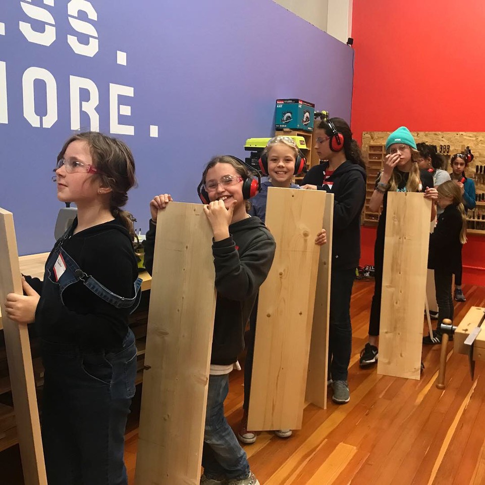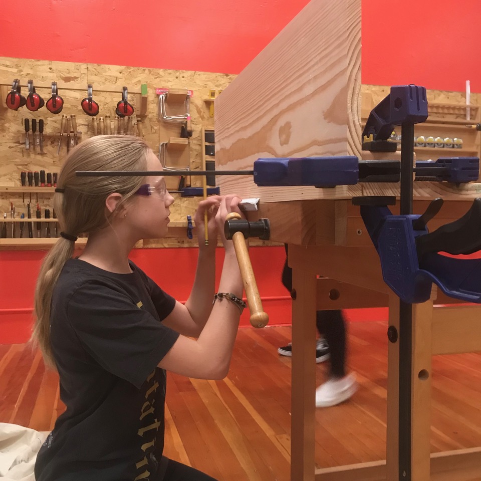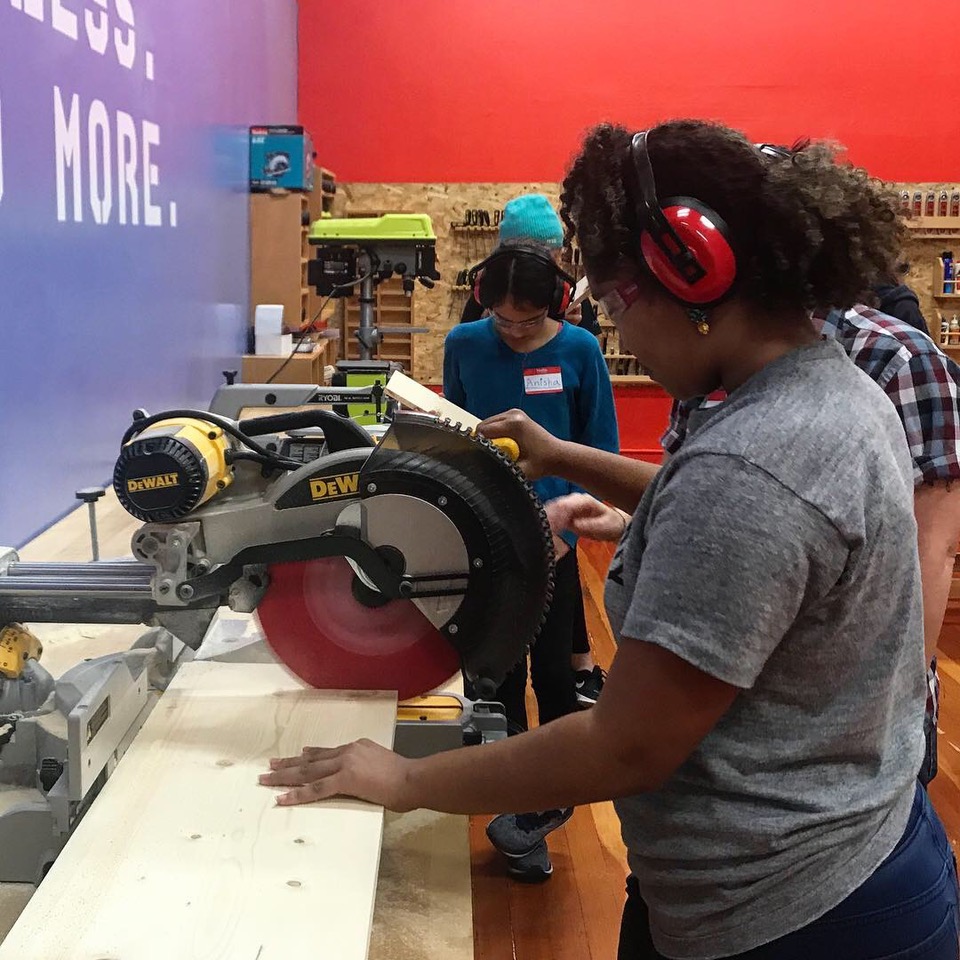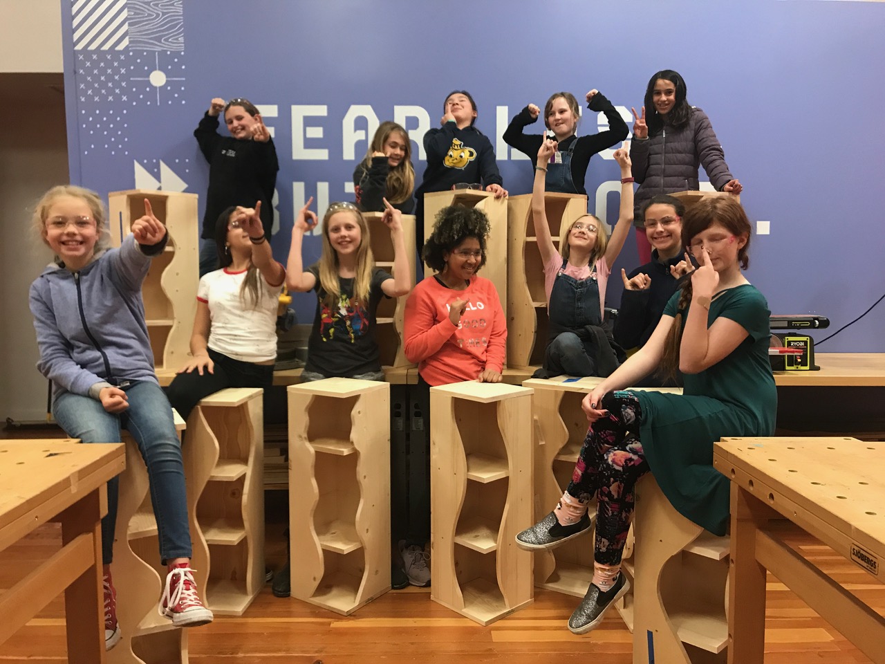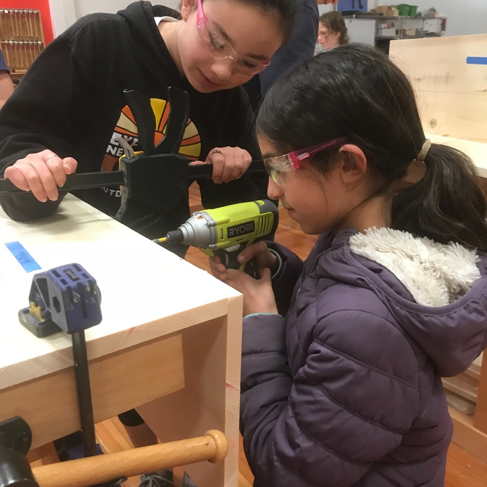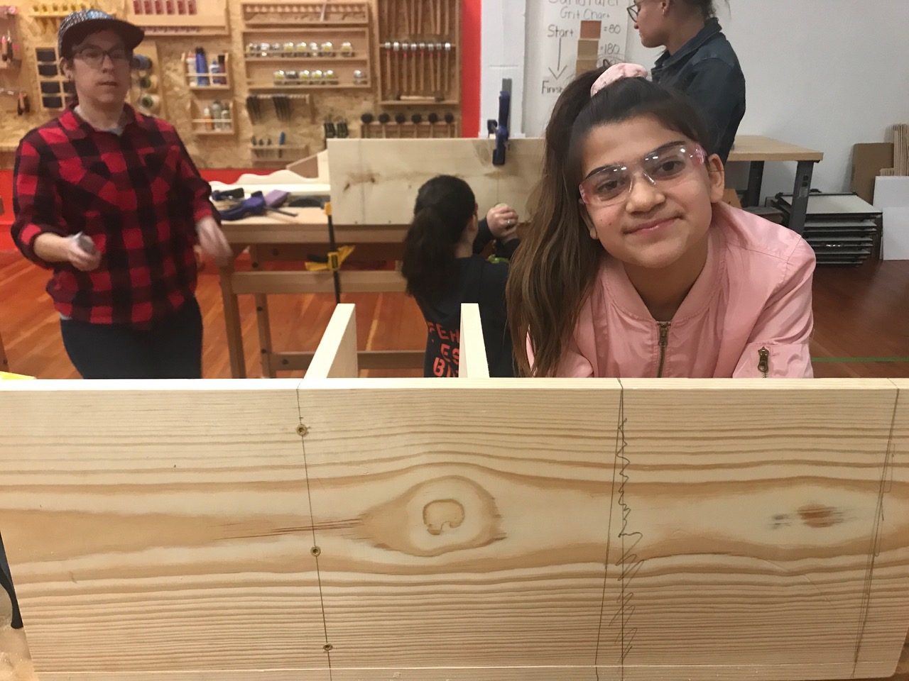 Description: These girls custom-built their bookshelves in accordance with their sizes and shelf-related needs. They first decided on the height of their shelves, before using the chop saw to cut side pieces out of 1×12 wood. They each drew their unique swoop down the middle of the 1×12 pieces, and cut those using jigsaws. Working in pairs, they used clamps to connect one of the newly-cut pieces to the backing side, creating an L-shape. They used drills and drivers to attach the side pieces, and proceeded to attach two shelves. They attached the top and bottom pieces with drills and drivers and voila!