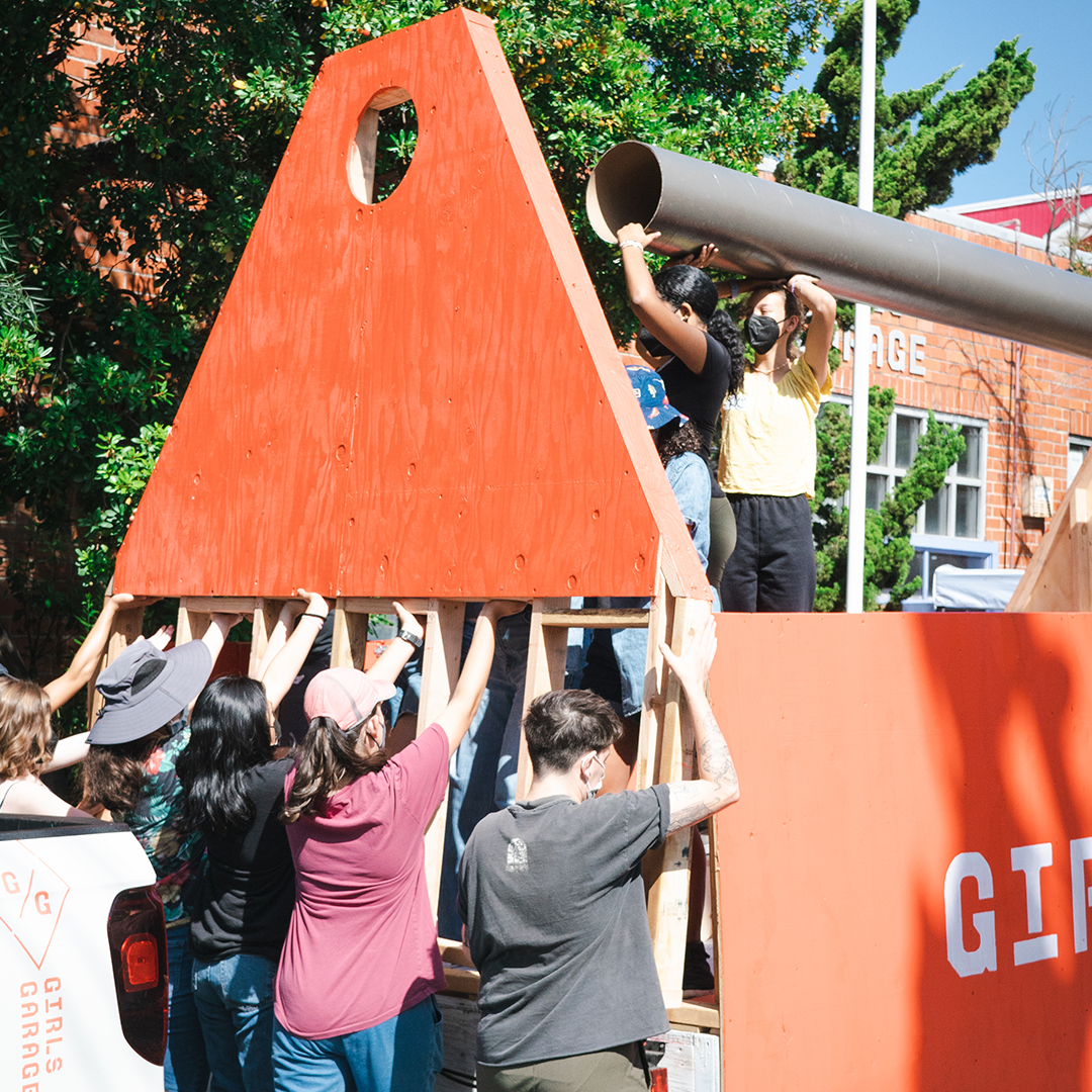 Description: In just two short weeks this summer, 35 high school girls and gender-expansive youth in our Young Women’s Design + Building Institute constructed an incredible toolbox float for the San Francisco Pride Parade! The project was first dreamed of back in 2019, with hopes to make it happen in 2020…but then the COVID-19 pandemic happened, and we had to wait a few years for the SF Pride Parade to return. Still, the creative process was worth the wait! In true “on the job” training, our students learned how to use a chop saw, circular saw, jig saw, drill and impact driver, which they used to cut lumber, frame the walls, and attach cladding to the float. Highlights included on-the-spot trigonometry and incredible teamwork…lowlights included painting in the hot sun!