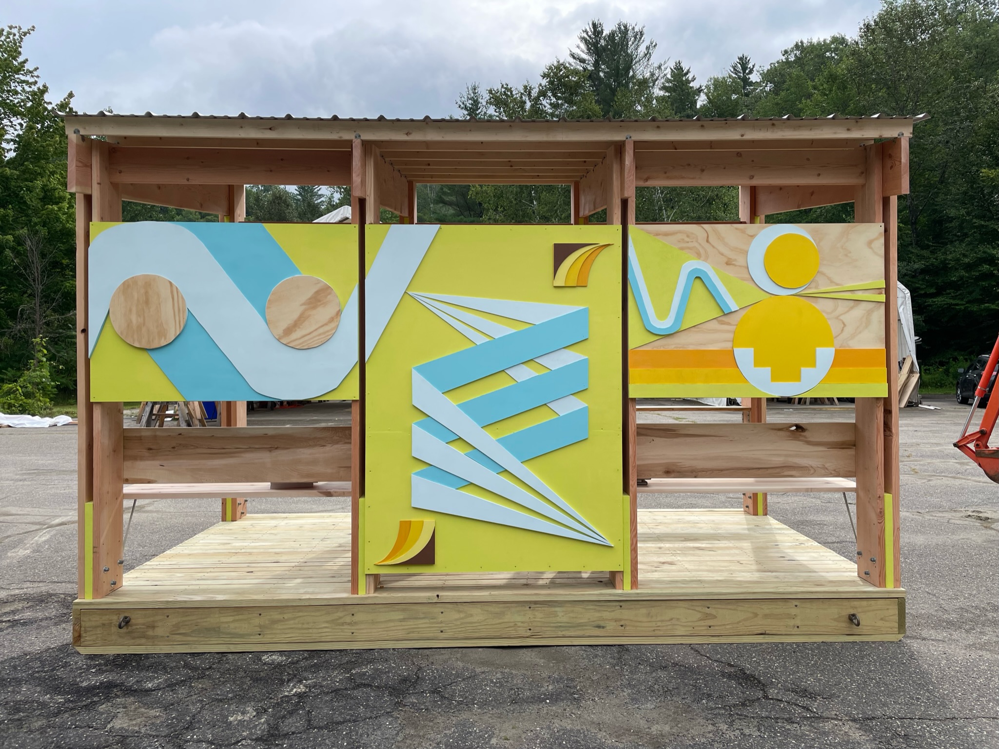 The concept: We began the design portion of this project in January 2022, with a charrette and design session with students. We researched precedents for other bus stops as well as the project brief from Vermont Transit Authority (VTA), which provided some physical constraints like dimensional maximums, accessibility requirements, and minor things like visibility of both feet and and an oncoming bus, show loads and roof pitches, etc. Our students proposed a variety of concepts, but one common idea came to the surface: we wanted our bus stop to be a hub for community, not just a bus stop. Inspired by the Little Free Library concept, we added in a central bookshelf and created paneled murals, designed by our Protest + Print instructor HyeYoon Song, to represent a graphic version of Vermont’s topography. To make the bus stop feel light but also grounded, we created a double-pillar system and added in local maple slabs for benches and a standing counter top. We also did all the engineering calculations for snow load and shear strength, leaving plenty of room for ADA-compliance and wheelchair accessibility.