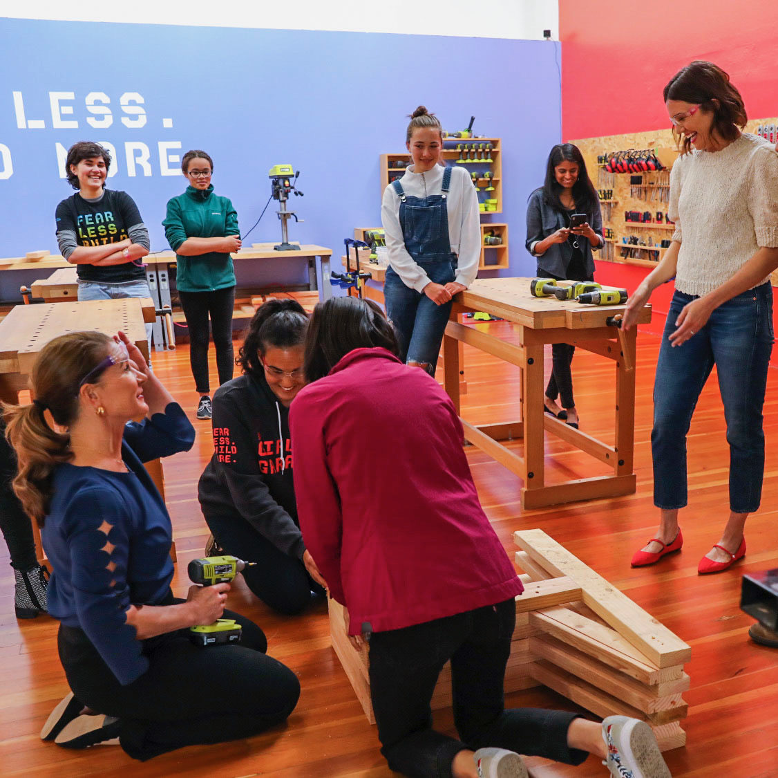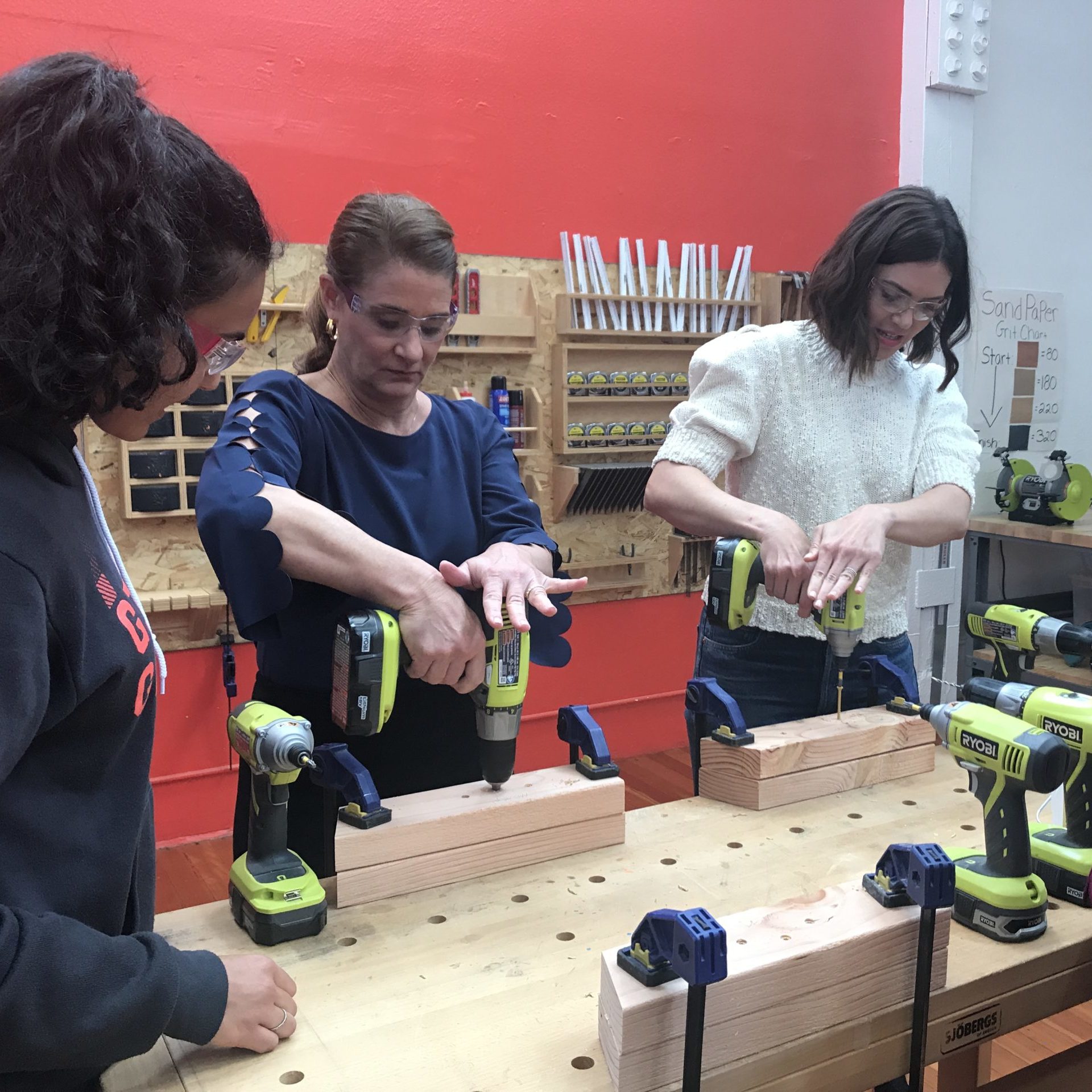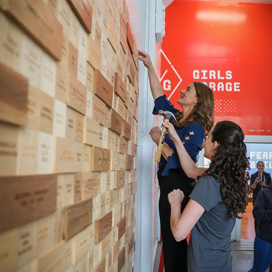 Four of our teen girls shared their carpentry expertise and taught Melinda and Mandy how to use a chop saw, drill, and driver. Both women fearlessly jumped right in, cutting and installing 2×4 pieces for our parklet bench project. During the time Melinda spent with us, she not only rocked the power tools, but spoke with our girls about careers in STEM, how to grapple with fear (and what âfear less, build moreâ means to her!), and why being vulnerable is so important as a female leader. She shared her own experience studying computer science and business, and how she embraced the collaborative and creative sides of STEM. Before Melinda and Mandy left, they put up their own laser-etched tiles on our community wall, amongst the names of hundreds of other girls and supporters from our community.