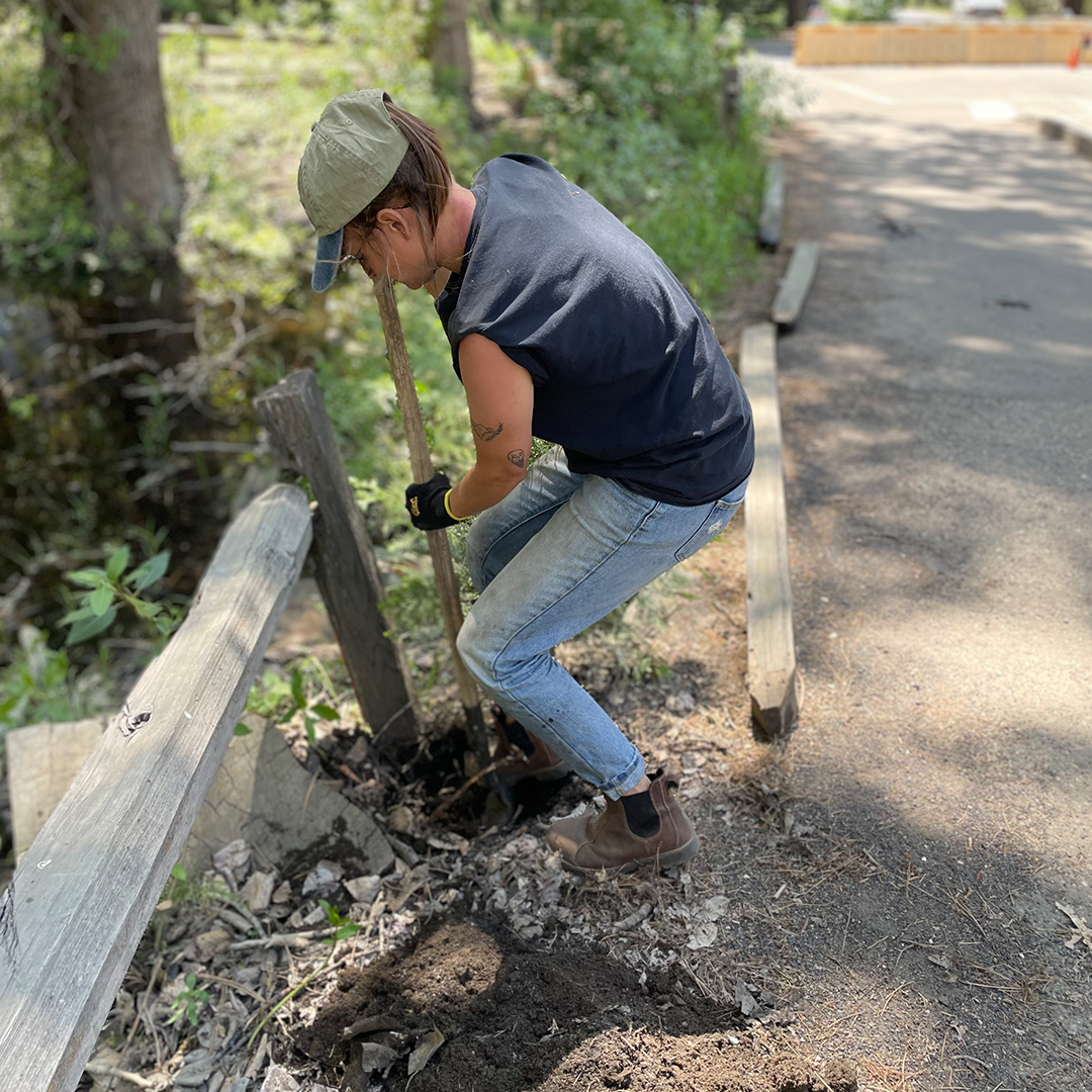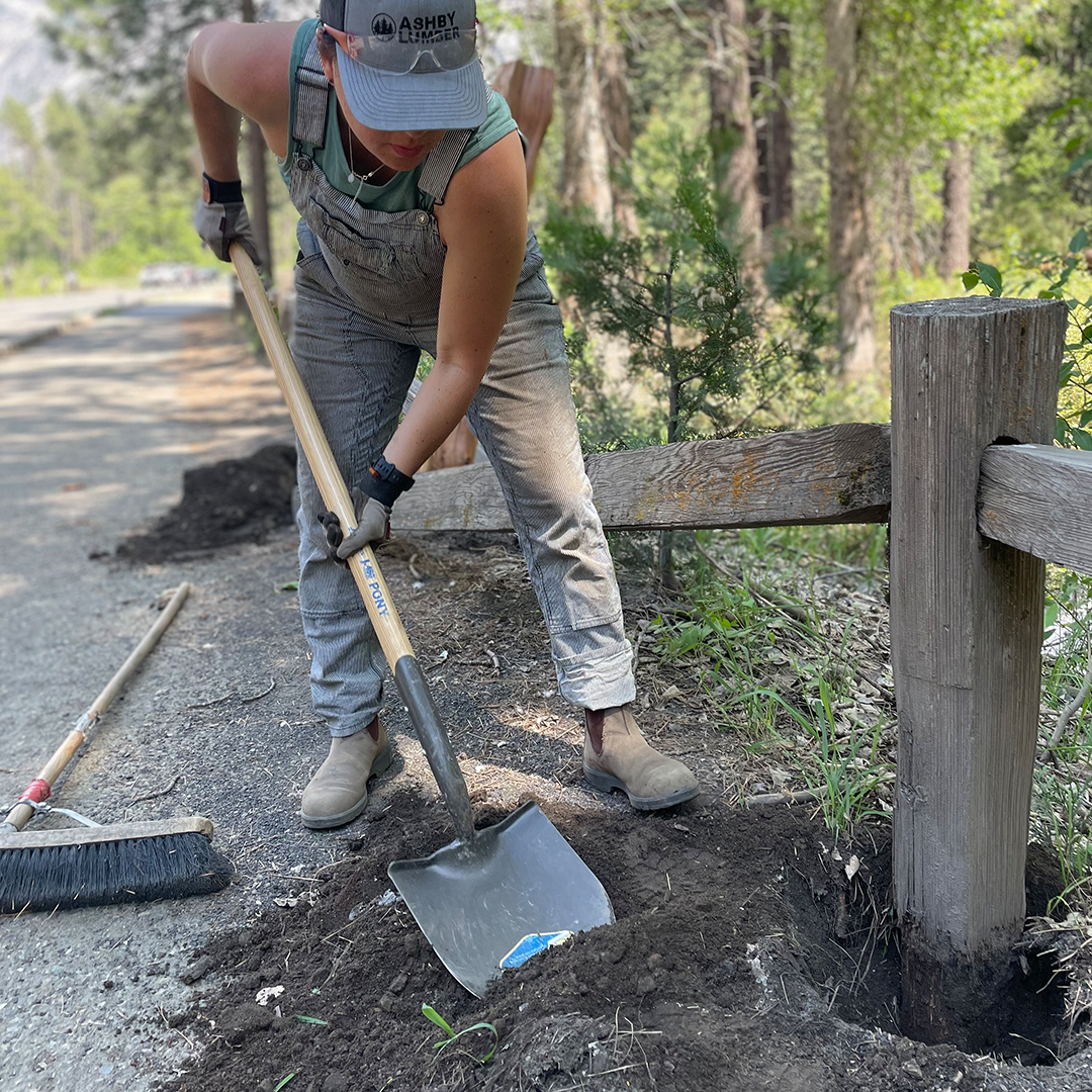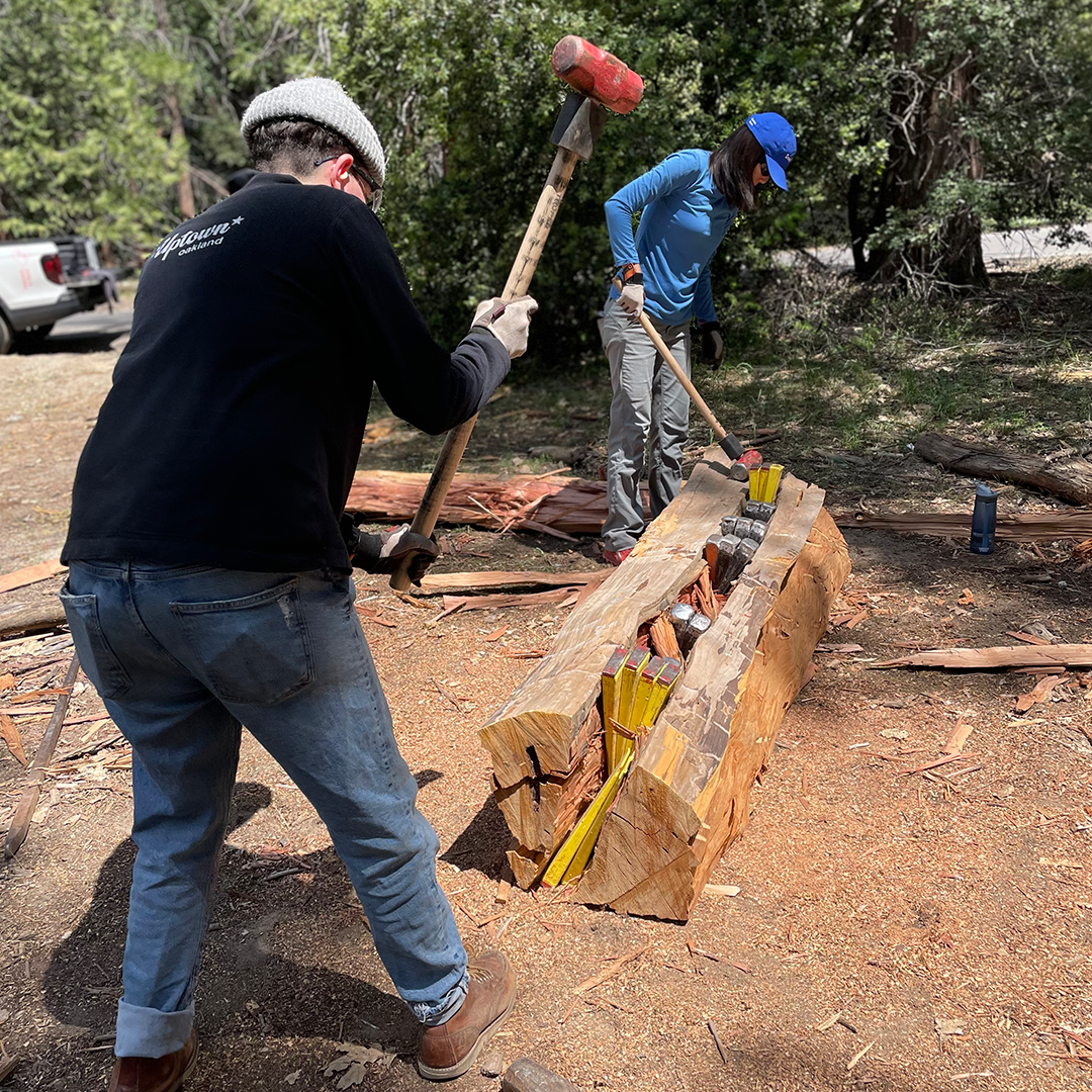 When you think of a “staff retreat,” what images do you conjure? Chances are, you don’t envision splitting logs with sledgehammers and digging holes for fence posts…but that’s exactly what our Girls Garage Yosemite retreat entailed, and we loved every minute of it! We were delighted and honored to be invited back to Yosemite for a third time to volunteer with infrastructure projects (the first being rebuilding the timber fences in Wawona, the second repairing the roof of a ranger’s cabin). For two days, we worked with a frontcountry trail crew in Yosemite Valley. On the first day, we used sledgehammers and metal wedges to split large logs of felled California incense-cedar into posts and rails for fences.