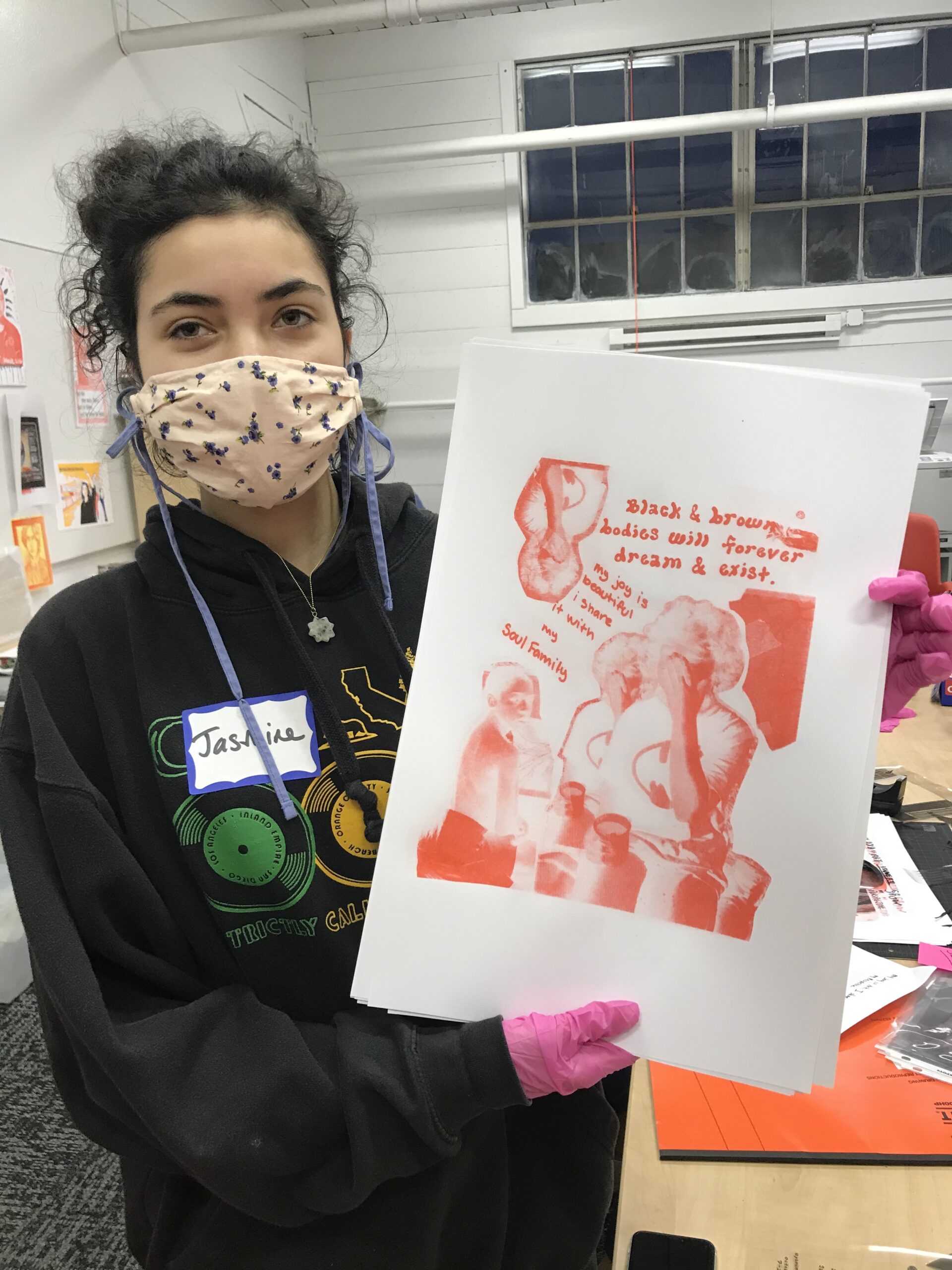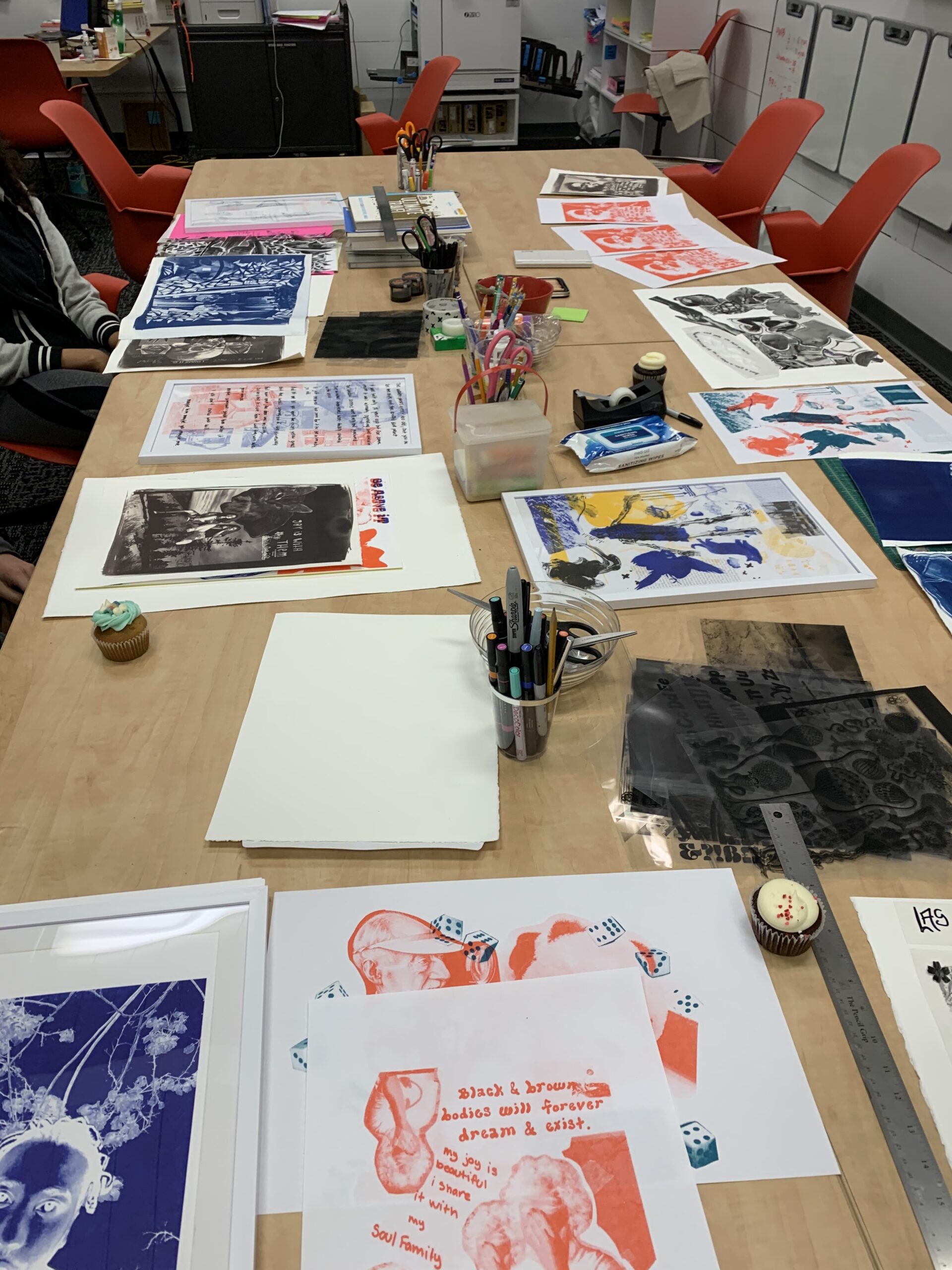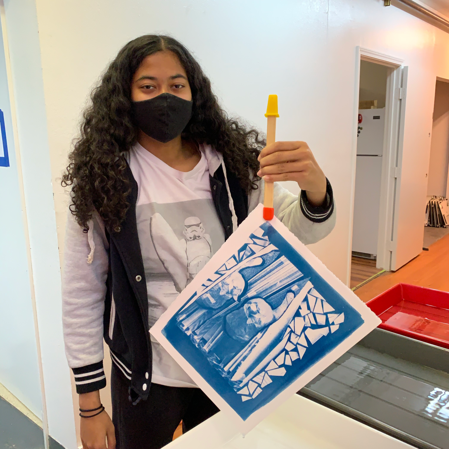On Tuesdays, a group of 5 girls convened in our upstairs art studio for Advanced Print Shop, our newest class! Taught by Arts Program Leader Yétundé Olagbaju, the class centered around the deep belief that self-definition is an act of protest for marginalized voices. Through experimenting with different artistic mediums (risograph, cyanotype printing, Van Dyke printing, and creative writing), students produced multiple visual pieces. The class will meet again in spring session to curate and create a hand-bound book.
